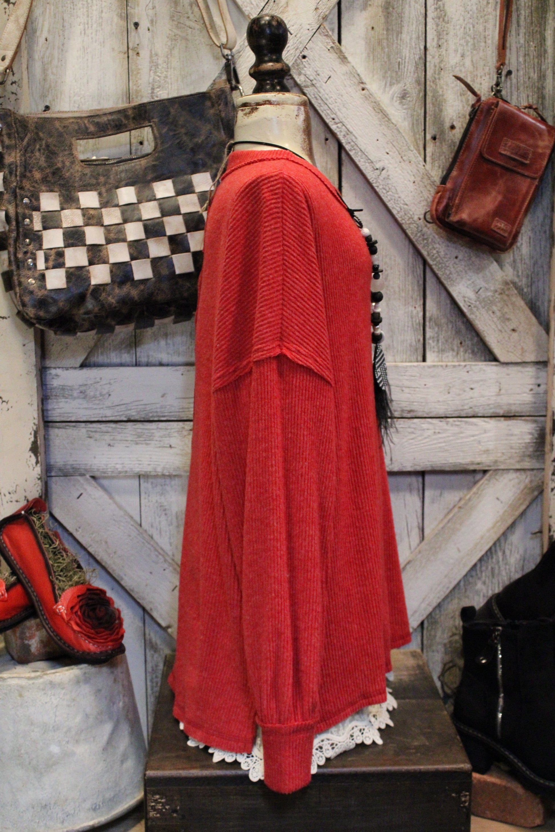 The deep red hue adds a festive pop of color that’s perfect for fall through the holidays, and the slightly longer length makes it ideal for layering over lace trims or pairing with jeans and boots.