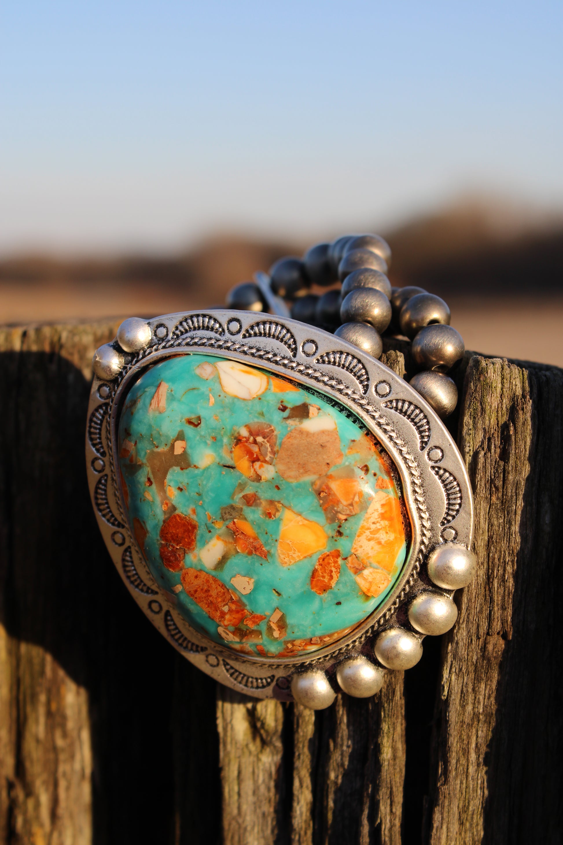 This western statement bracelet pairs beautifully with denim, graphic tees, and layered silver for that true Farm Girl boho-cowgirl finish.