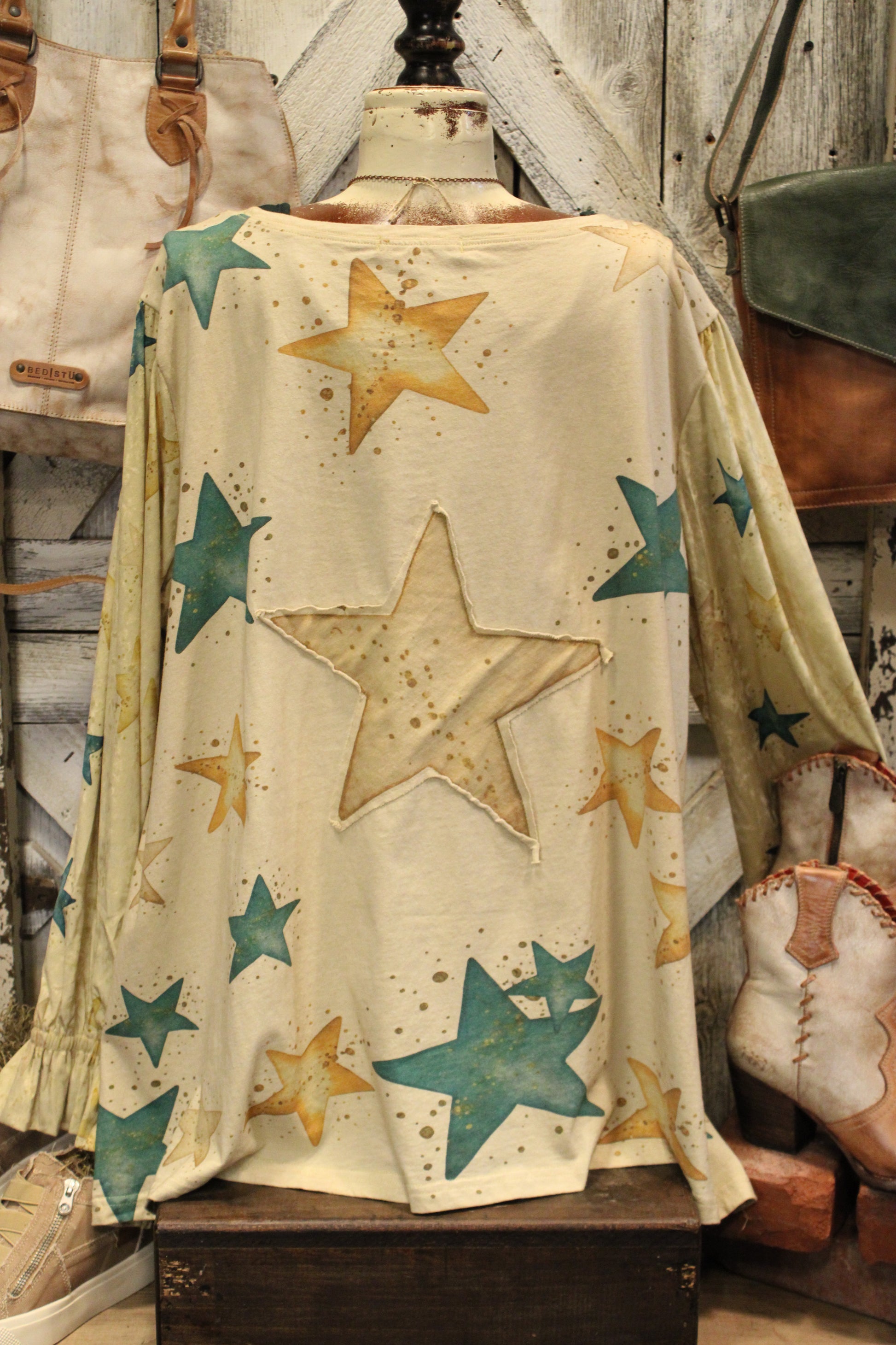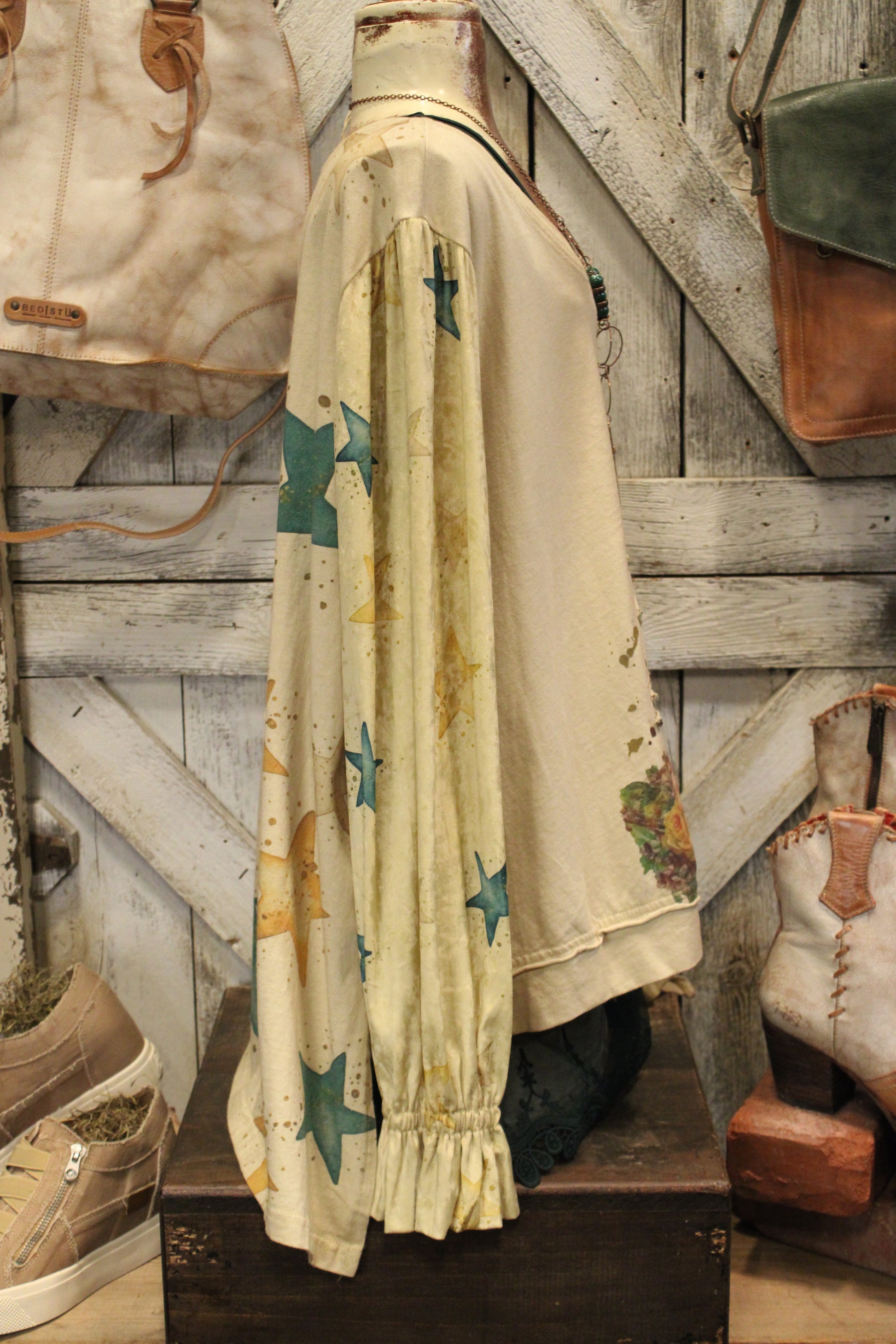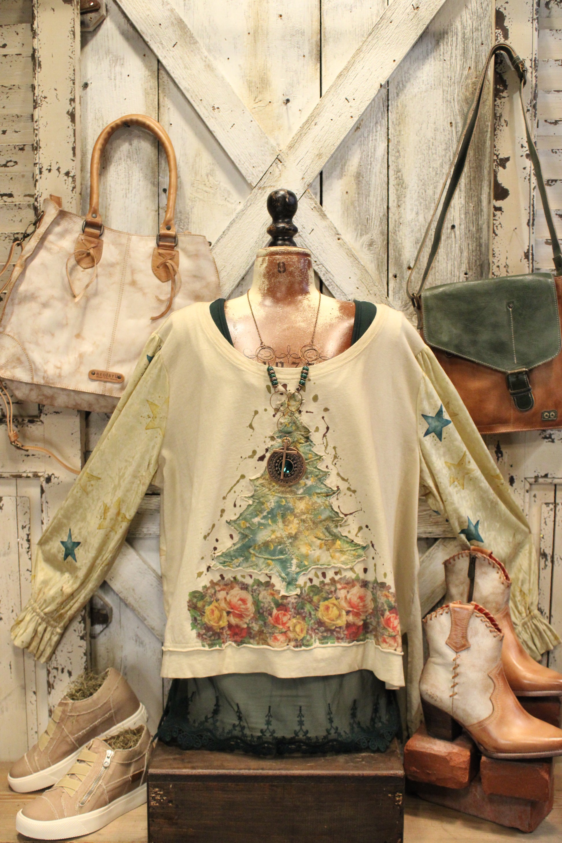 Introducing the Rosie Christmas Long Sleeve Top- Bring a touch of magic to the season with this one-of-a-kind Holiday Tree Top. Featuring a beautifully painted Christmas tree accented with golden details and surrounded by a garden of roses, this top is festive with an artistic, vintage flair. The soft cream body is paired with velvety star-patterned sleeves, giving it a cozy yet whimsical vibe perfect for holiday gatherings or casual winter days.