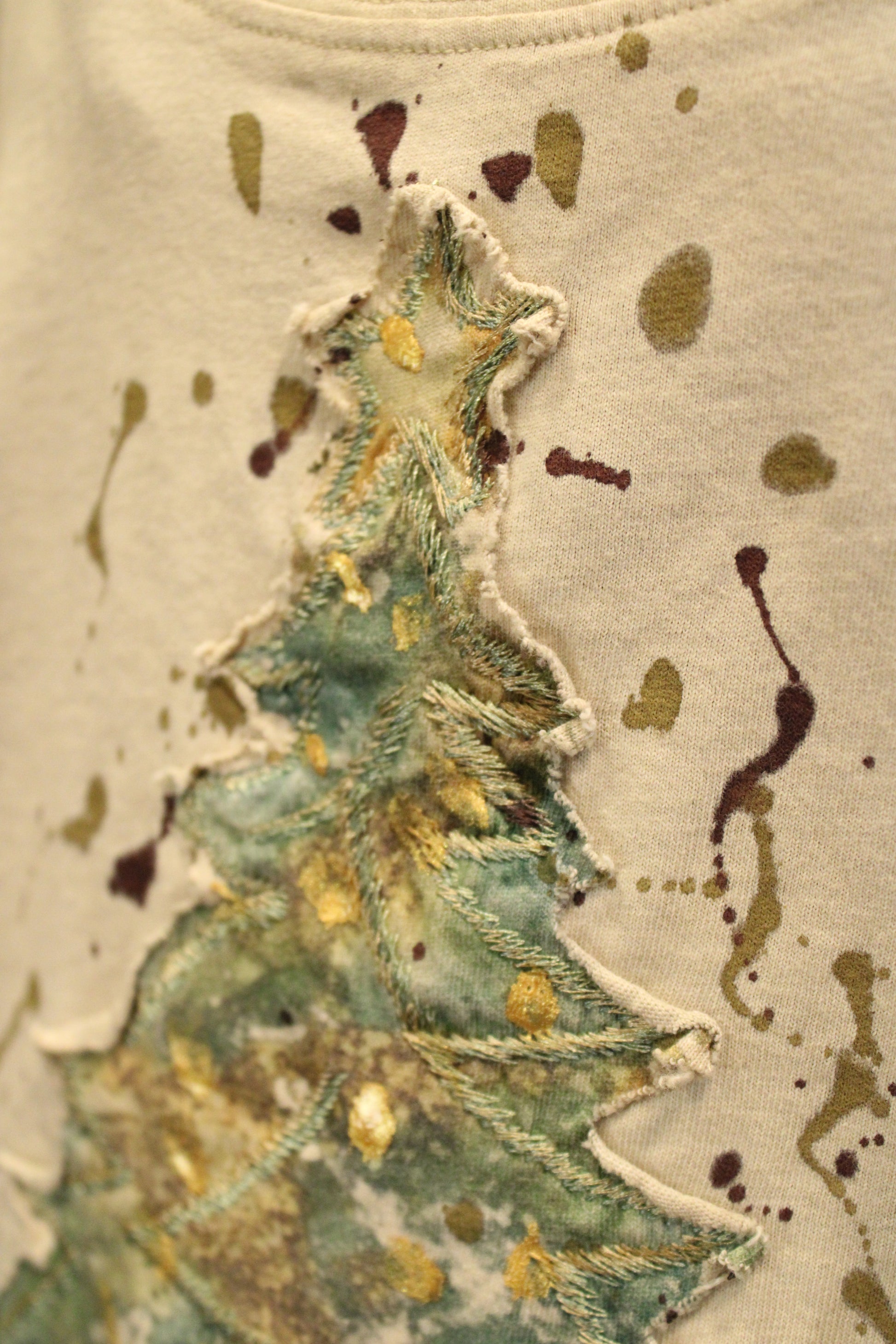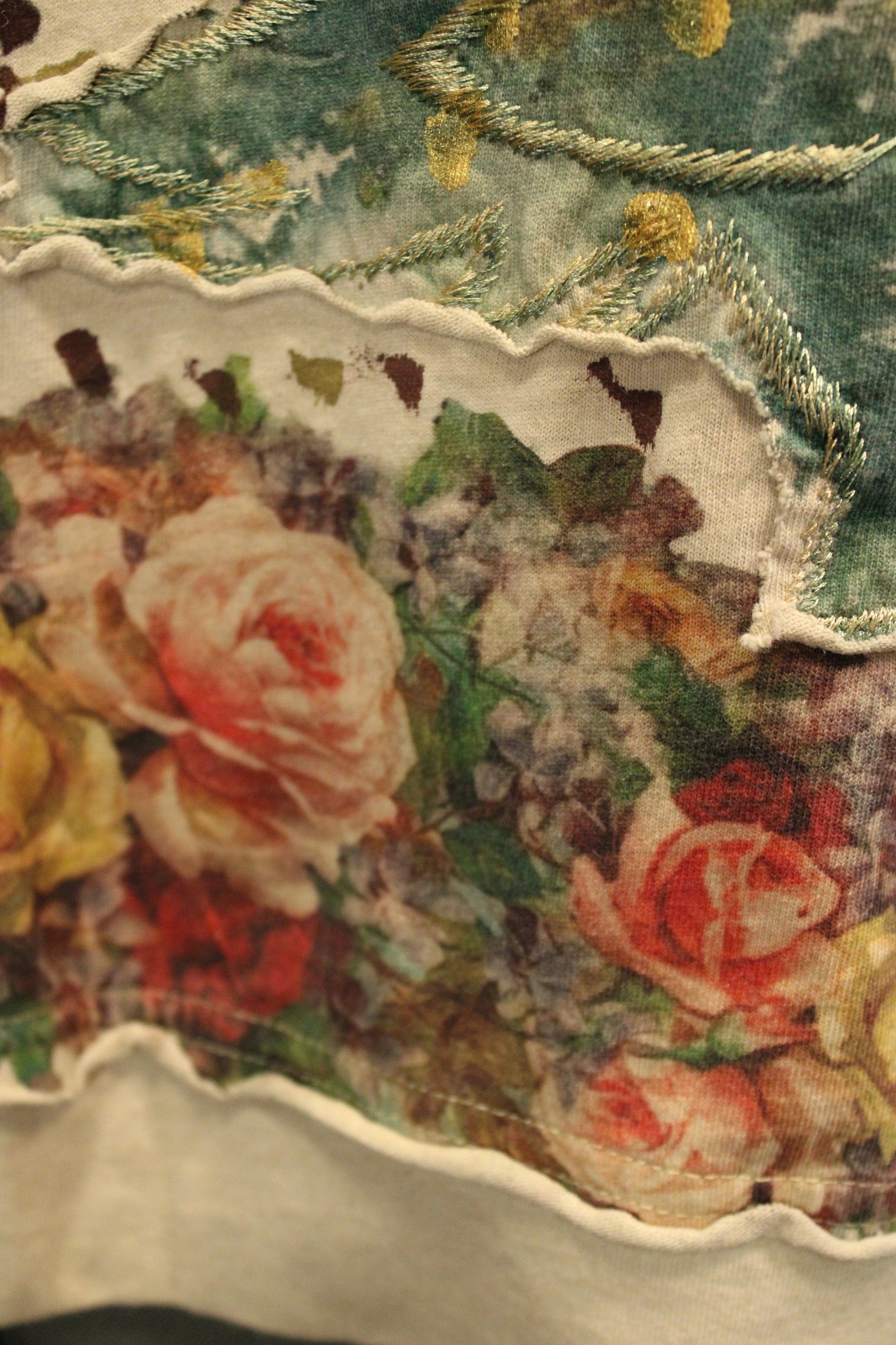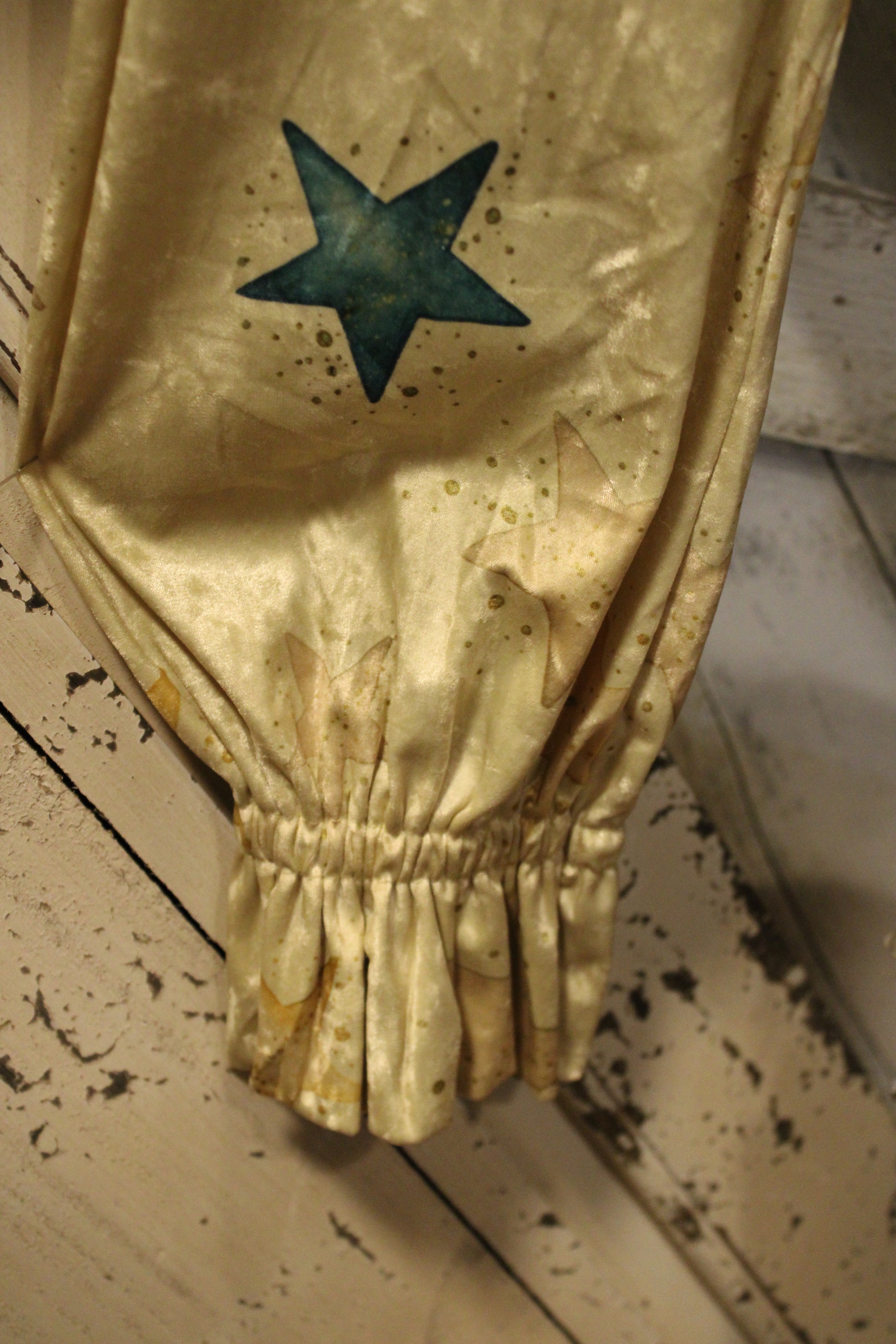 Introducing the Rosie Christmas Long Sleeve Top- Bring a touch of magic to the season with this one-of-a-kind Holiday Tree Top. Featuring a beautifully painted Christmas tree accented with golden details and surrounded by a garden of roses, this top is festive with an artistic, vintage flair. The soft cream body is paired with velvety star-patterned sleeves, giving it a cozy yet whimsical vibe perfect for holiday gatherings or casual winter days.