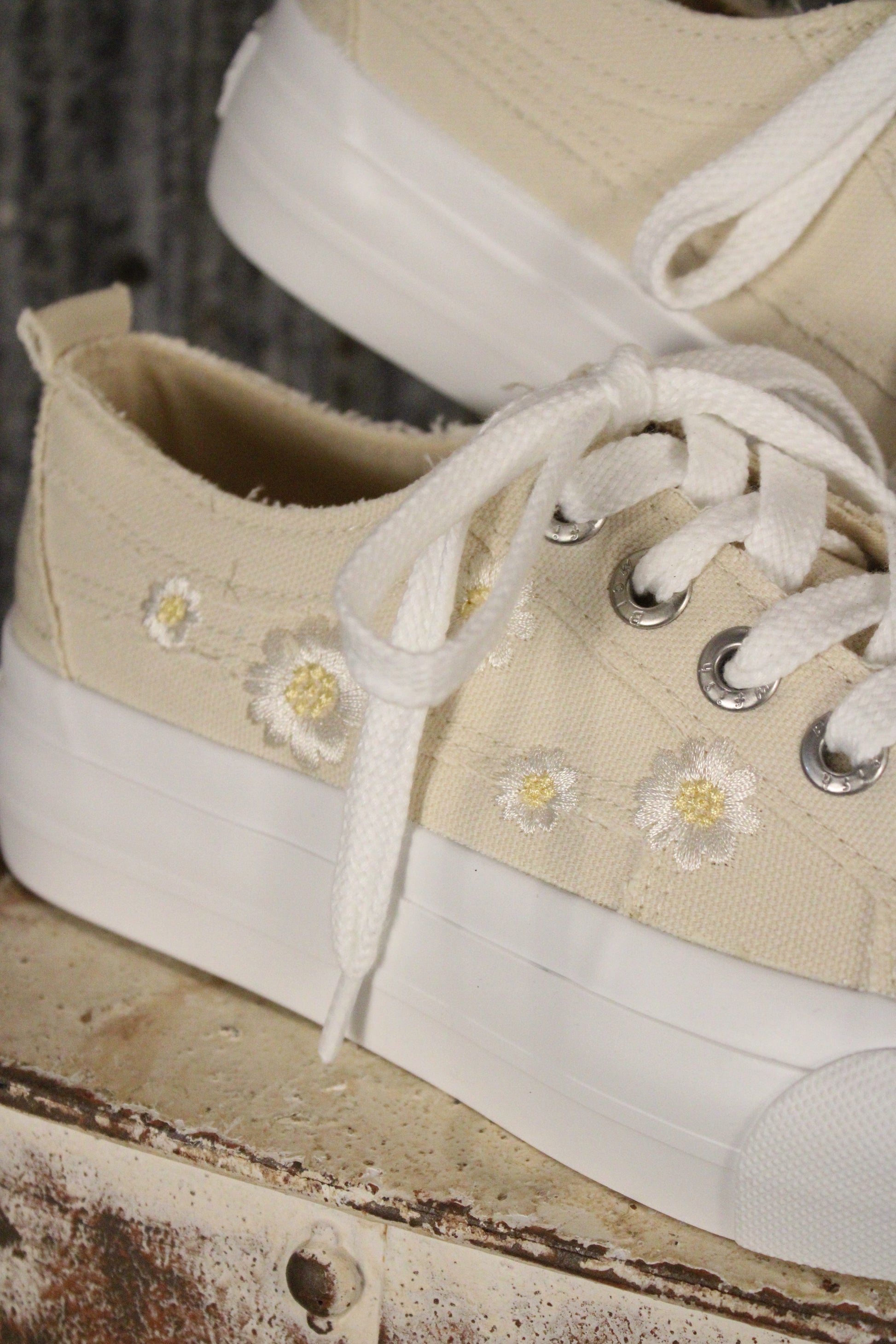 Introducing the Sadie Sun 8 Embroidered White Desert, These cream floral sneakers bring sweet detail and everyday comfort together in one adorable pair. Designed with delicate daisy embroidery and a cushioned platform sole, they add a soft, feminine touch while keeping your look casual and easy. The lace-up style offers a secure fit, making them perfect for all-day wear.