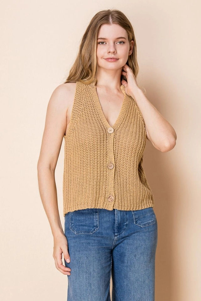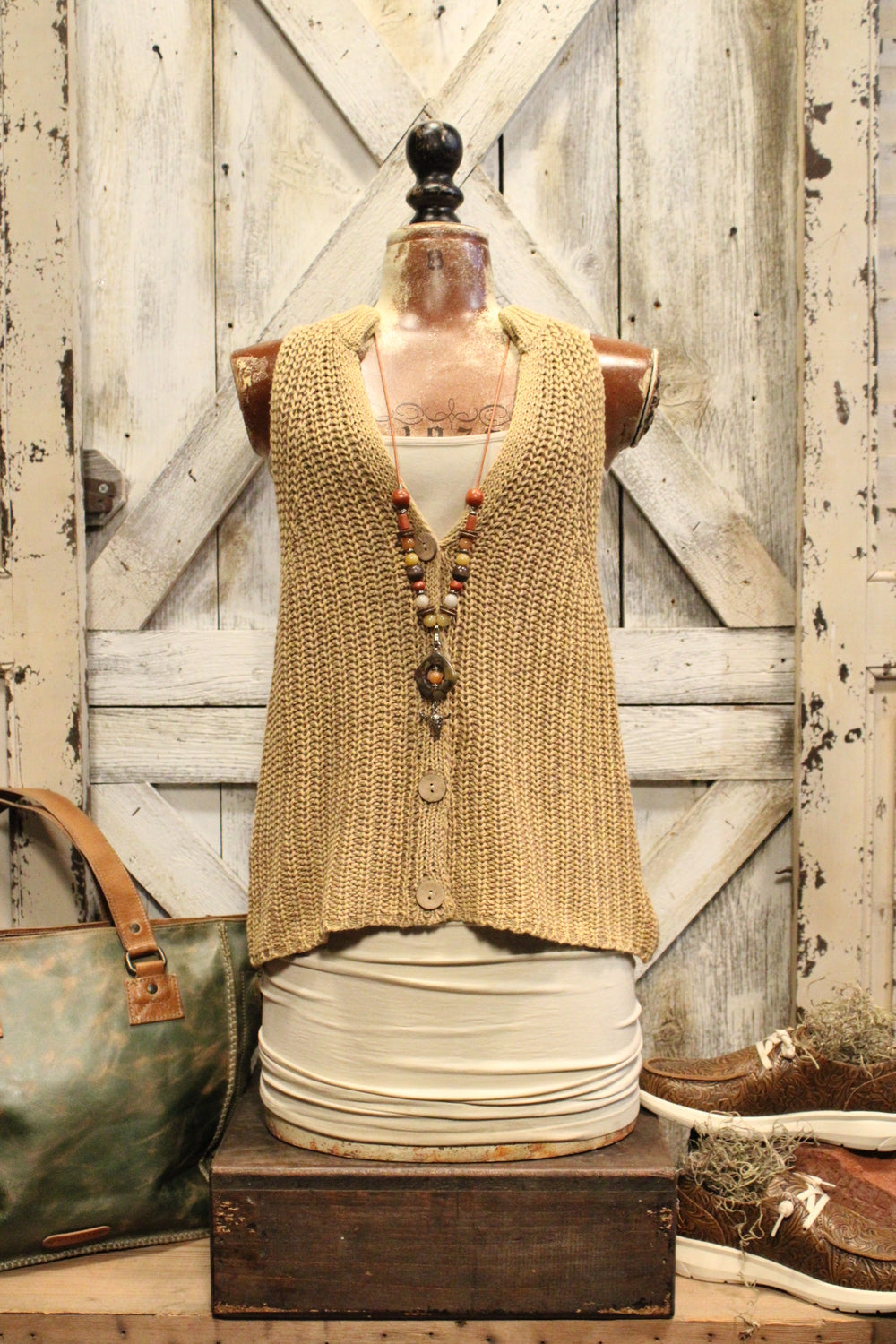 Introducing the Sassafras Lane Vest- This sleeveless vest features a cozy yet breathable open-knit design, perfect for layering or wearing on its own. The relaxed fit and deep V-neckline offer a laid-back, effortlessly chic look, while the front button closure adds a touch of vintage charm. It pairs beautifully with high-waisted jeans, skirts, or even over a dress for a trendy layered style. Whether you're heading out for brunch or enjoying a weekend getaway, this vest brings both comfort and style to your outfit.