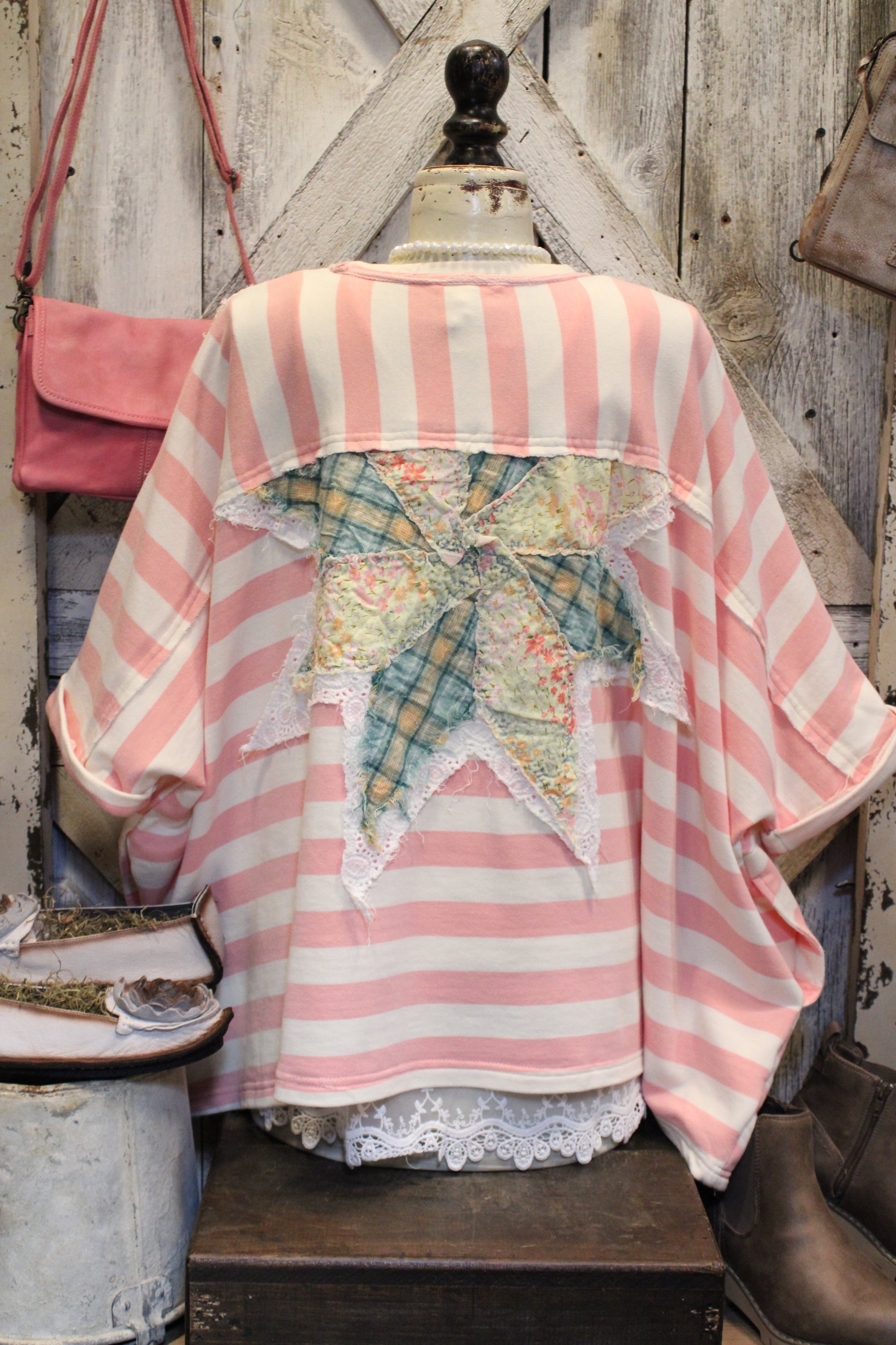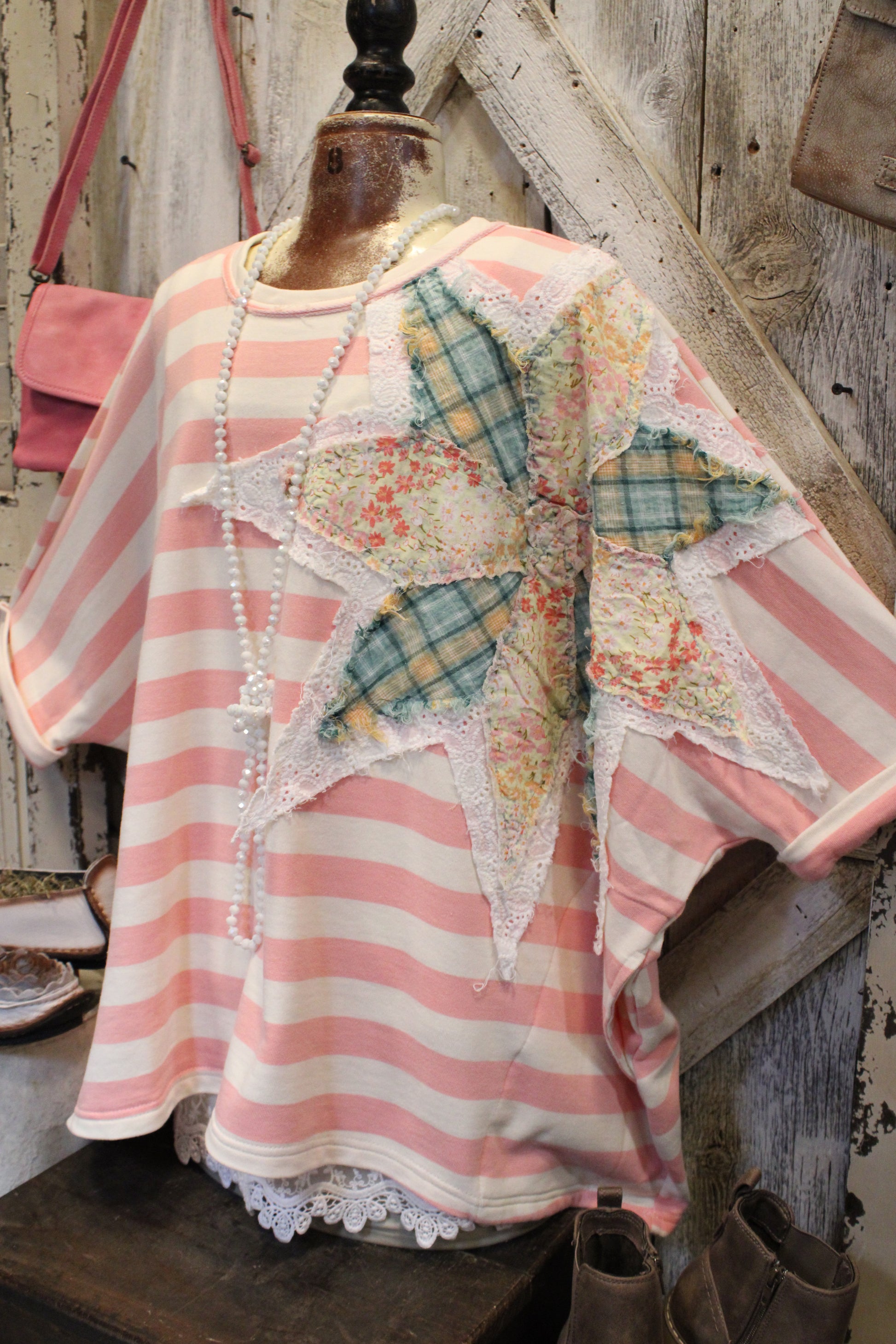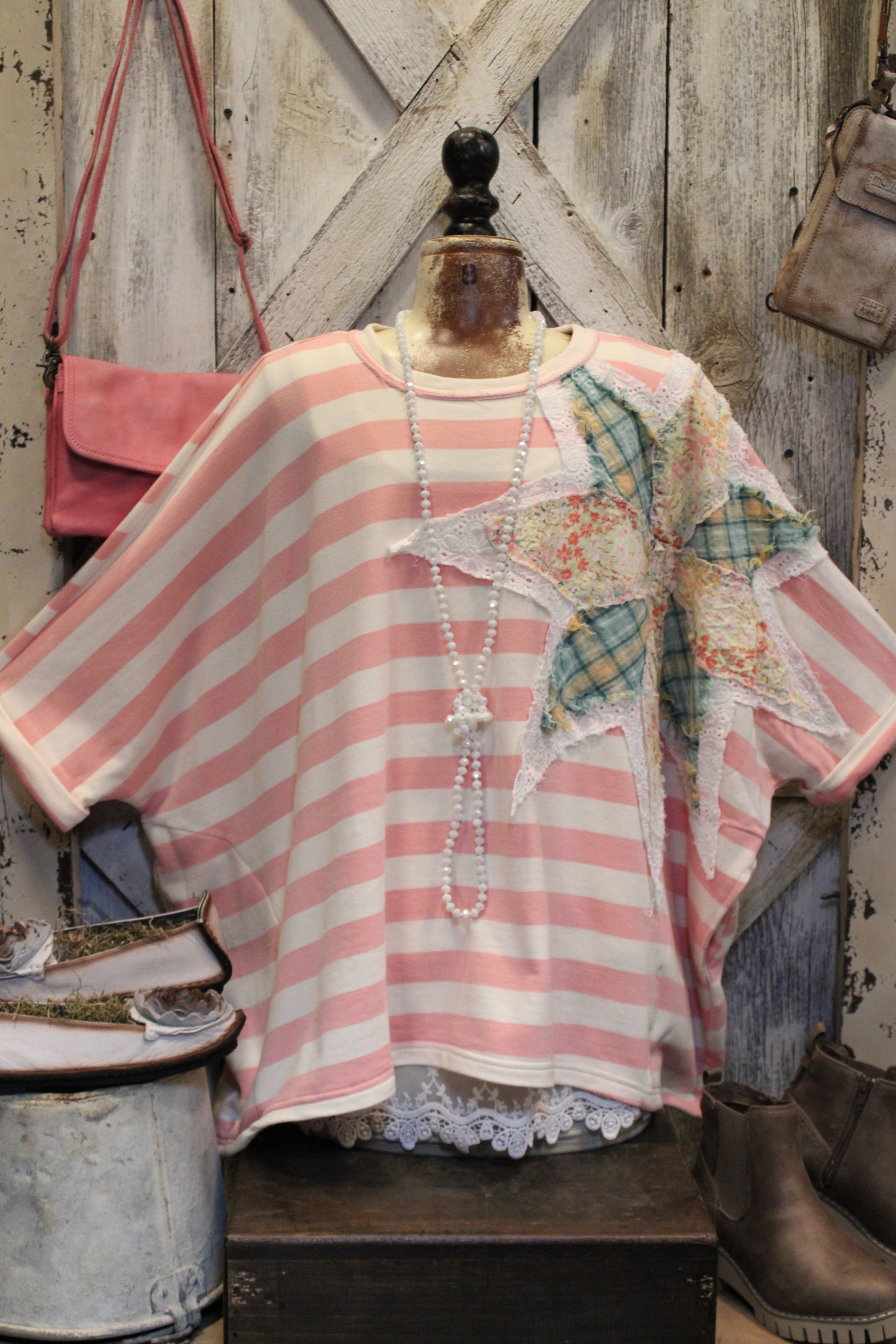 Introducing the Shooting Star Casual- This soft pink-and-cream striped top is a farmhouse dream come true! The oversized fit keeps things comfy and relaxed, while the quilt-inspired patchwork star detail adds that perfect Farm Girls Fancy Frills touch. Each patch is uniquely patterned with plaid and floral prints, edged in dainty lace — giving this piece that handmade, heart-stitched feel we all adore.