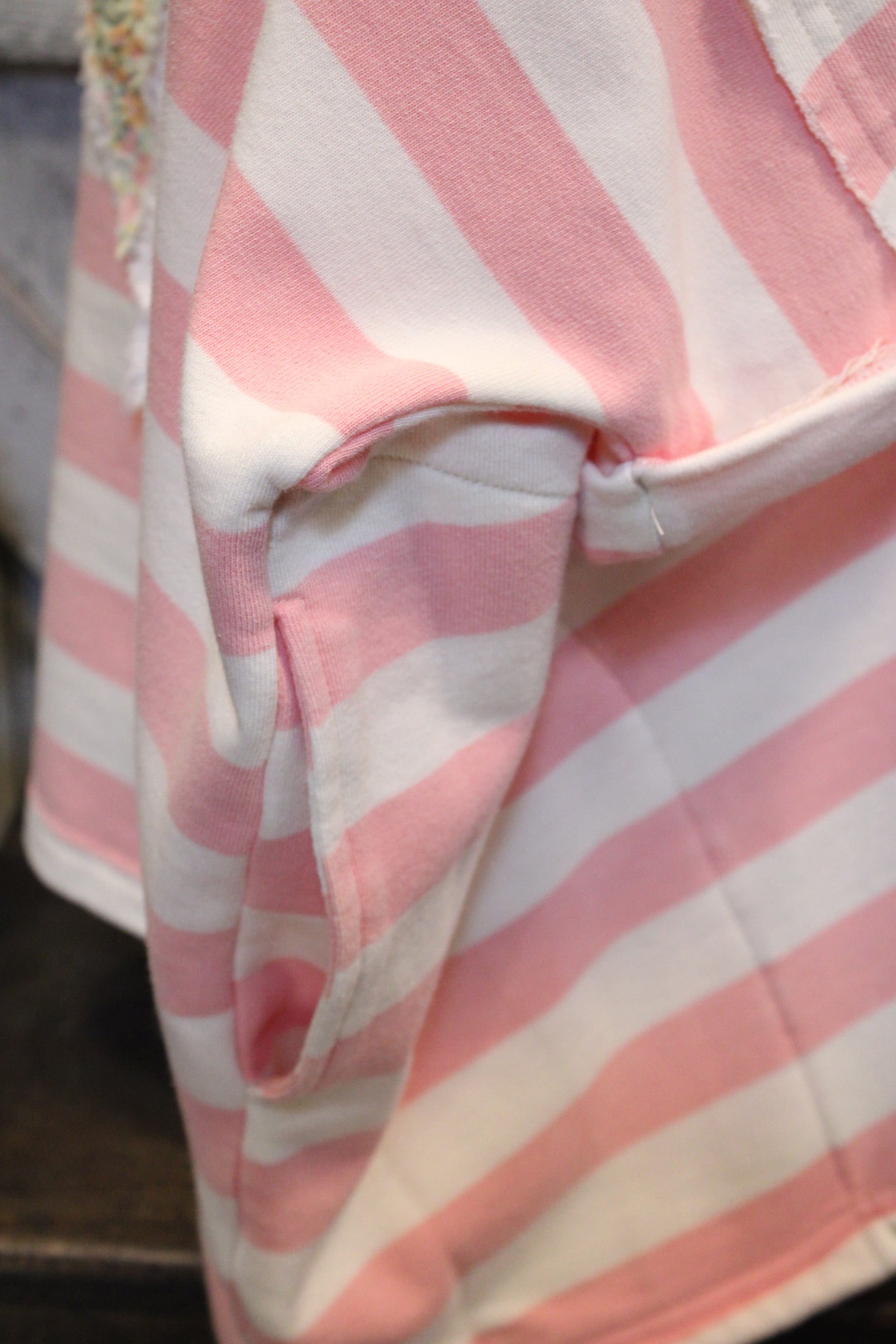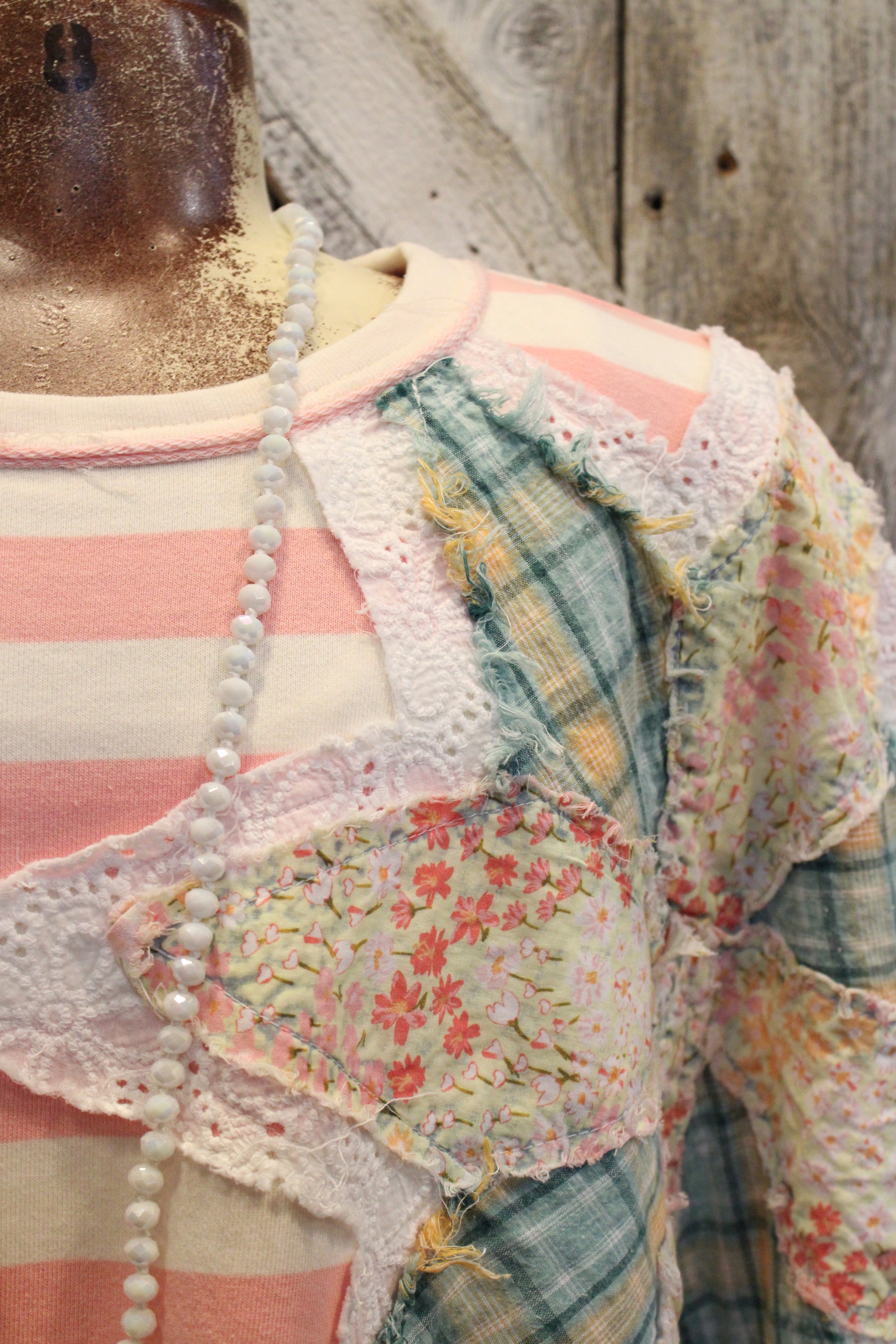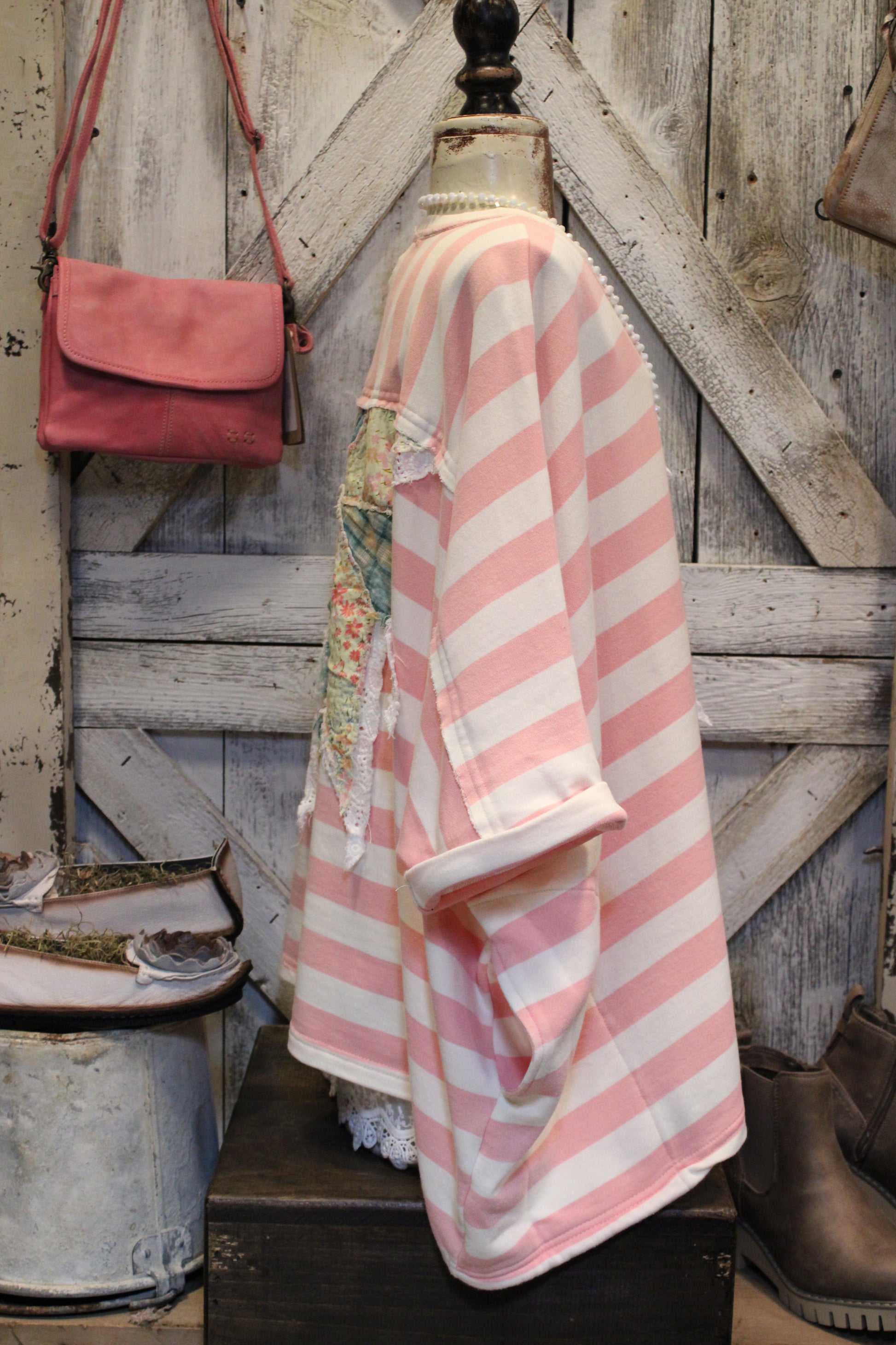 Introducing the Shooting Star Casual- This soft pink-and-cream striped top is a farmhouse dream come true! The oversized fit keeps things comfy and relaxed, while the quilt-inspired patchwork star detail adds that perfect Farm Girls Fancy Frills touch. Each patch is uniquely patterned with plaid and floral prints, edged in dainty lace — giving this piece that handmade, heart-stitched feel we all adore.
