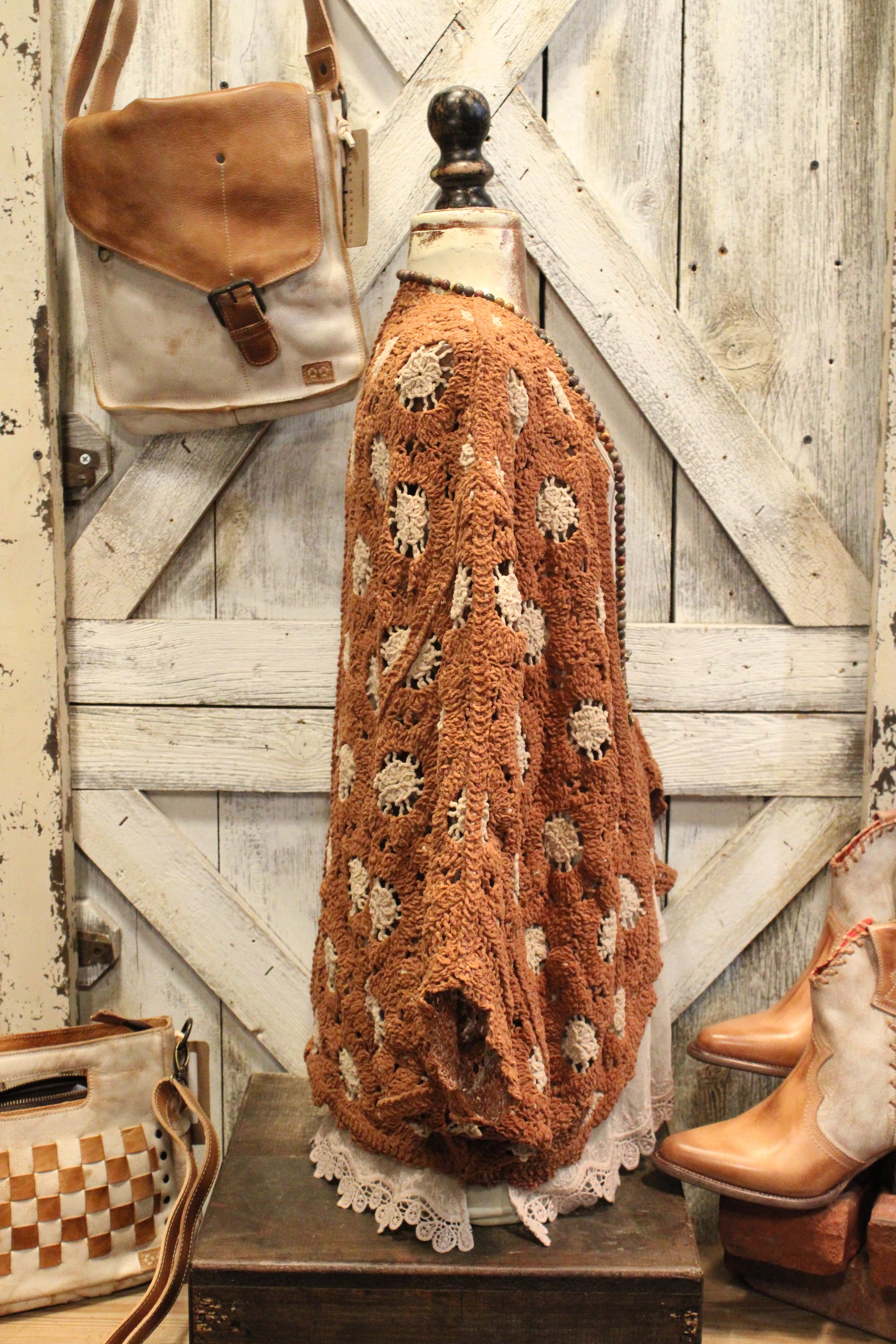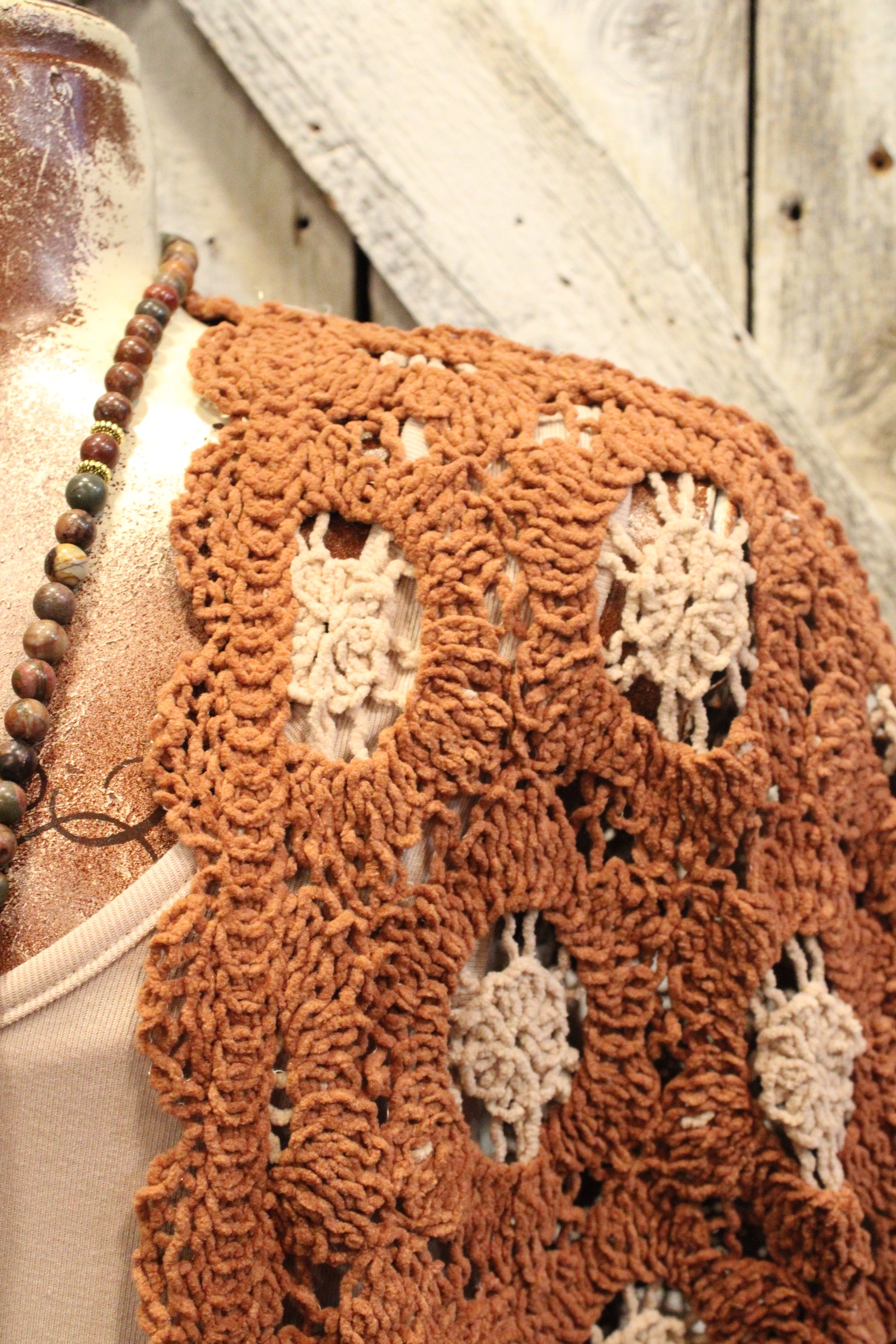 Introducing the Simply Fabulous Cardigan-This open-front cardigan is all about charm and comfort, featuring a warm rust hue with cream crochet sunburst accents that give it that perfectly farmhouse-fancy vibe. The scalloped edges and roomy sleeves make it easy to layer over your favorite tank, tee, or dress—whether you’re headed to the farmer’s market, the pumpkin patch, or just curling up with a cup of coffee on the porch.