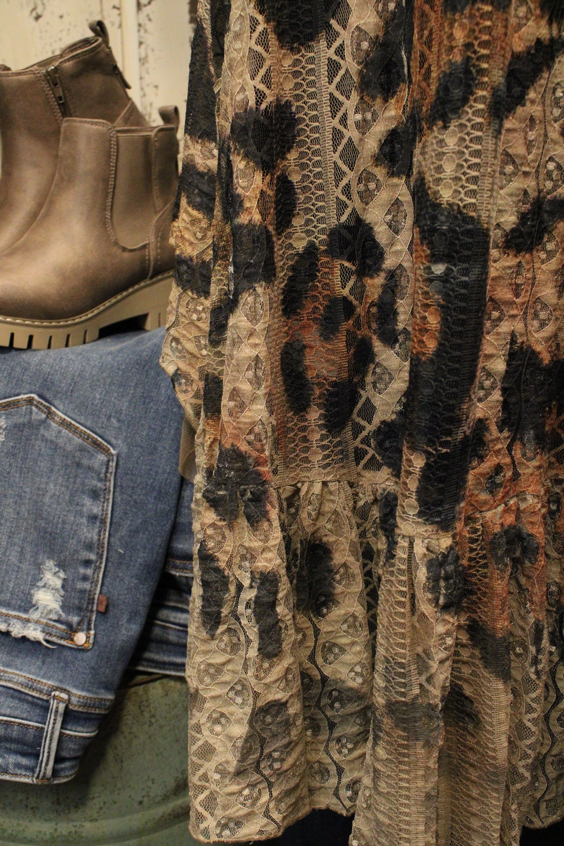 Introducing the Spotted Spur Vest - Meet the vest that brings all the dreamy layers and a touch of sass! This gorgeous piece pairs soft neutral lace with a subtle leopard print for the perfect blend of feminine + wild. Finished with flowy mesh panels and scalloped lace trim, it adds instant texture and movement to any outfit. Throw it over a simple tee or a dress and watch your whole look come to life!