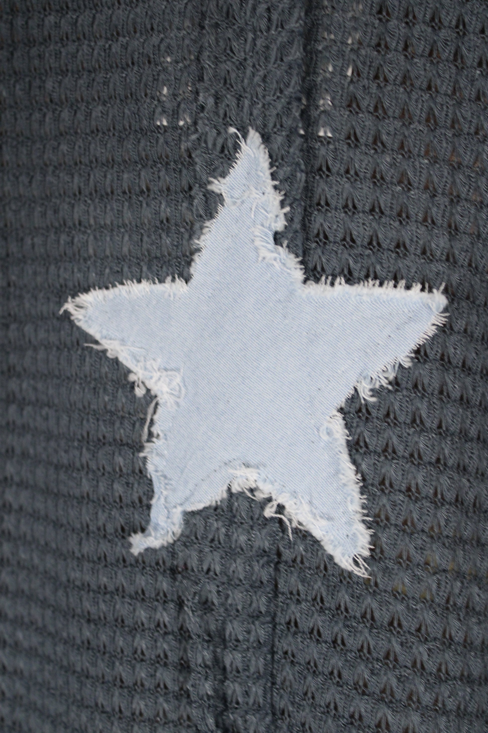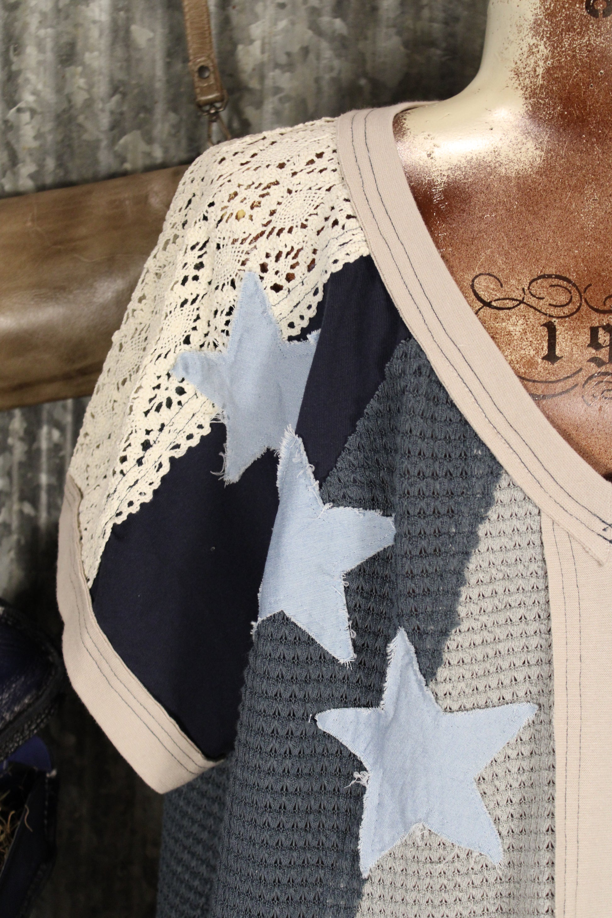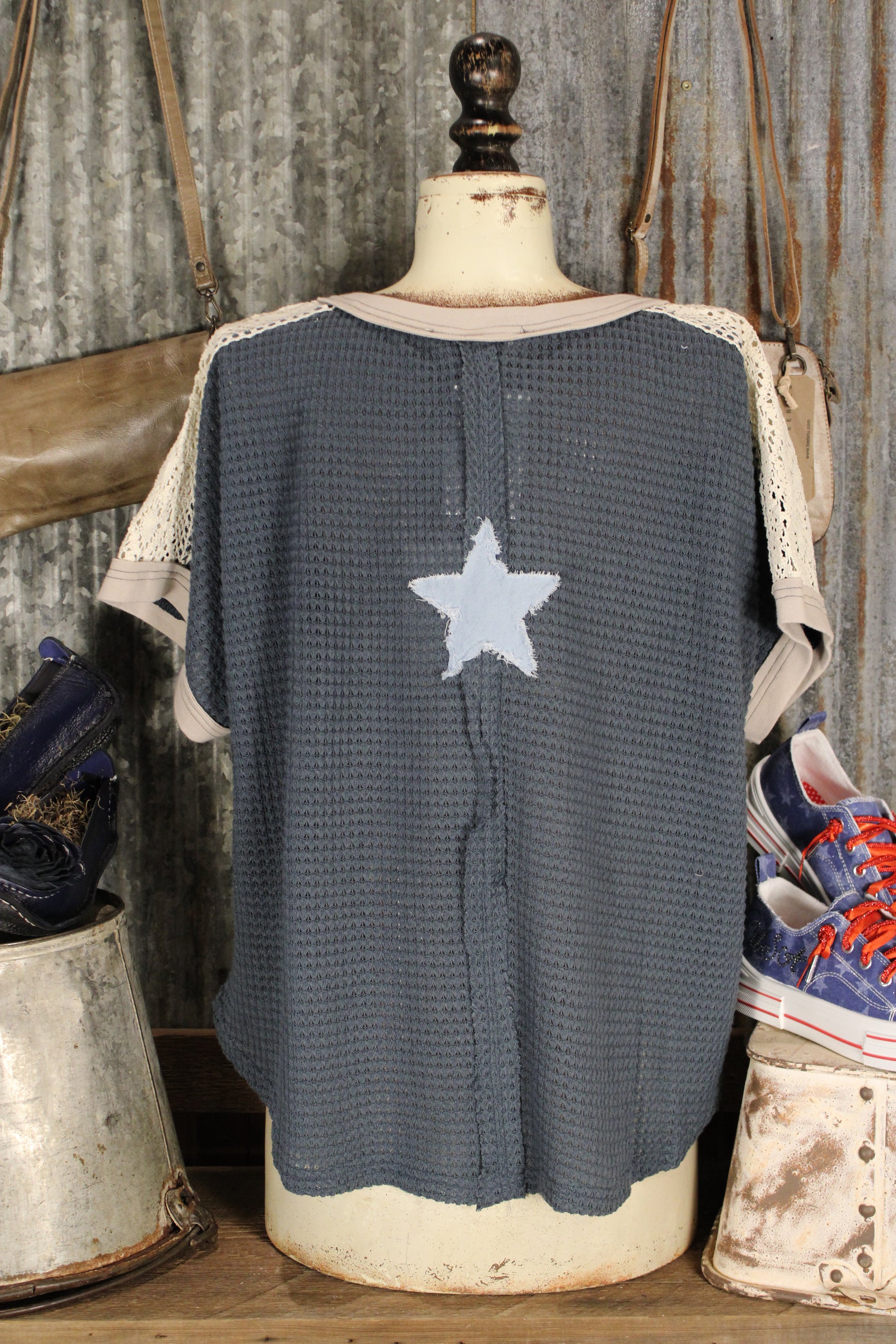 Introducing the Starfall Blue Lace Top- This mixed-media star patch top brings playful texture and standout detail to your everyday wardrobe. Designed with a soft waffle knit body, lace shoulder panels, and bold star appliqués across the front and back, it adds eye-catching charm from every angle. The relaxed silhouette, v-neckline, and lightweight feel make it easy to wear tucked, loose, or layered for year-round styling. A fun statement piece that pairs effortlessly with denim, patchwork pants, or your favorite casual bottoms.