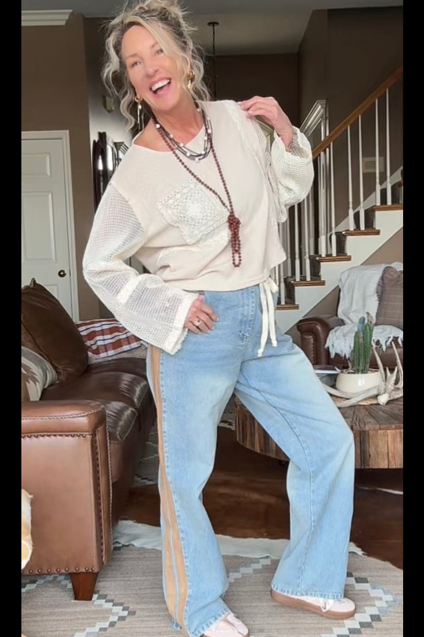 Introducing the Sundown Side Stripe Jeans - Stylish, comfortable, and full of western-inspired detail, these two-tone wide leg jeans are a standout addition to any wardrobe. Designed with a light wash denim base, they feature soft tan contrast panels along the sides and matching tan back pockets for a unique, eye-catching look.