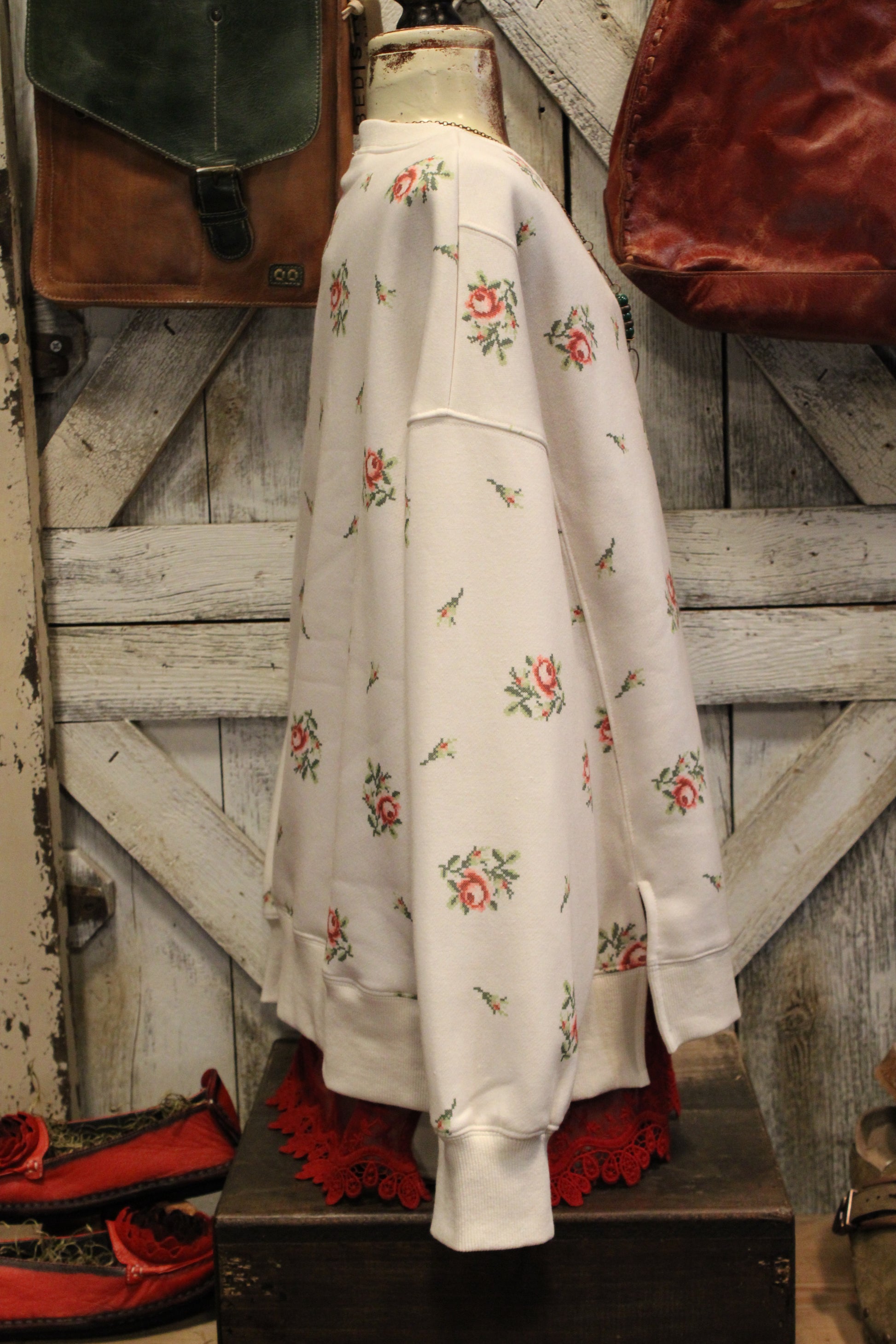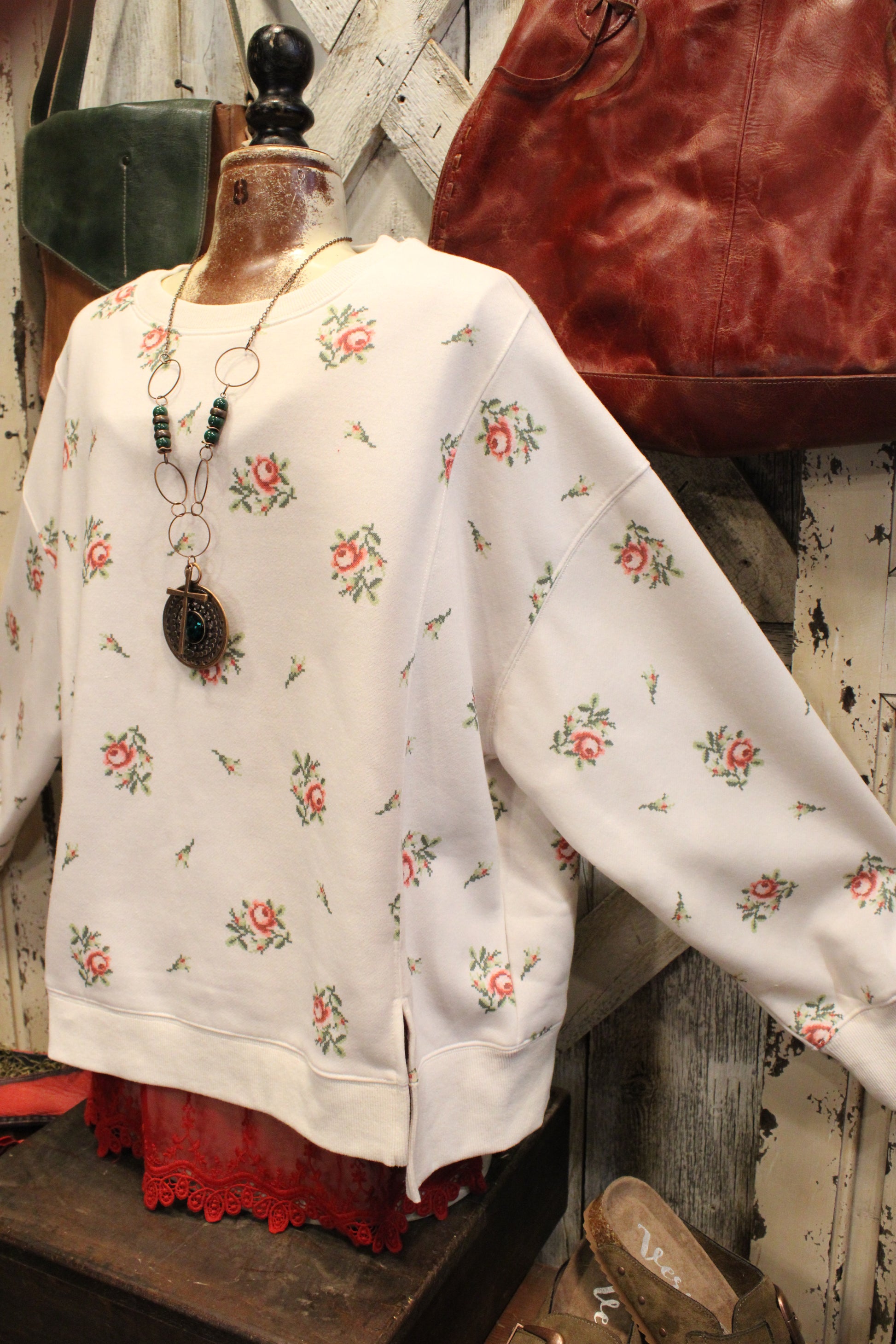 Designed in a creamy ivory knit with petite rosebud prints throughout, this relaxed pullover pairs comfort with timeless charm. The drop-shoulder fit and soft fleece-like interior make it perfect for slow mornings, coffee runs, or curling up at home in style.