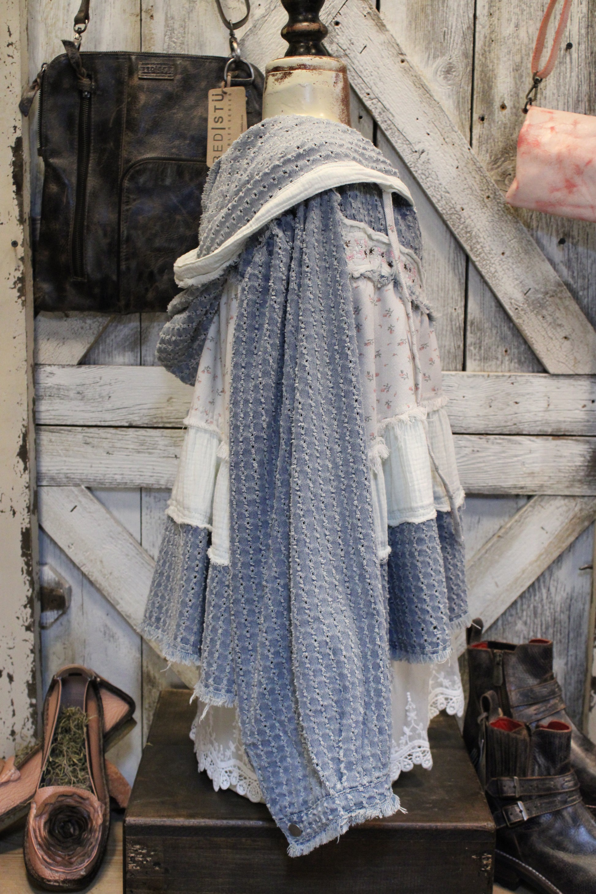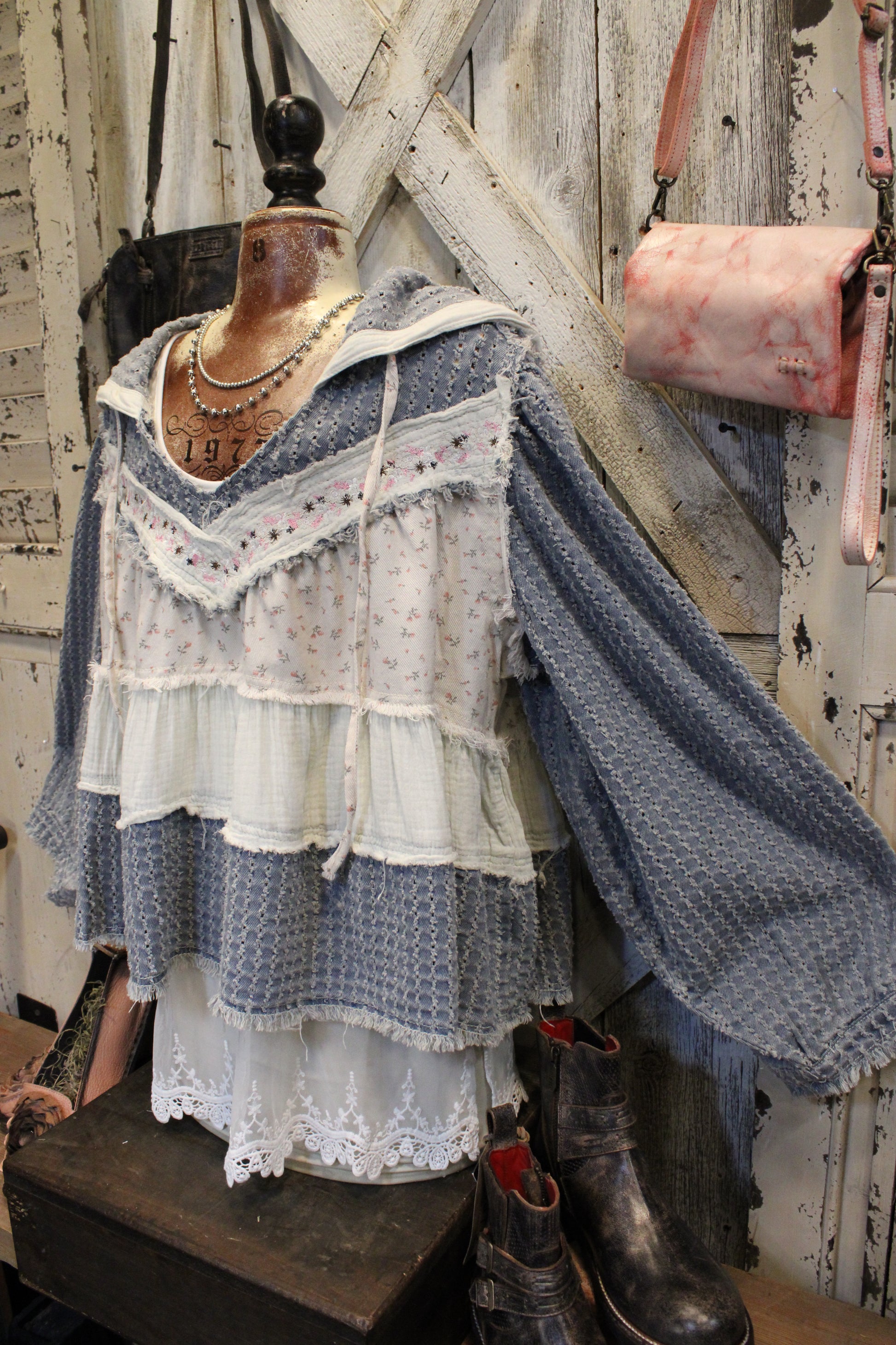Introducing the Sweet in Denim and Floral Sweatshirt- Bring effortless bohemian charm to your wardrobe with this beautiful patchwork top. Designed with textured blue woven sleeves, soft gauzy tiers, and delicate floral accents, it blends vintage inspiration with modern boutique style.