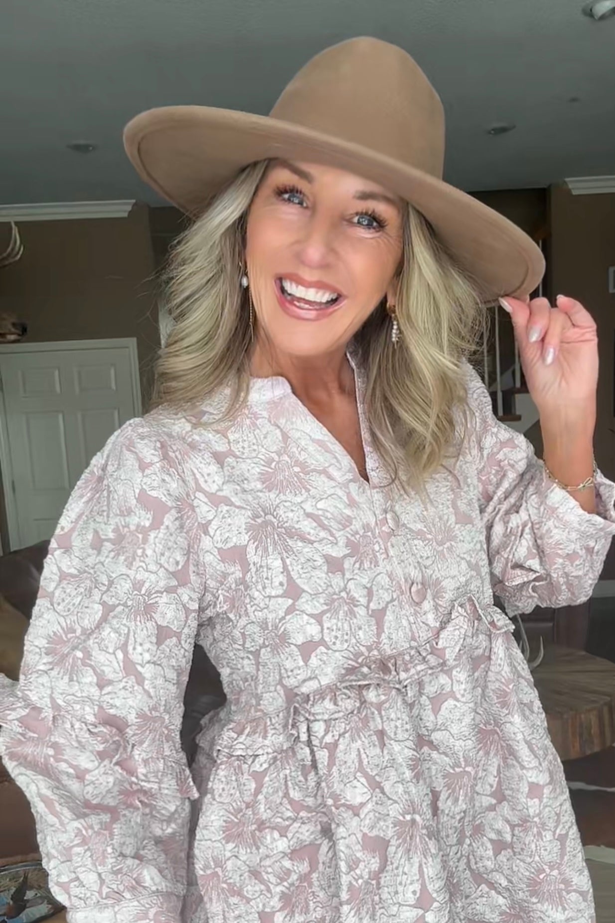 The relaxed, flowy fit offers comfortable wear while still feeling polished, and the above-the-knee length pairs beautifully with boots, heels, or sandals depending on the season. Whether you’re heading to brunch, a baby shower, church, or a casual date night, this blush floral dress fits right in. Style it with layered jewelry and your favorite footwear for a look that feels feminine, charming, and effortlessly put together.