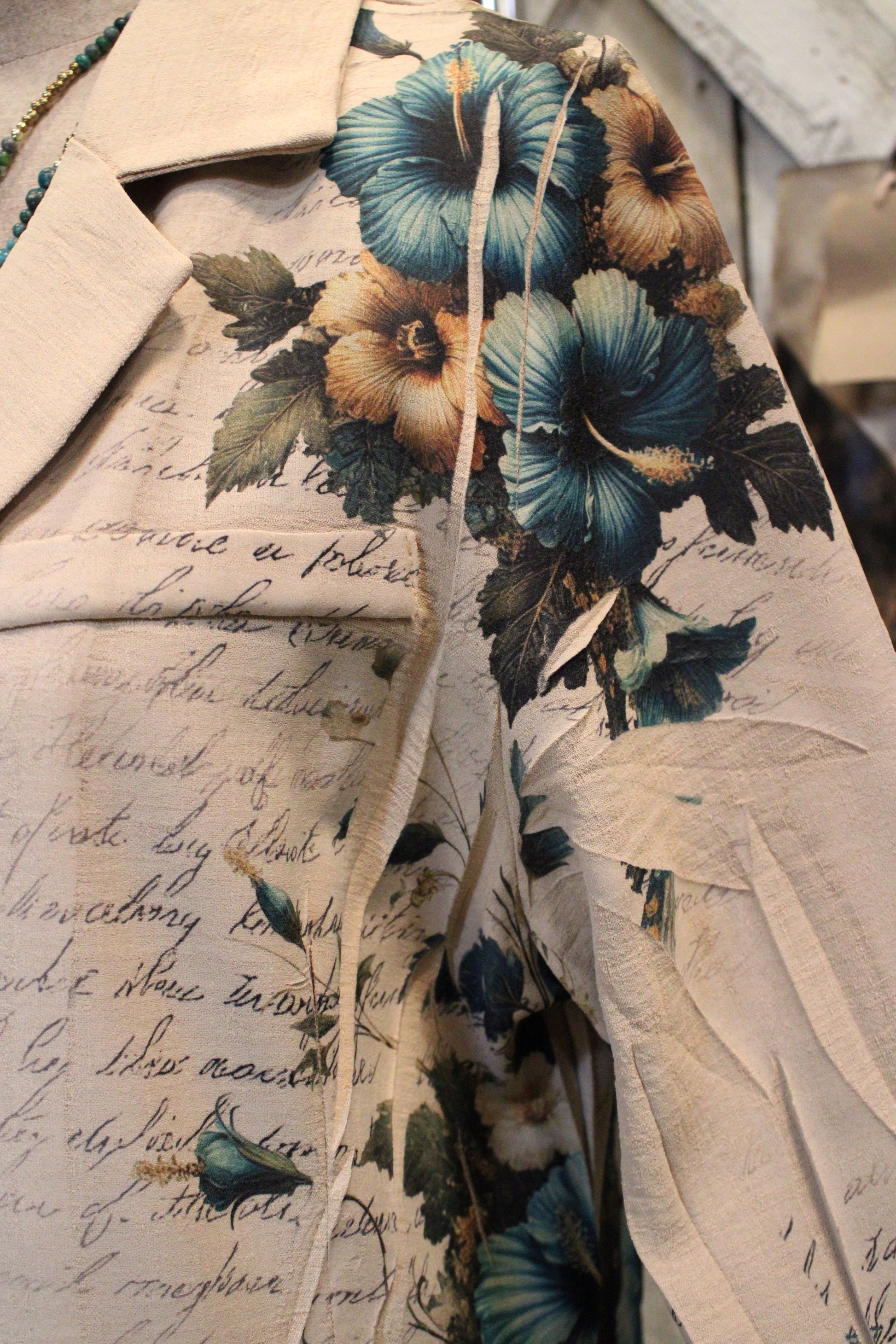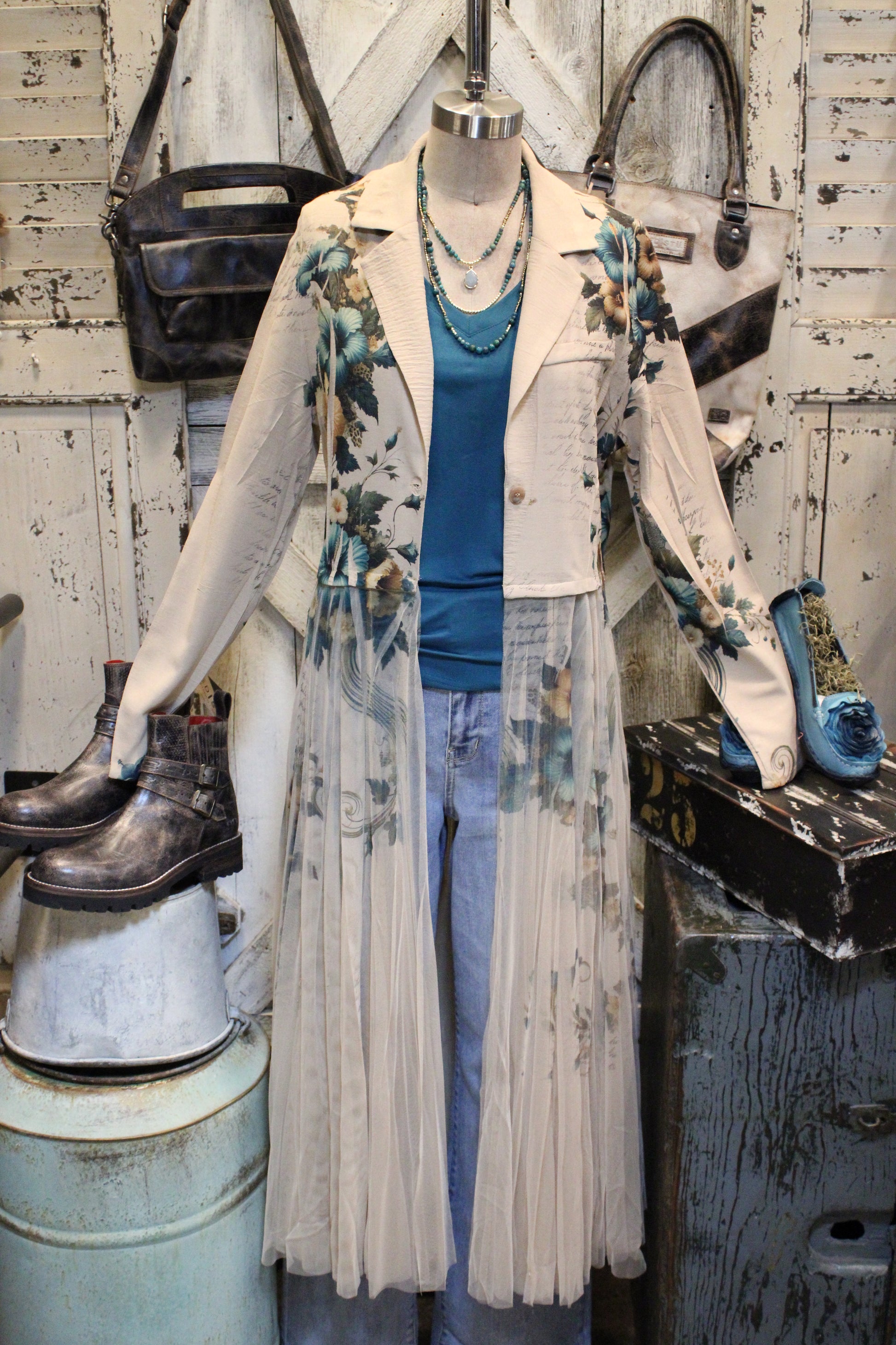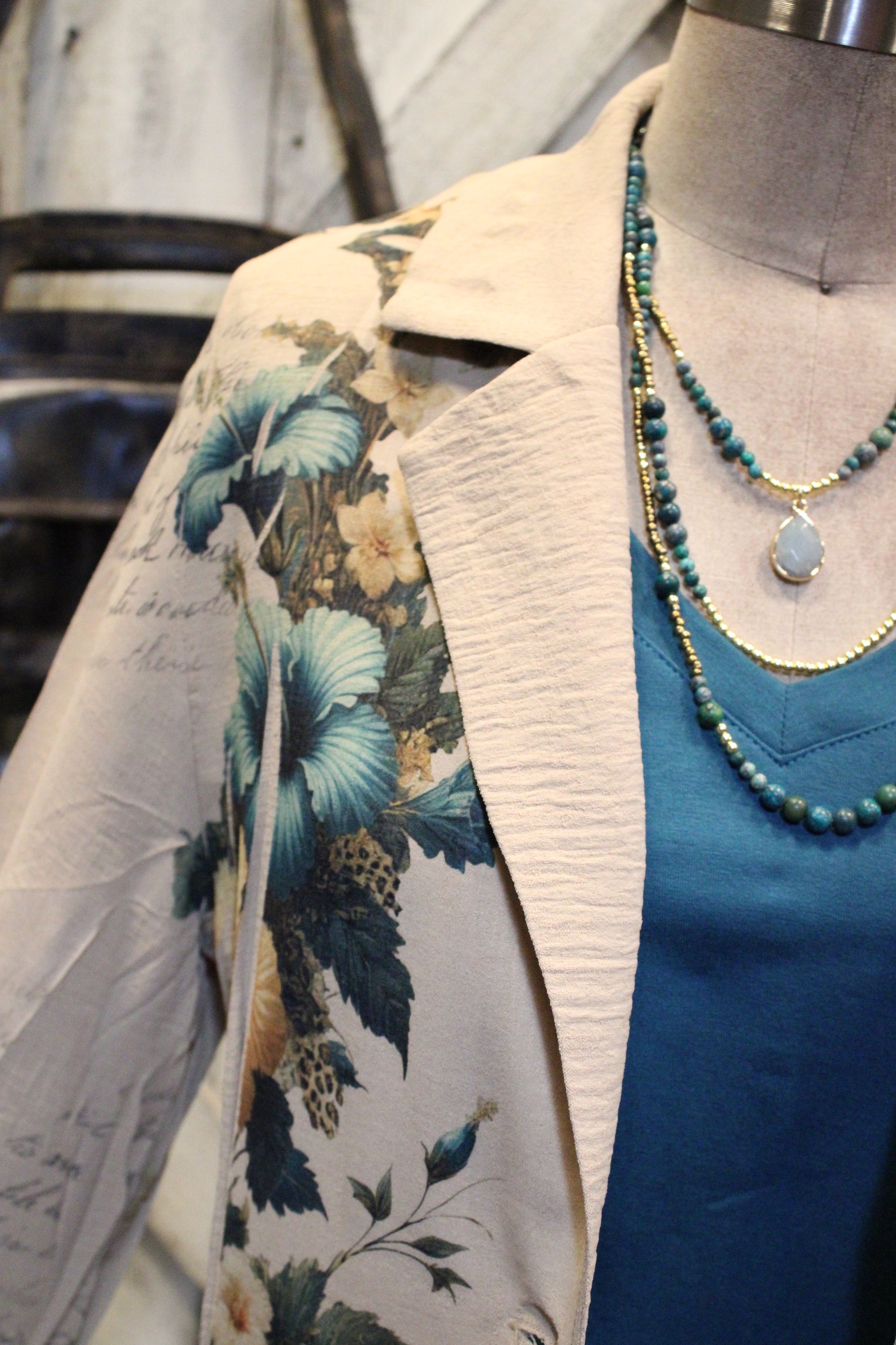 Muted teal and taupe florals lend a timeless charm, making this piece as versatile as it is captivating. Whether layered over denim for an elevated everyday look or paired with dressier pieces for a special occasion, it brings a touch of quiet luxury to your wardrobe.