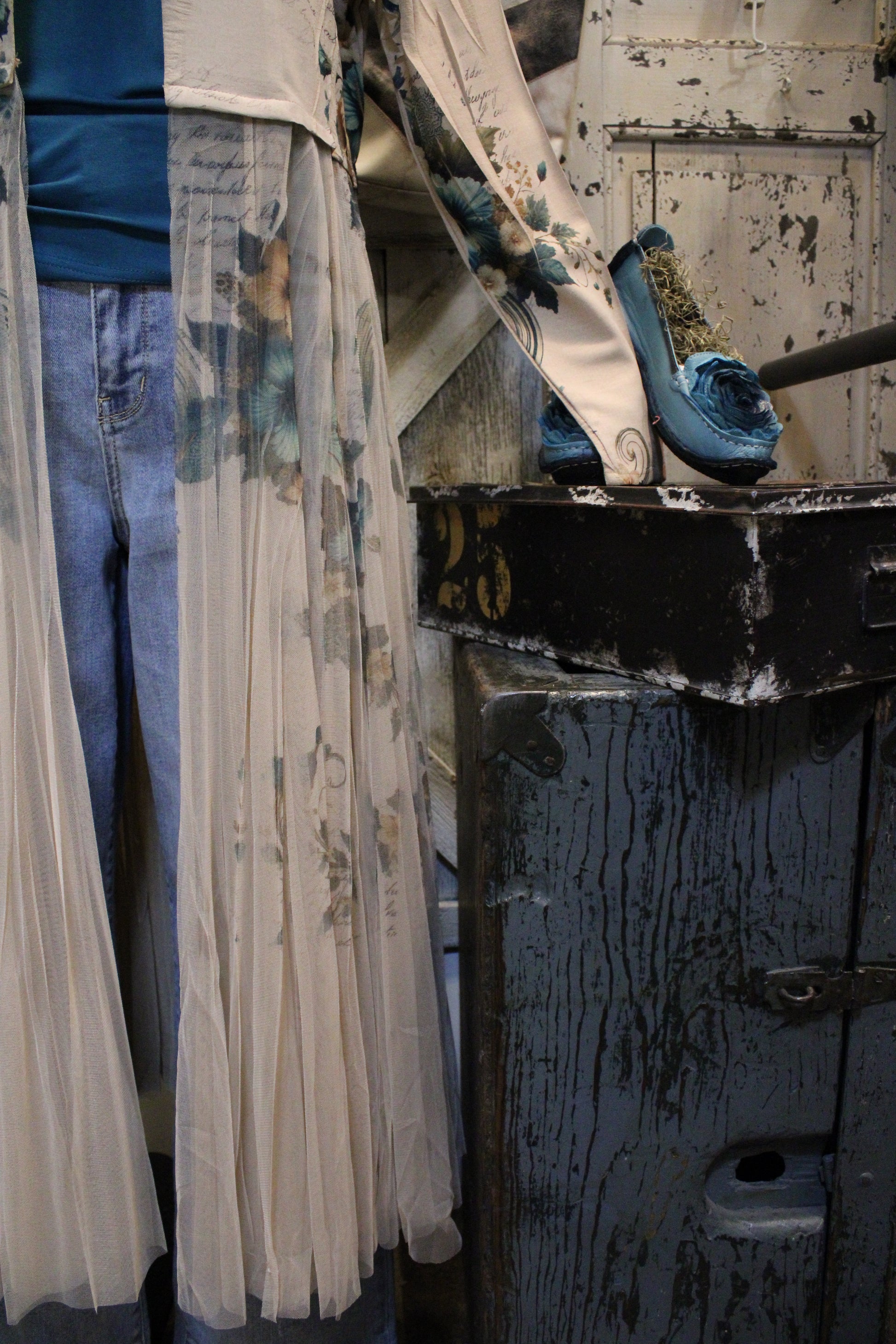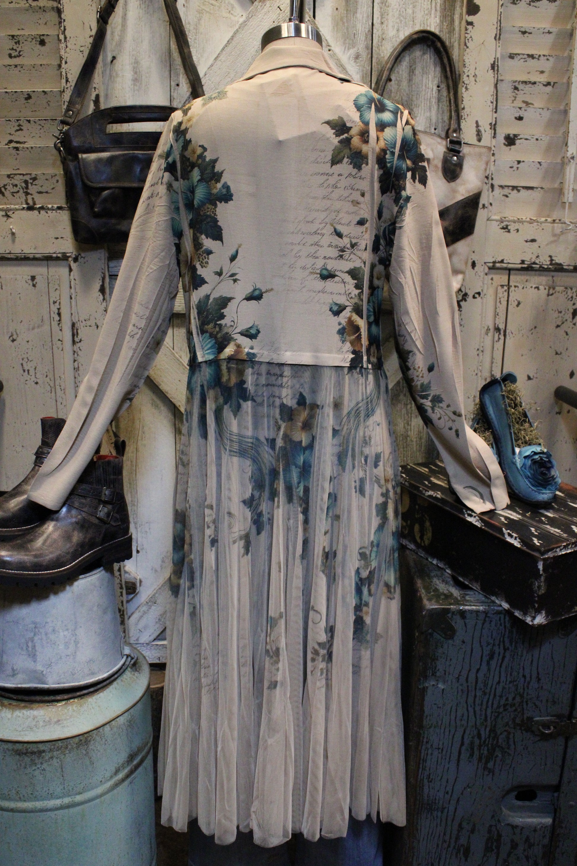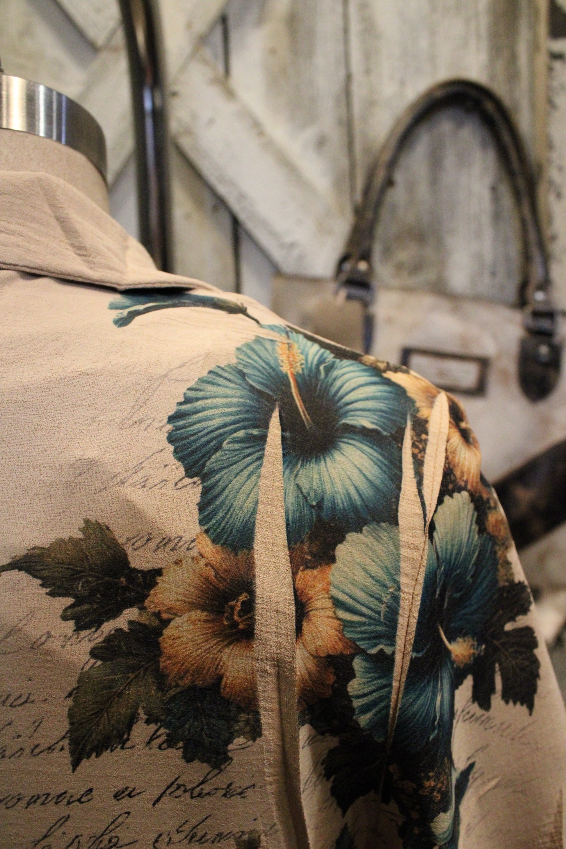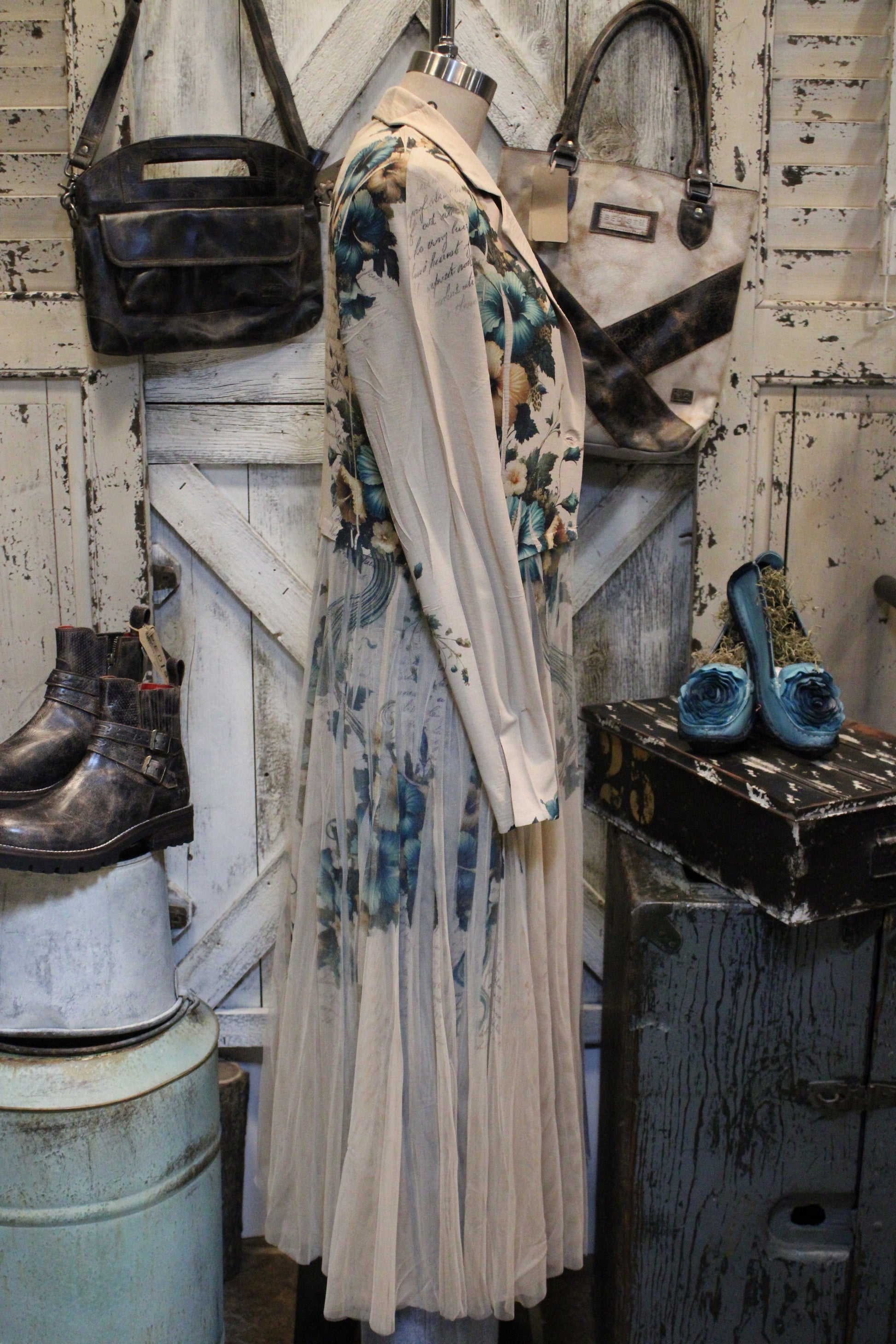 Muted teal and taupe florals lend a timeless charm, making this piece as versatile as it is captivating. Whether layered over denim for an elevated everyday look or paired with dressier pieces for a special occasion, it brings a touch of quiet luxury to your wardrobe.