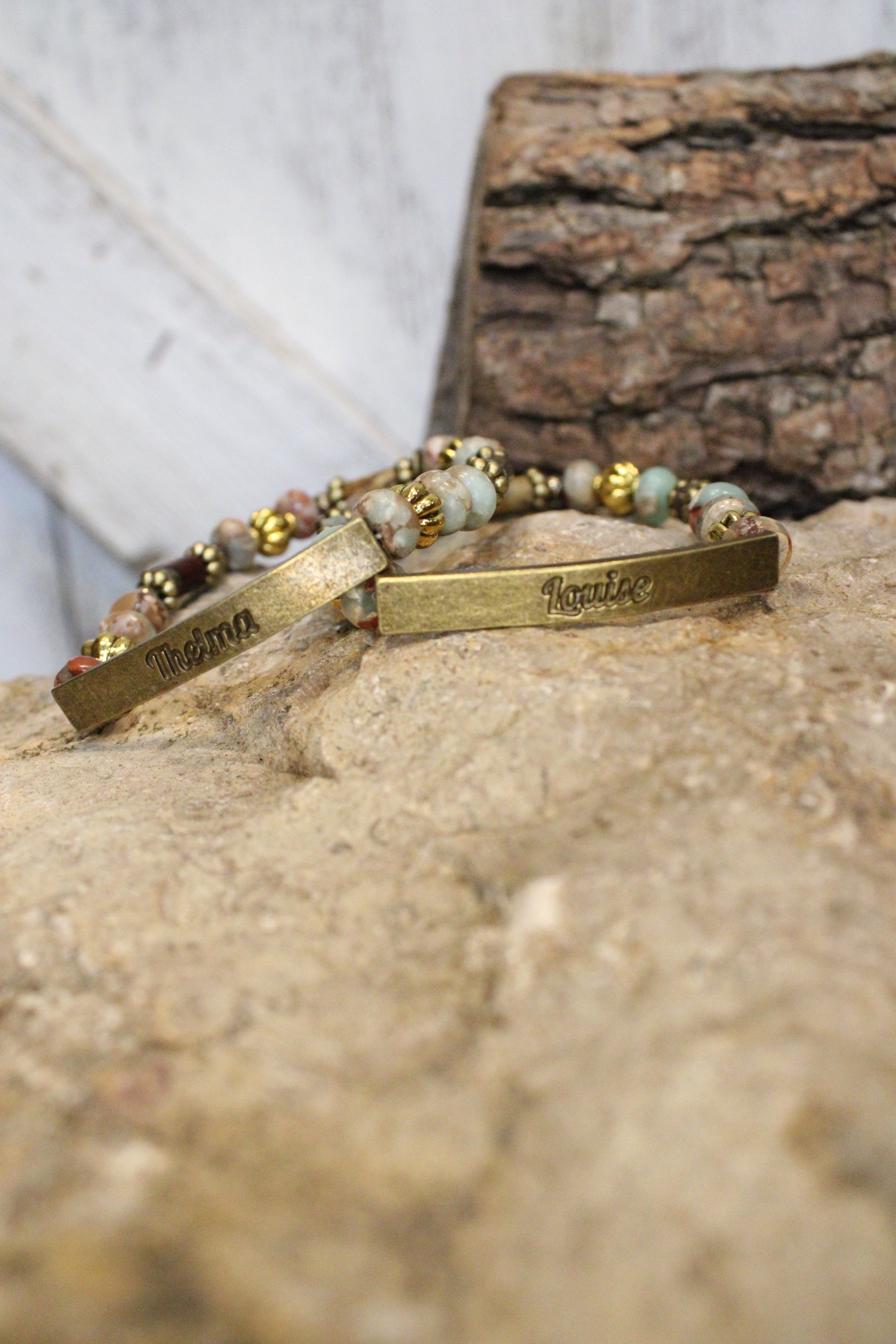 Each stretch bracelet features a mix of shimmering faceted beads in earthy neutral tones, paired with a sleek gold bar engraved with “Thelma” or “Louise.” Whether you keep one and gift one, or wear them both as a reminder of your bold, adventurous spirit, these bracelets are all about connection and style.