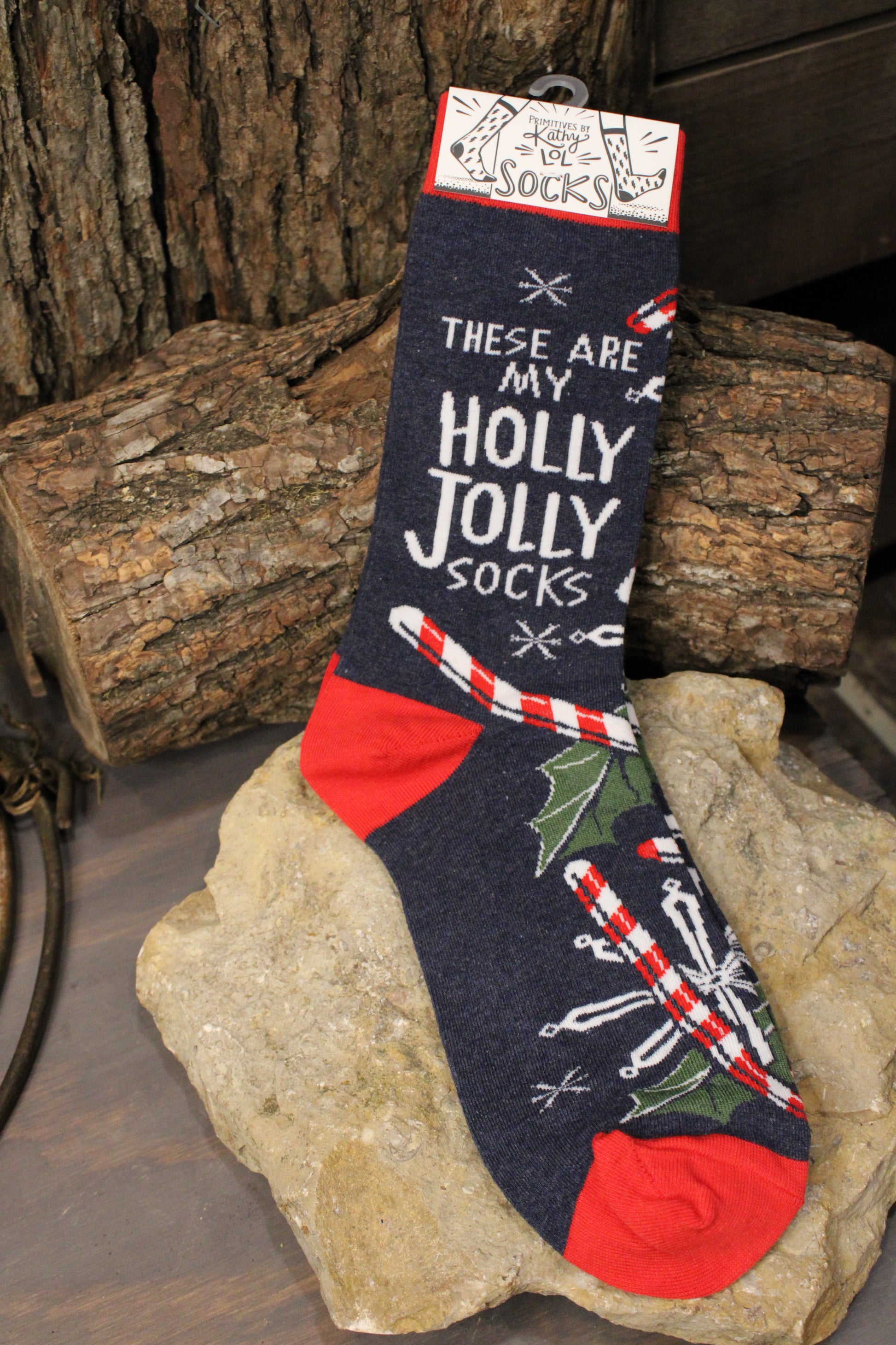 Introducing the These Are My Holly Jolly Socks – These socks are here to keep your feet cozy and your spirit merry. Featuring a navy background with bold red heels and toes, candy cane stripes, holly leaves, and the playful phrase “These Are My Holly Jolly Socks”, they’re as fun as they are festive.