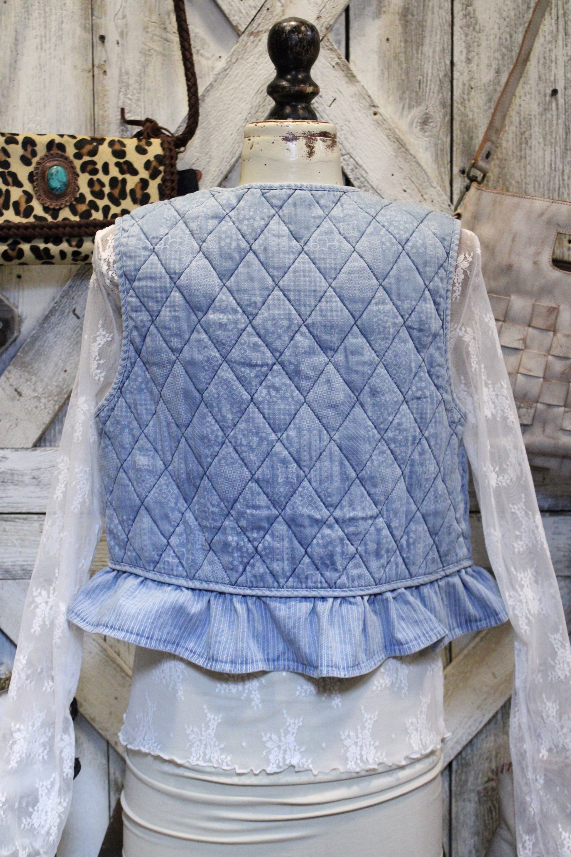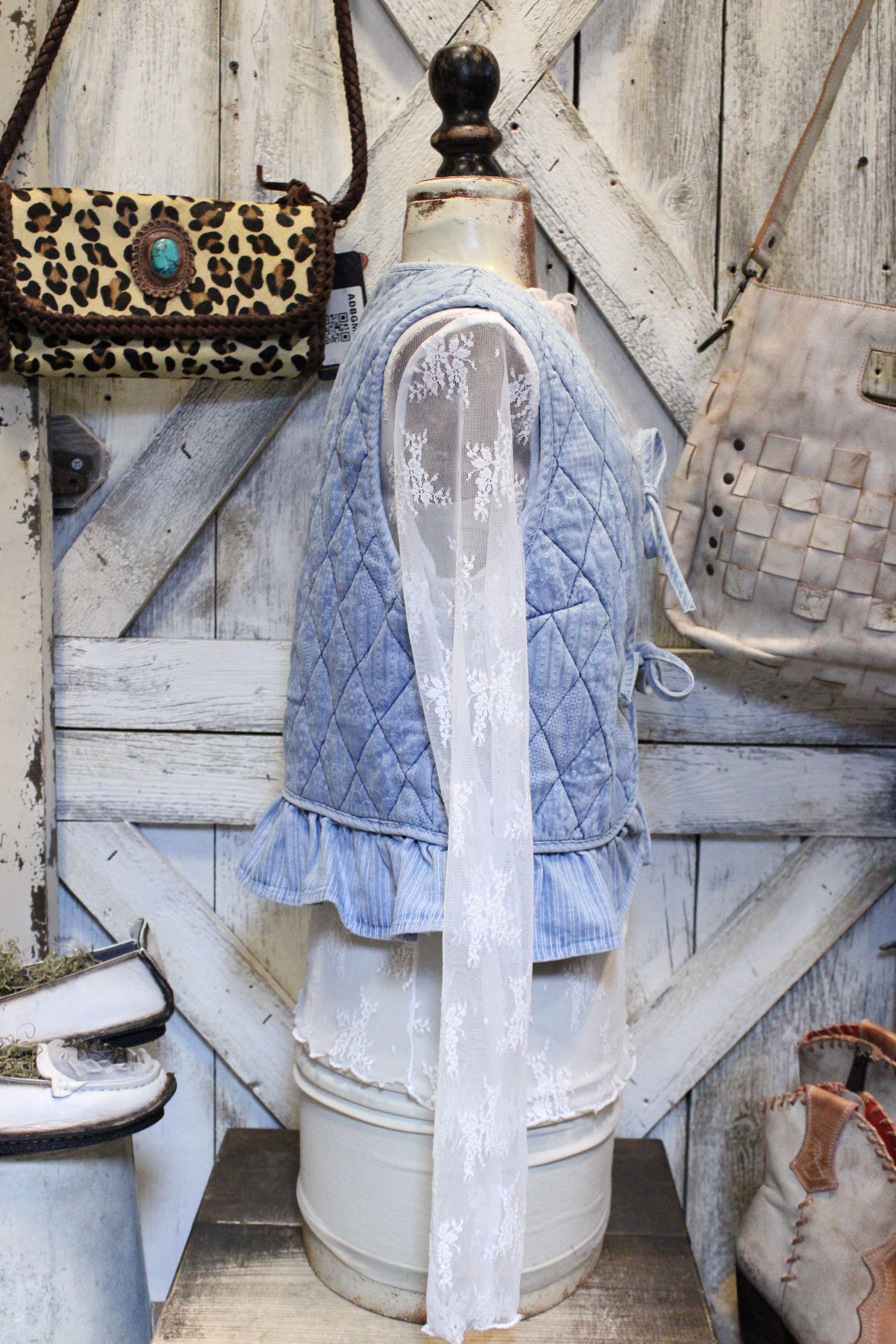 Introducing our Tied And True Quilted Crop Vest - This darling quilted vest features a soft dusty-blue tone with subtle stitched patterns and the prettiest ruffled hem. The tie-front closures give it that vintage-meets-boho feel — perfect for pairing over lace tops, flannels, or simple tees. Lightly padded for comfort, it’s just the right piece to bring cozy texture and sweet feminine style to your fall outfits.