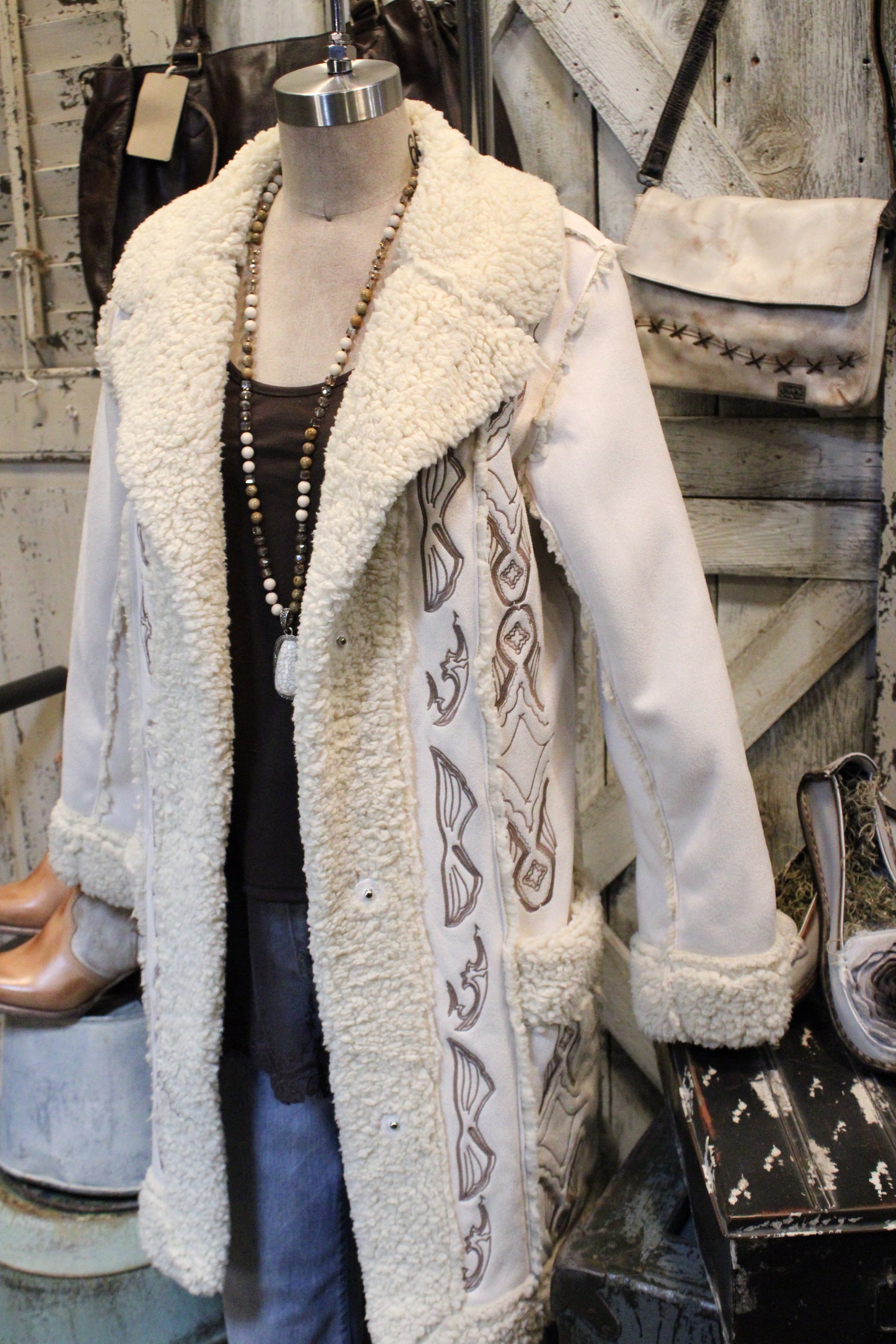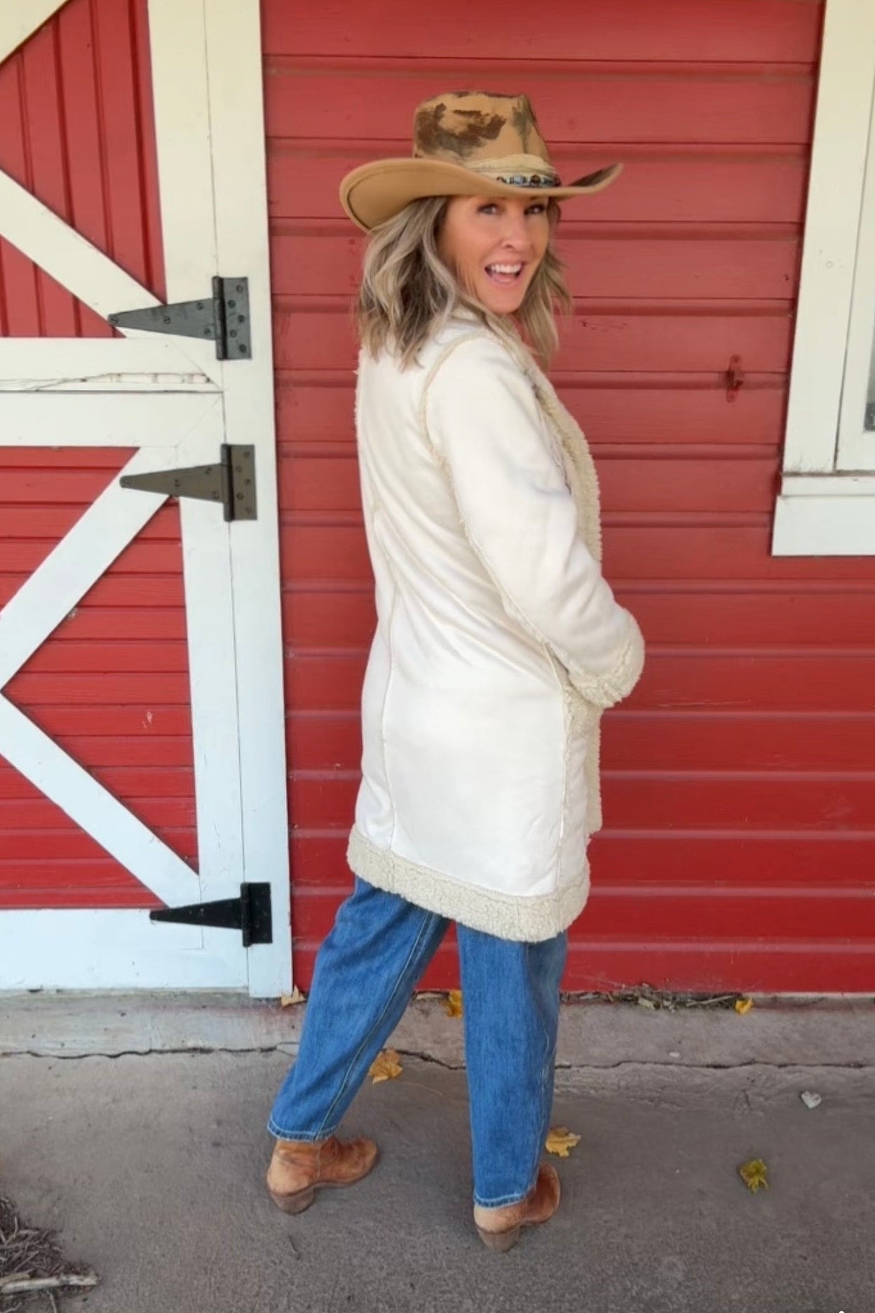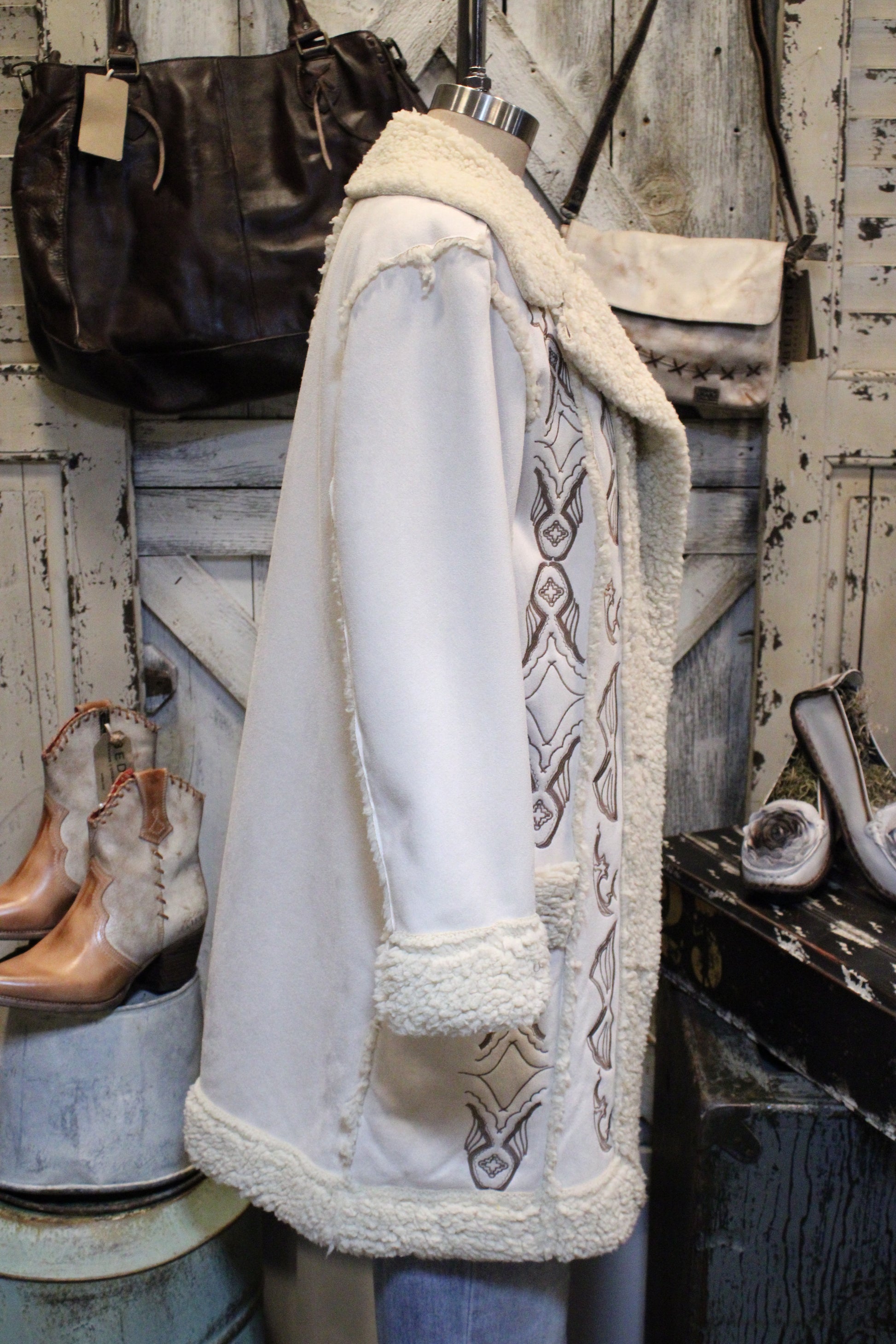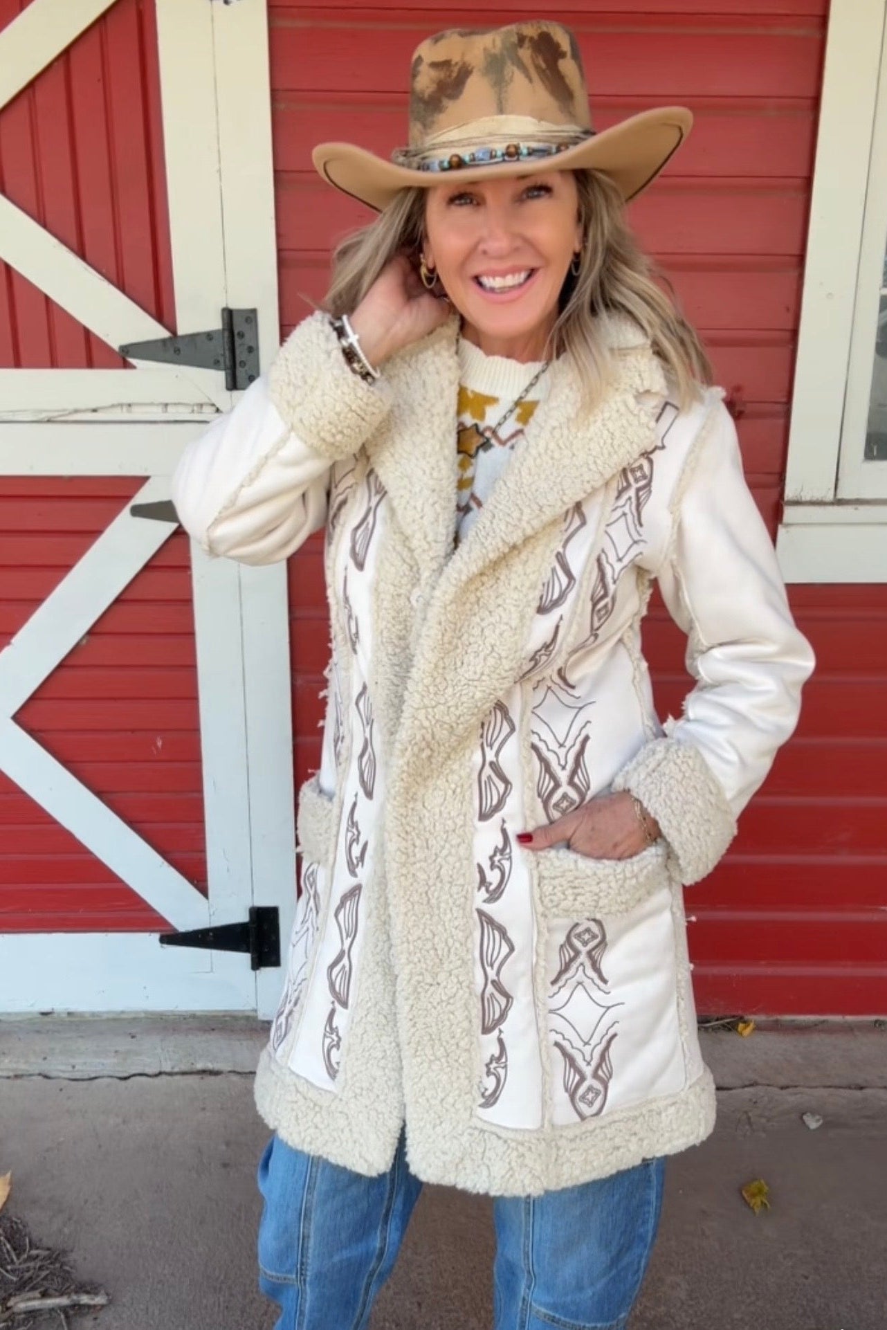 Introducing our Timberline Trail Jacket- This cozy beauty brings together classic cowgirl spirit and modern elegance with its soft cream hue, faux shearling trim, and detailed embroidered accents along the front. The plush lining keeps you warm through chilly mornings or festive winter outings, while the structured silhouette and lapel collar give it that elevated, touch.