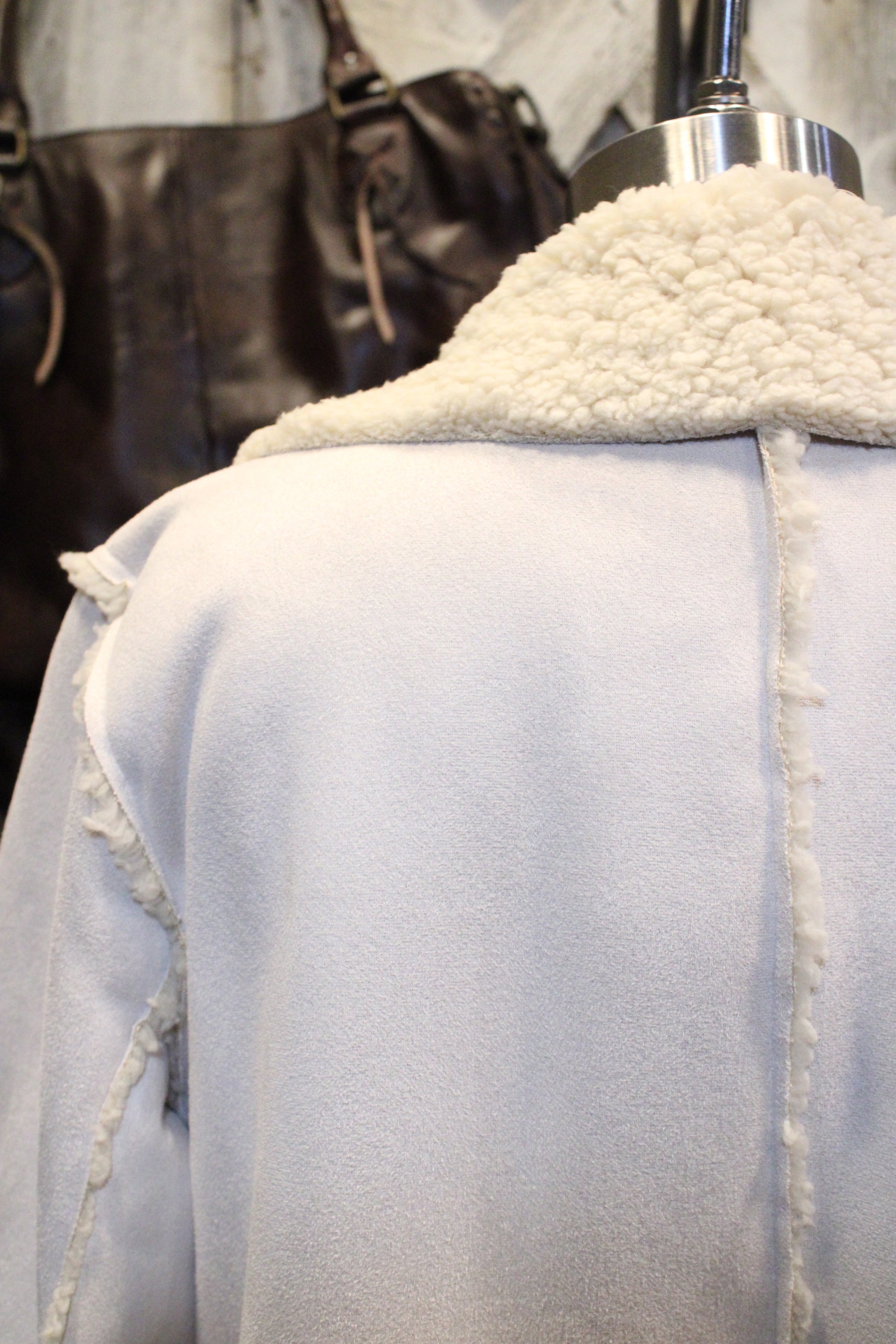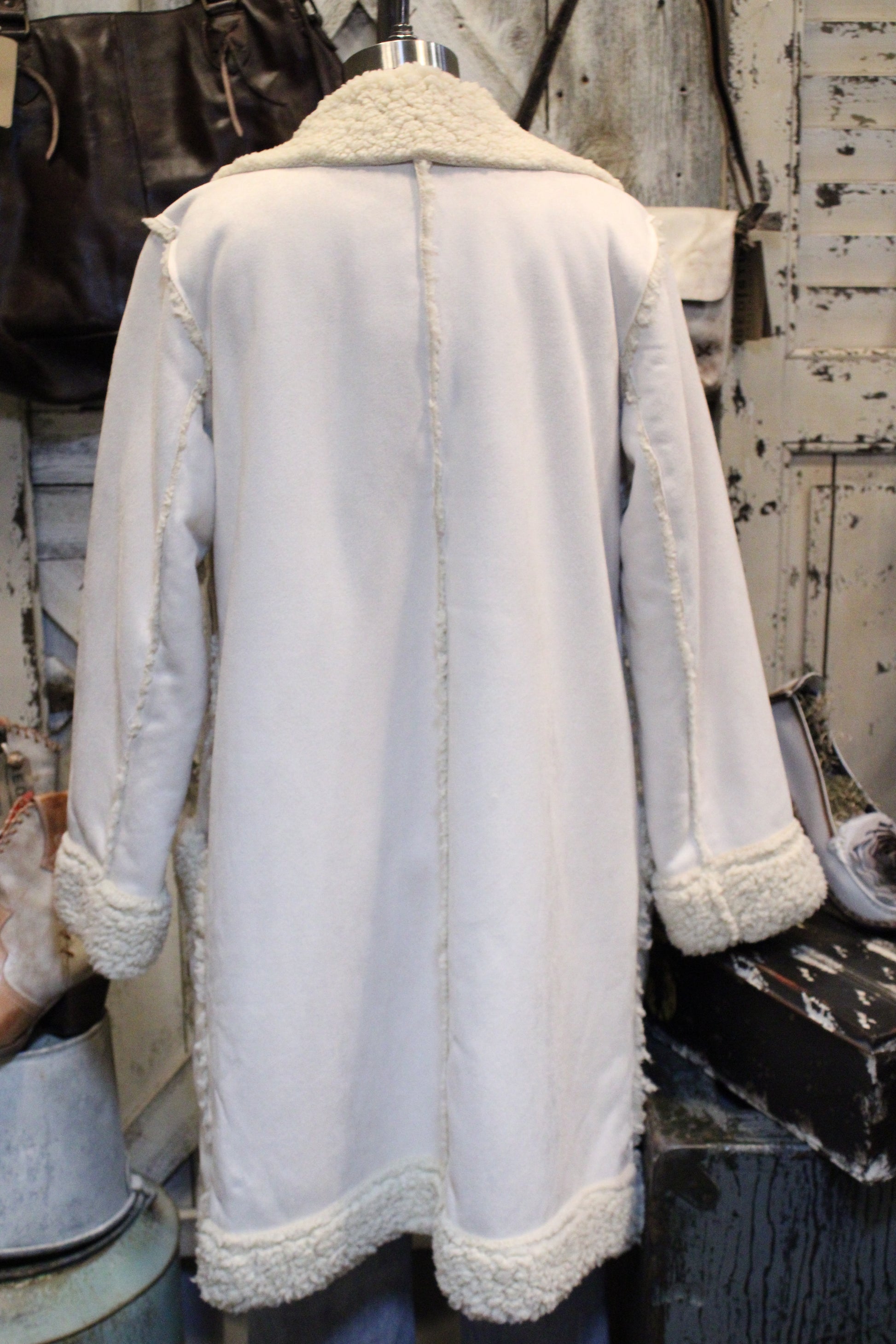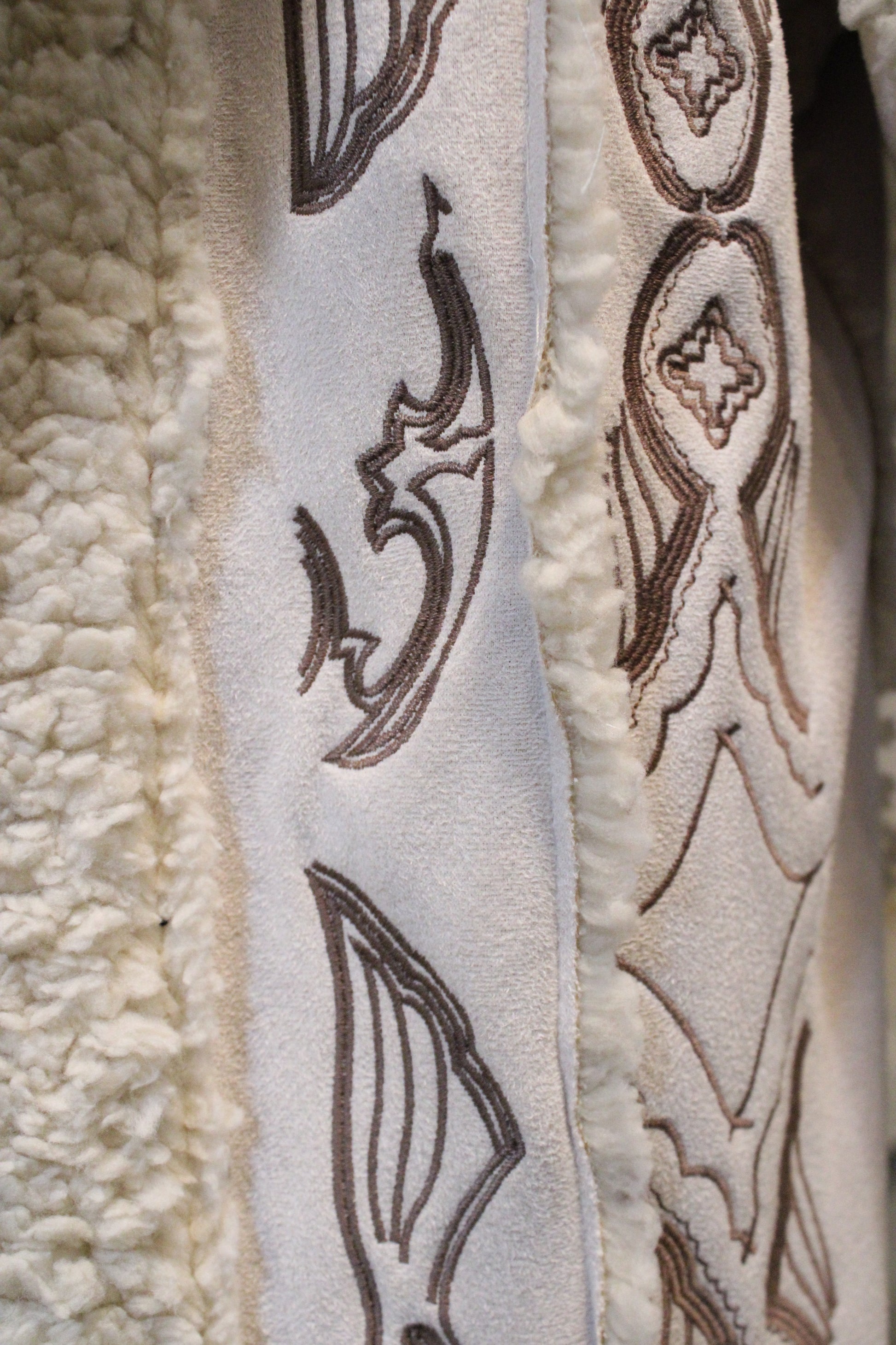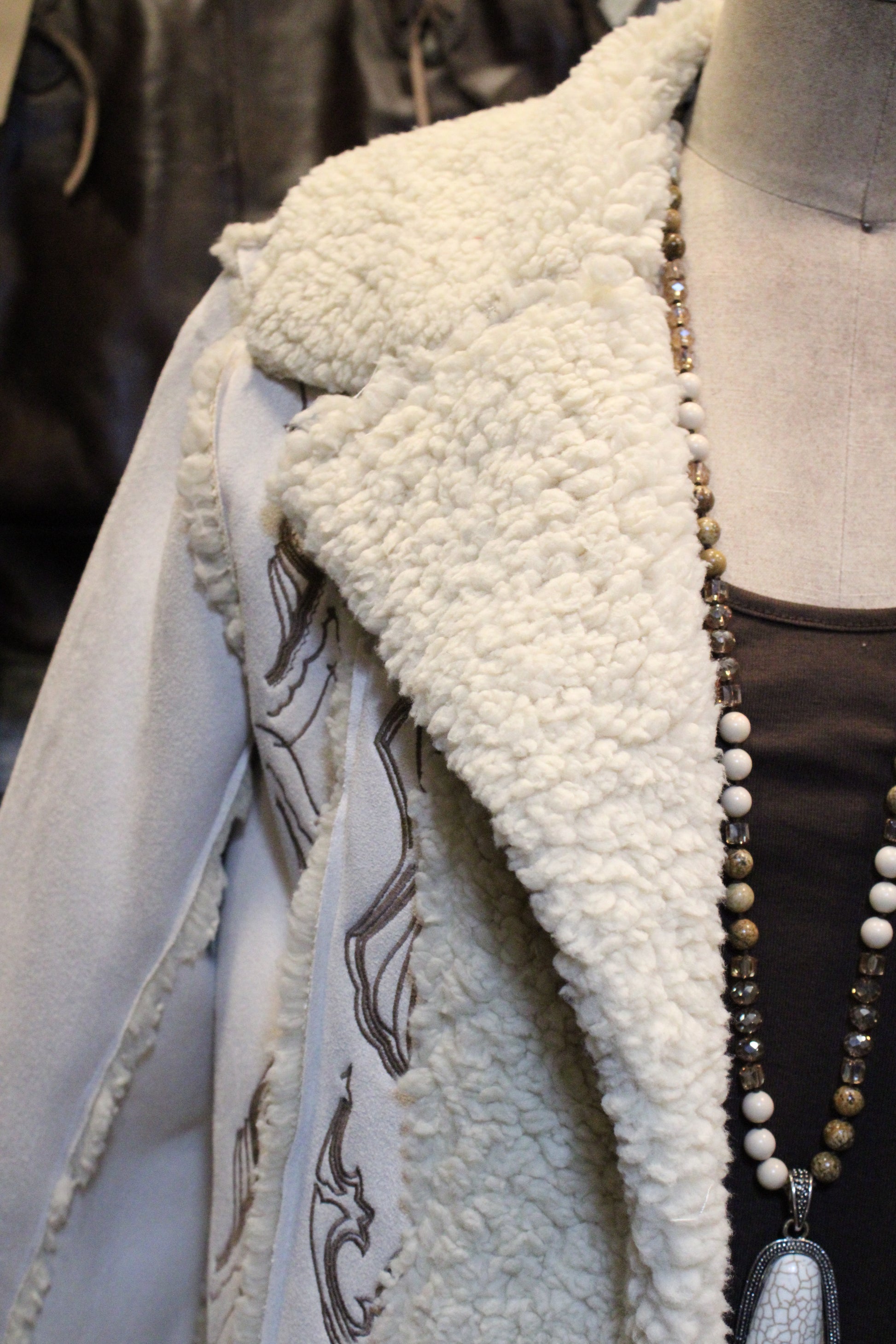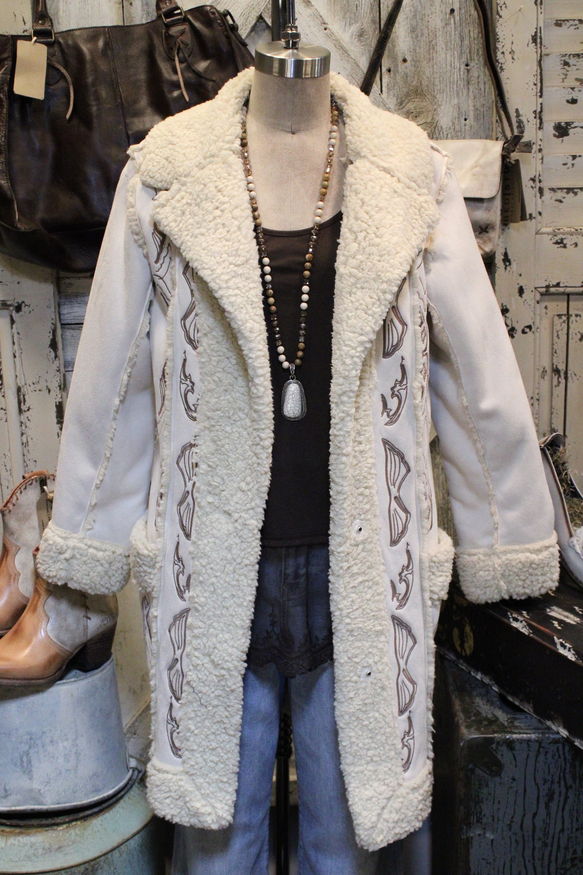 Introducing our Timberline Trail Jacket- This cozy beauty brings together classic cowgirl spirit and modern elegance with its soft cream hue, faux shearling trim, and detailed embroidered accents along the front. The plush lining keeps you warm through chilly mornings or festive winter outings, while the structured silhouette and lapel collar give it that elevated, touch.