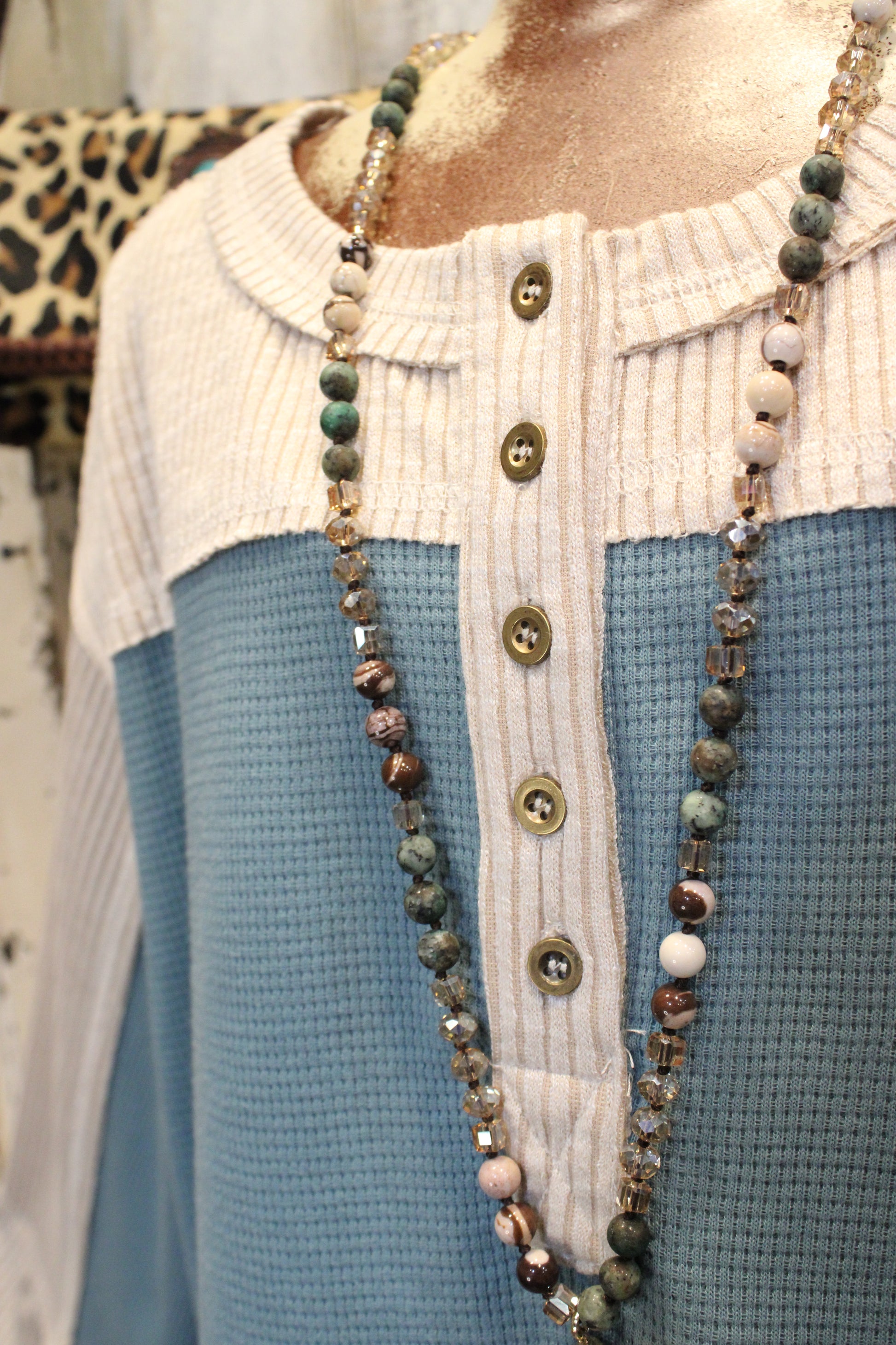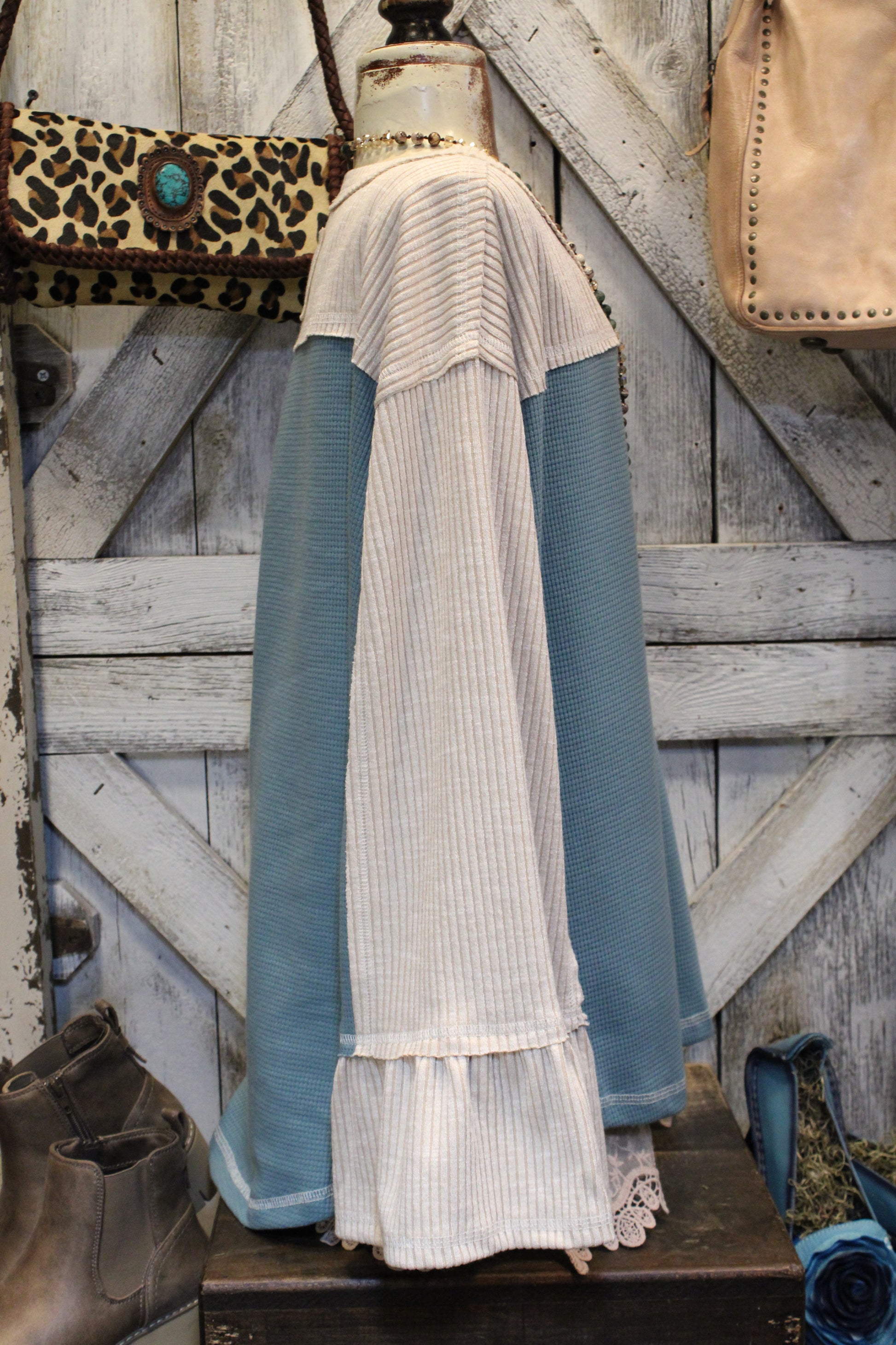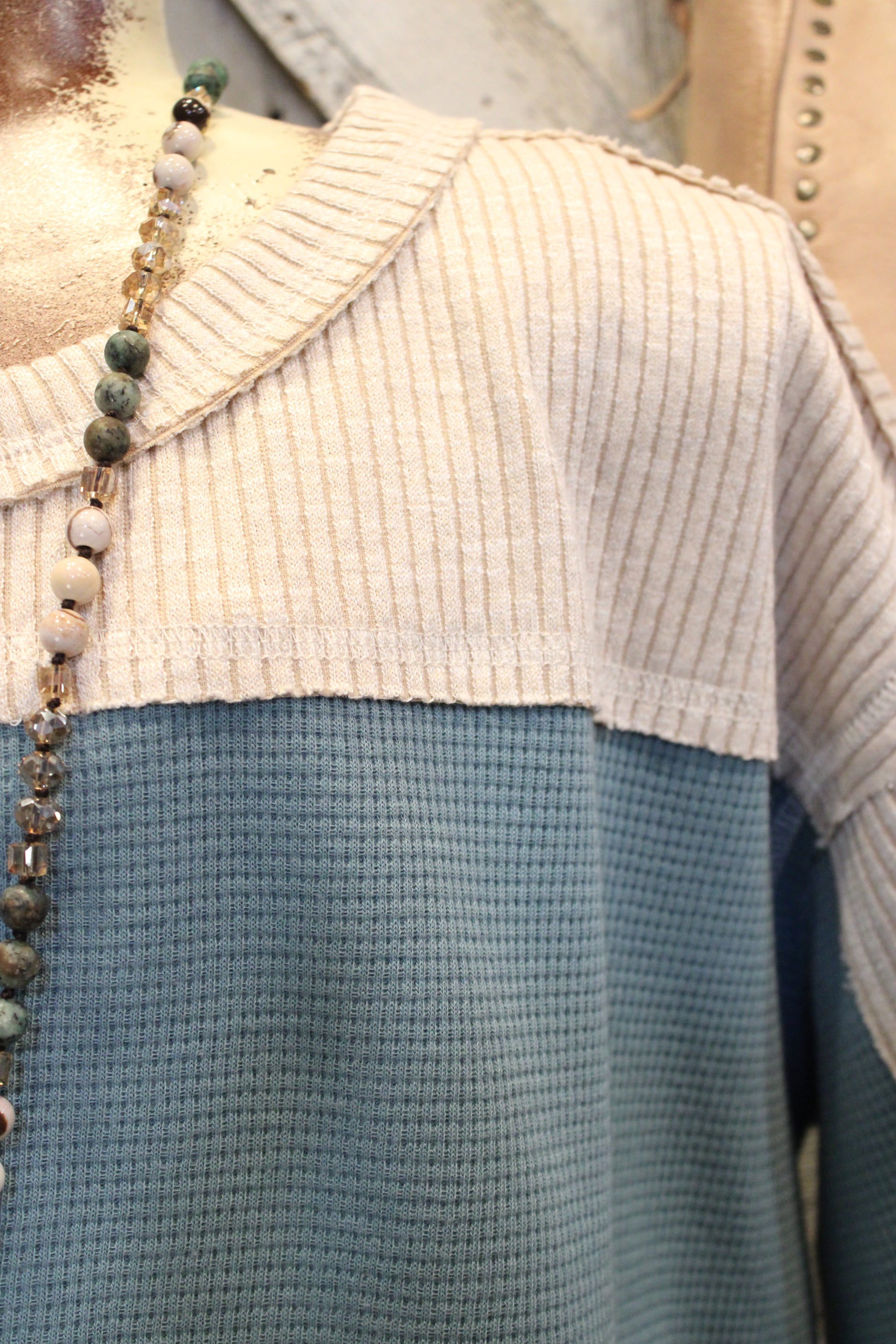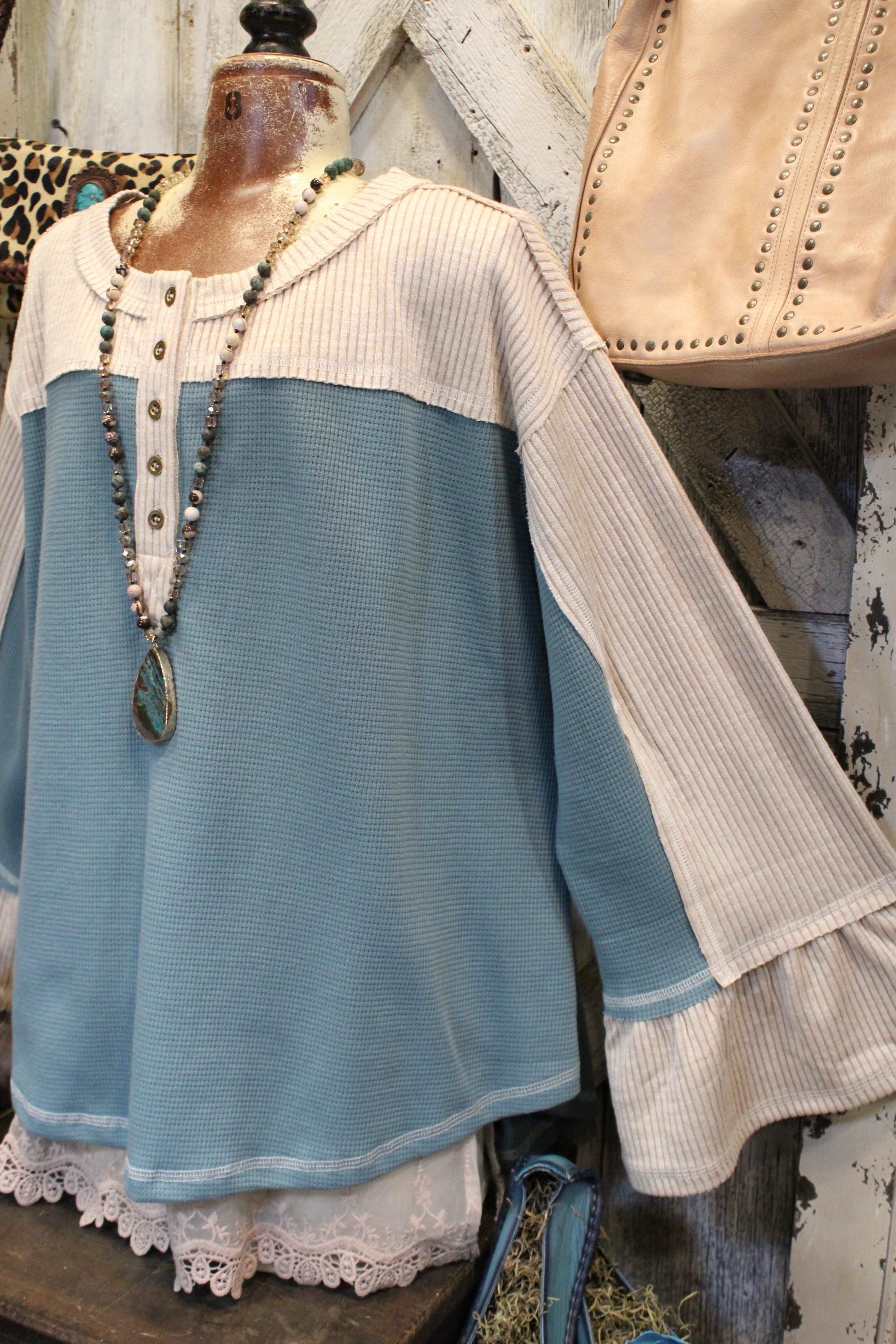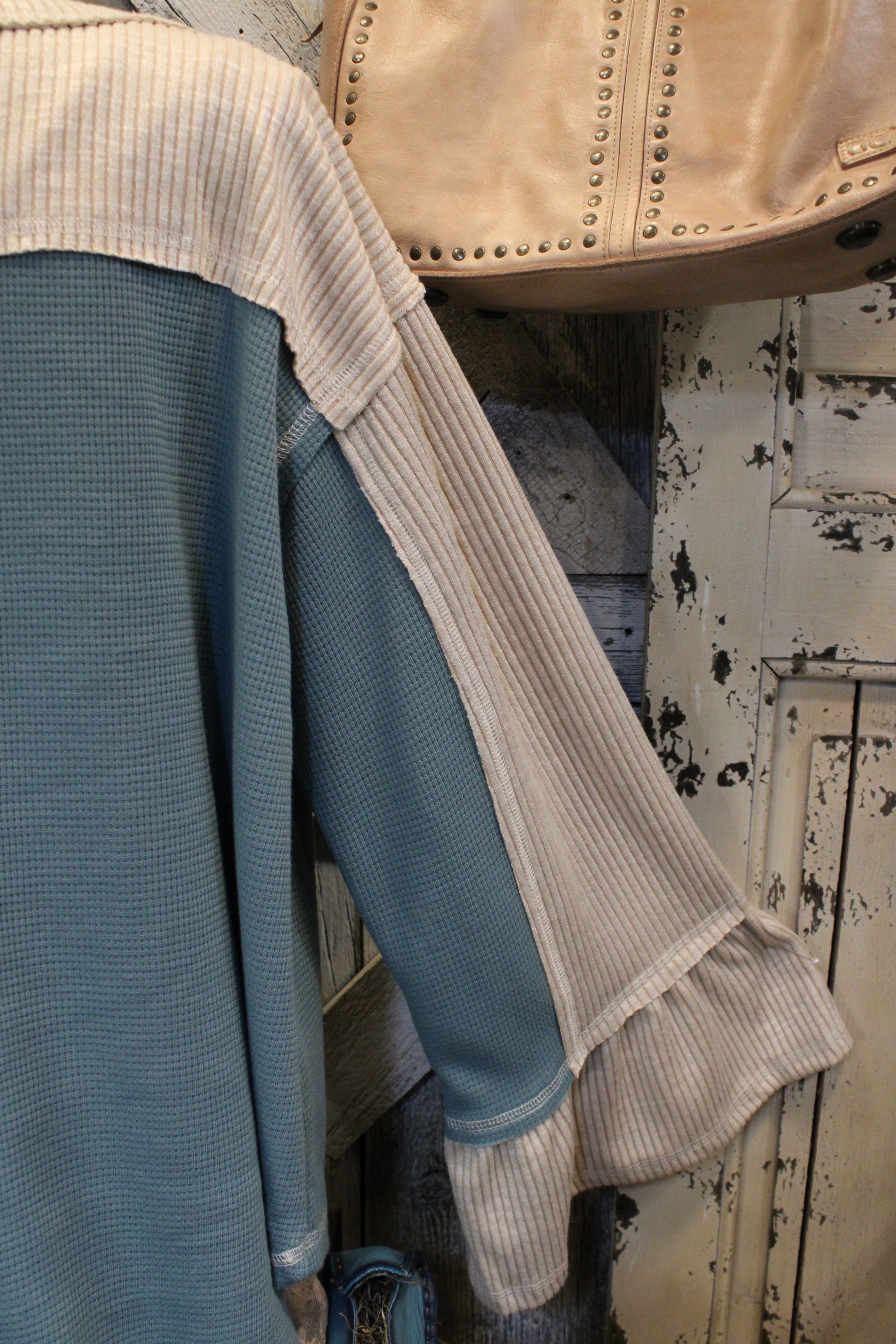 Introducing the Too Cute Top- This soft, two-tone thermal features a relaxed fit with a button-front neckline and contrast ribbed sleeves for that perfect mix of texture and comfort. The light blue and cream combo gives it a laid-back, feminine feel that’s easy to love and even easier to wear.
