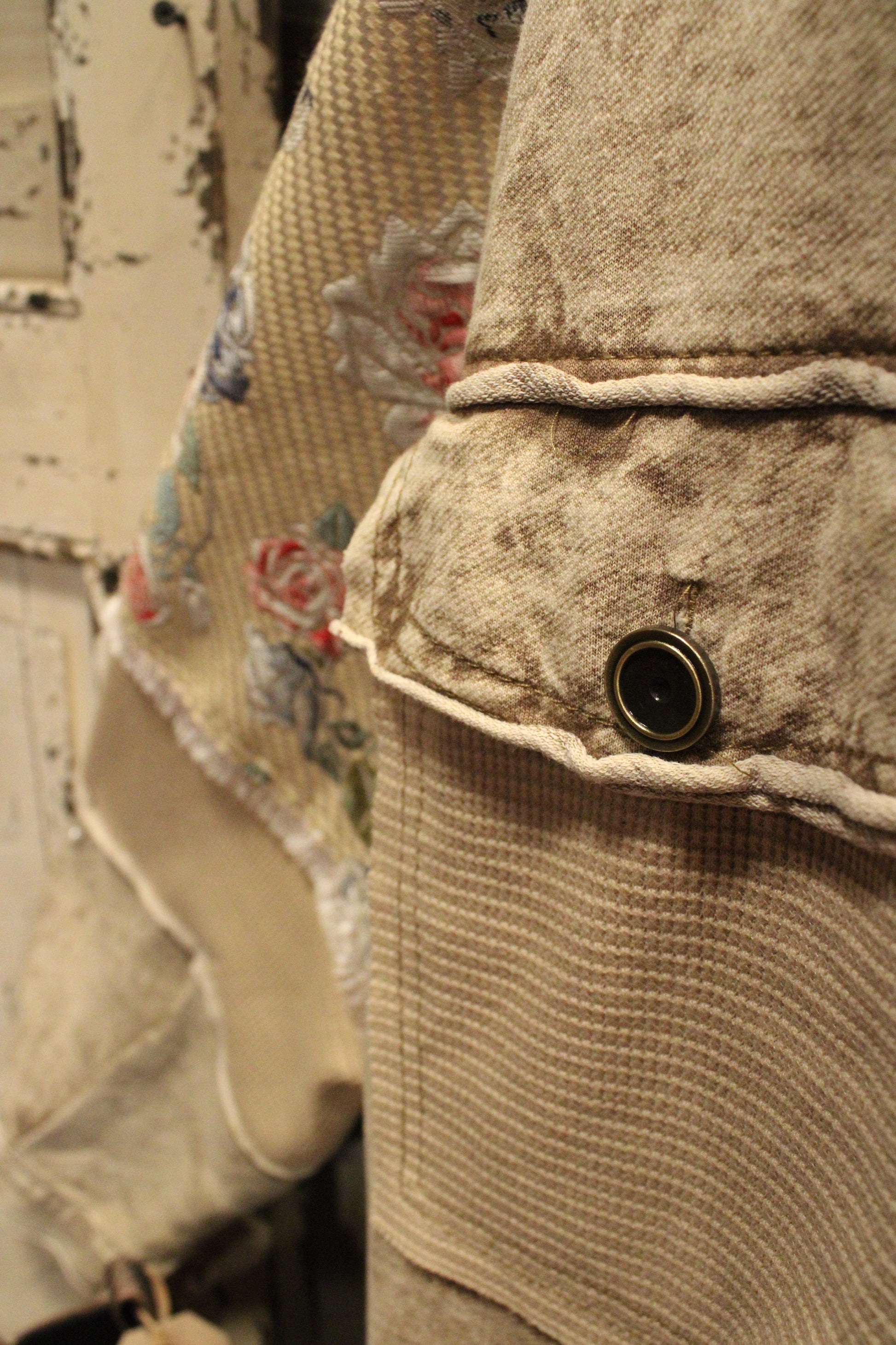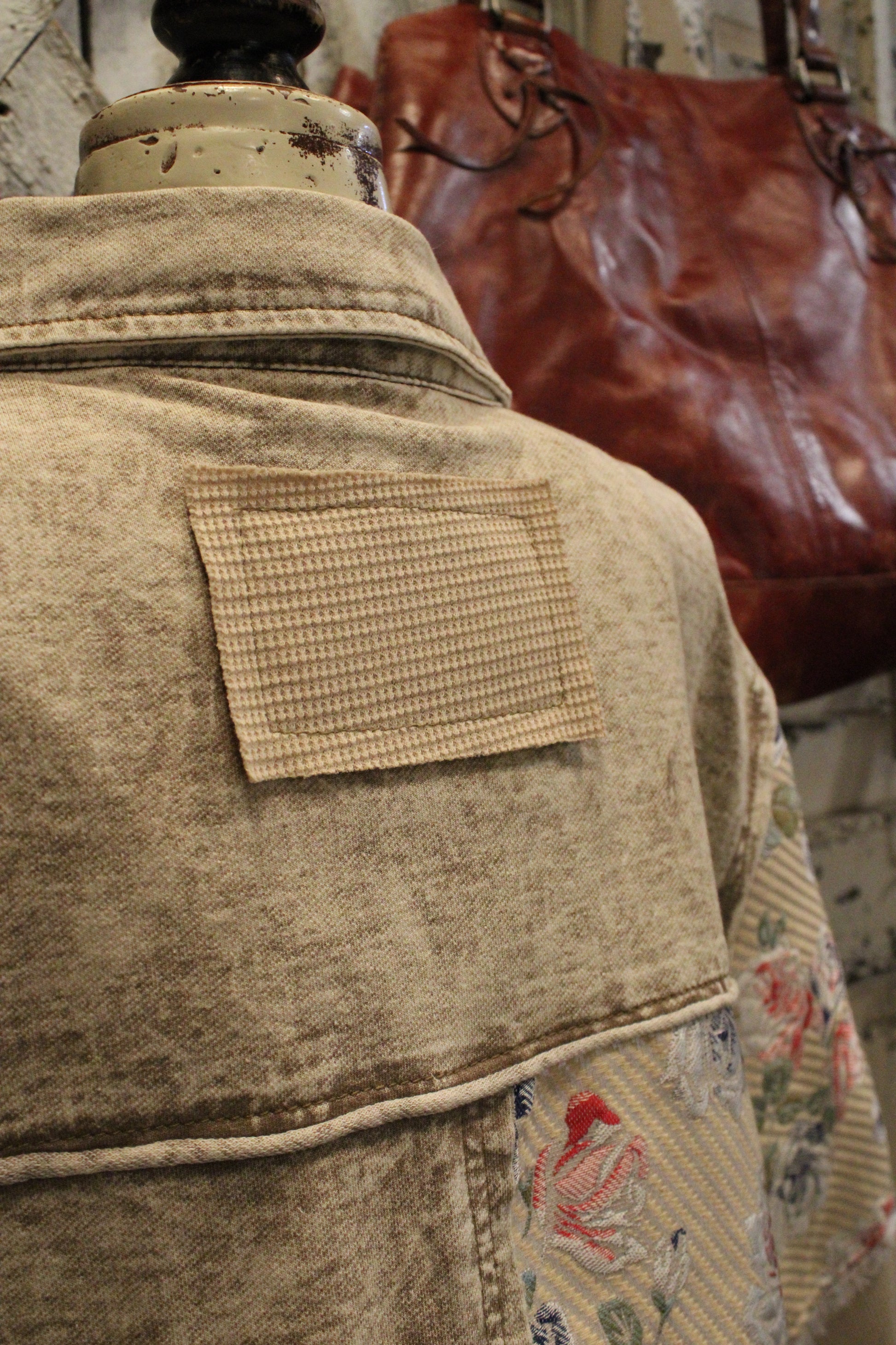 Introducing the Touch of Floral Button Up- A little rugged, a little romantic—this jacket is all about contrast in the best way. Made from a distressed canvas-style fabric, this jacket blends vintage edge with soft floral patterns and patchwork charm. Waffle-knit elbow panels and raw-edge seams add texture, while the structured silhouette and button-front closure bring just enough utility.
