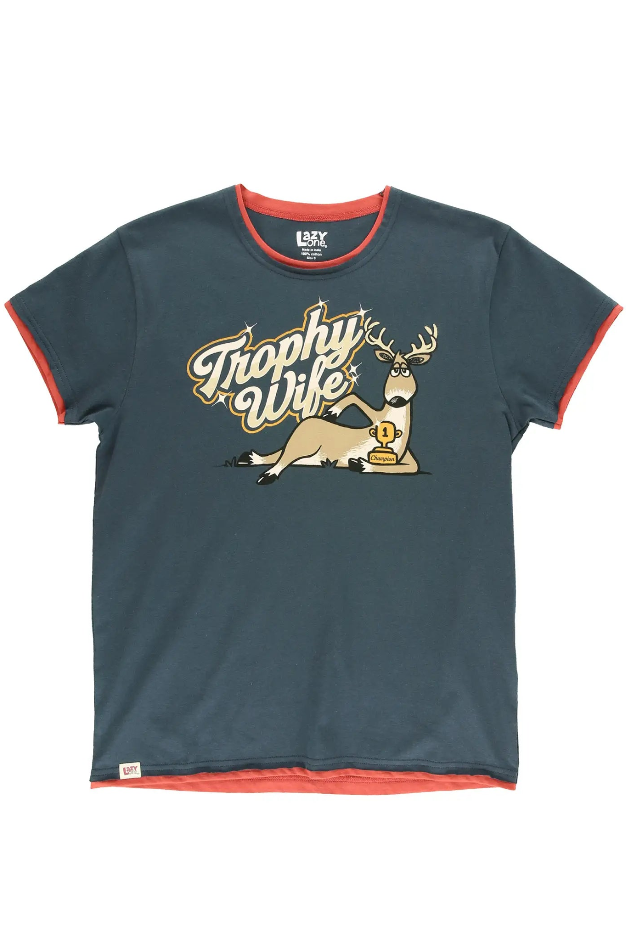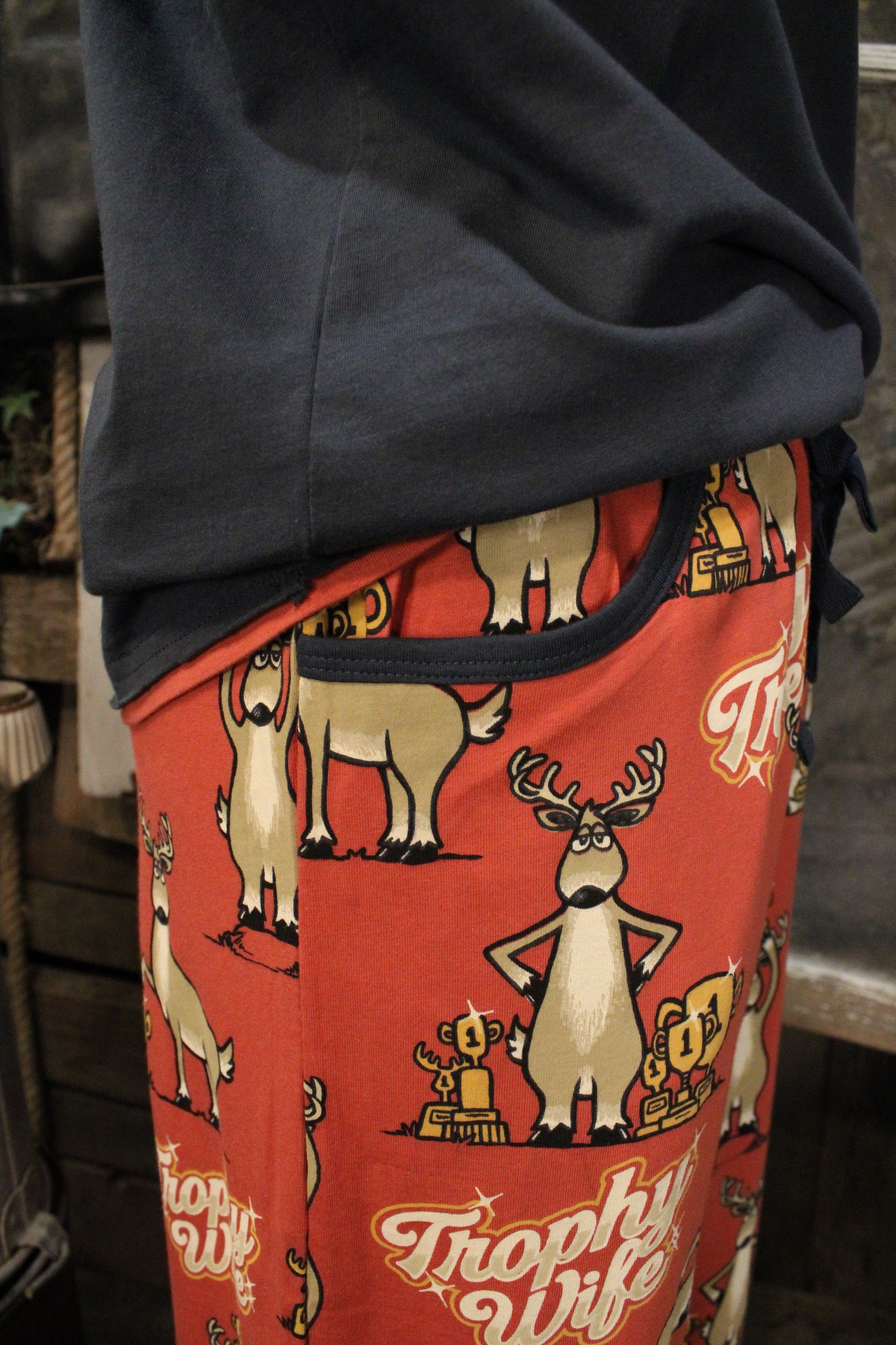 Introducing the Trophy Wife Cotton Pajama Set - This playful pajama set is made for cozy nights and slow mornings with a whole lot of personality. Featuring a matching graphic tee and pajama pants, it brings a fun western twist to your bedtime routine. The tee offers a relaxed, comfortable fit with a bold “Trophy Wife” graphic front and center, while the coordinating pajama pants feature an allover print that keeps the look lighthearted and fun.