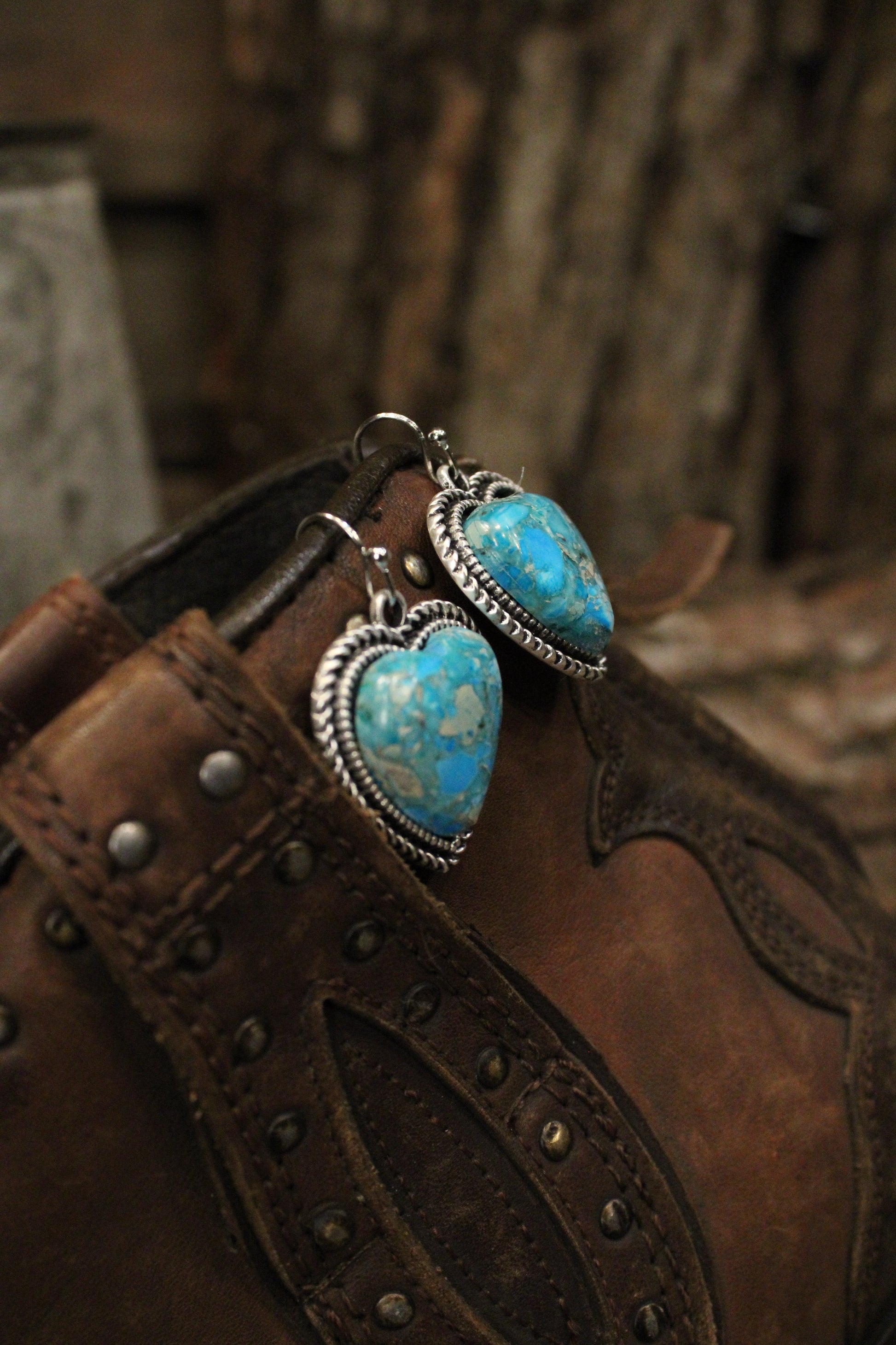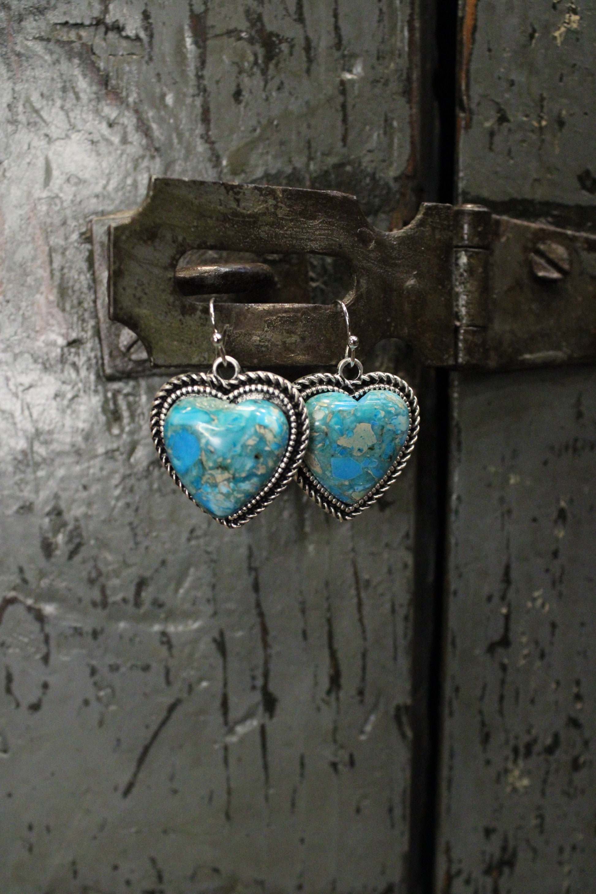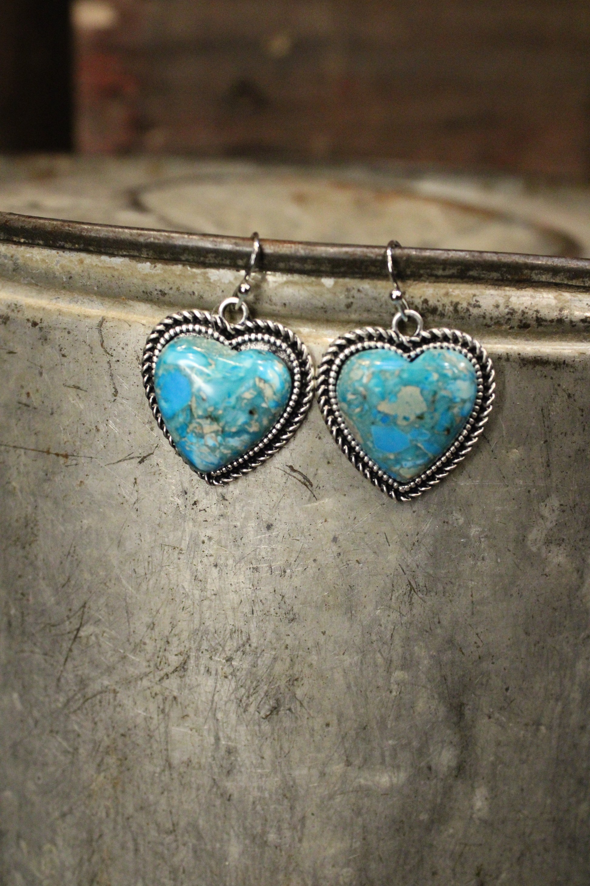 Introducing our beautiful Turquoise Love Earrings, These turquoise heart drop earrings are the perfect mix of western romance and everyday charm. Each heart features a beautifully marbled turquoise stone framed in an antique silver-tone setting with delicate rope detailing that adds just the right touch of vintage flair. Lightweight and easy to wear, they bring a pop of color and a whole lot of heart to your look. Pair them with a cozy sweater, a flowy dress, or your favorite denim jacket for that effortlessly sweet, farm-girl boho vibe you’ll reach for again and again.