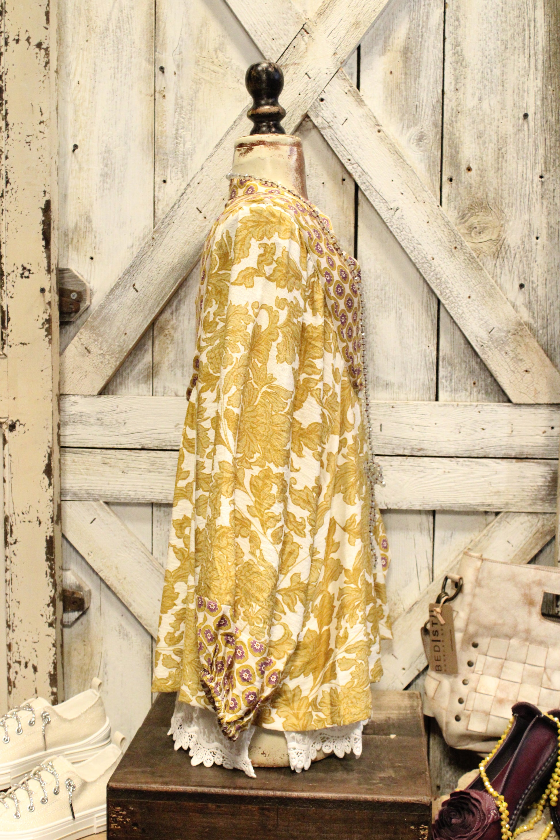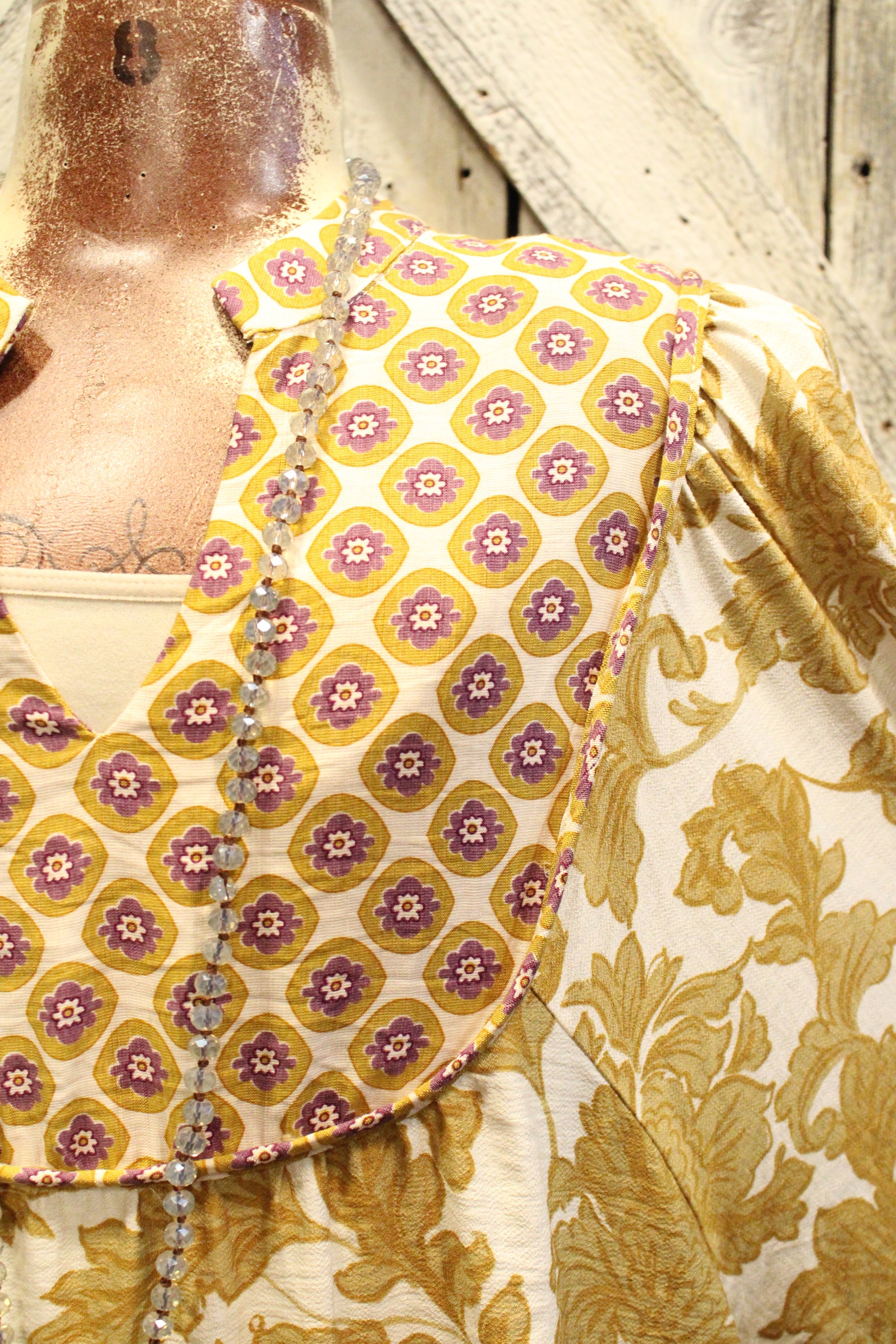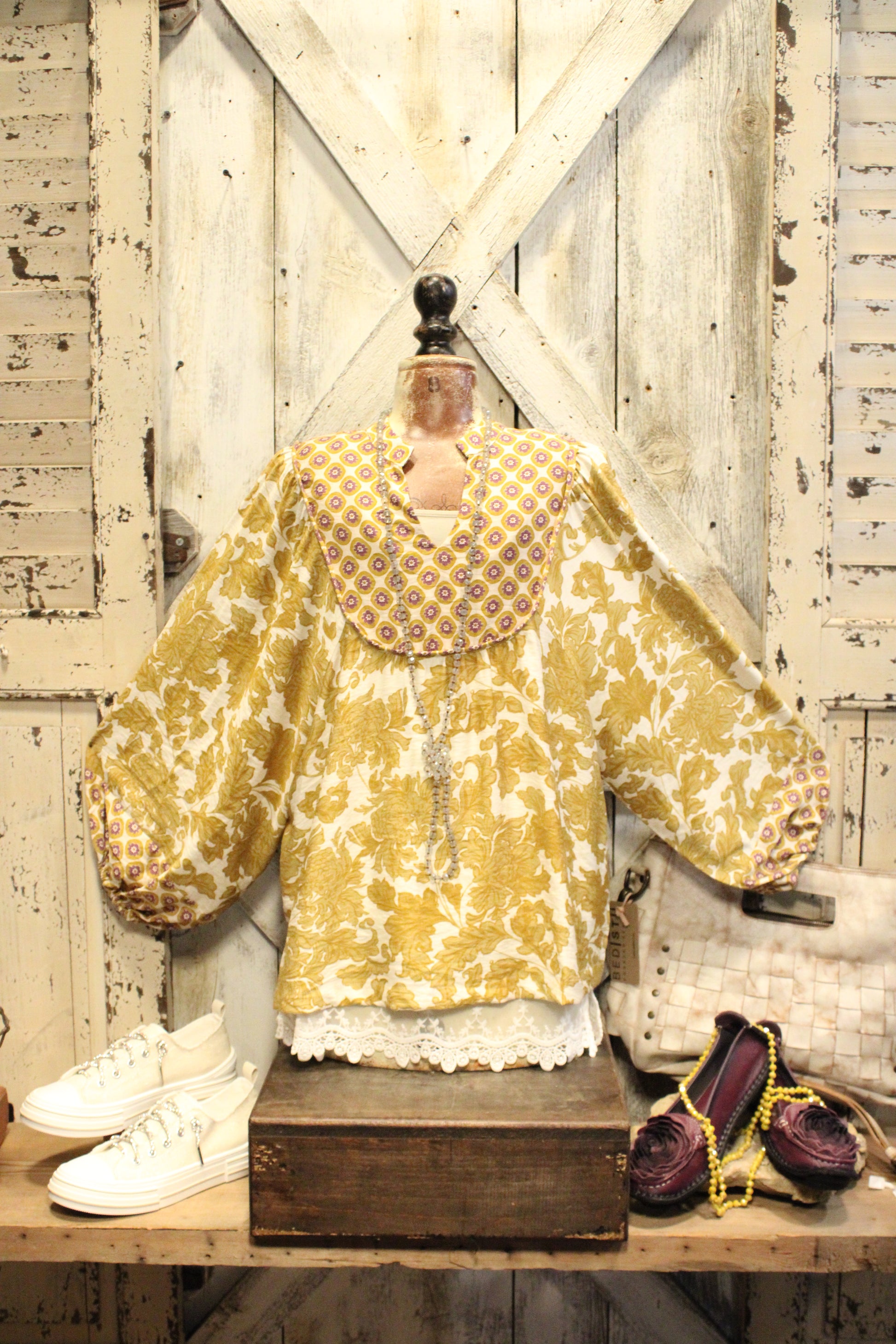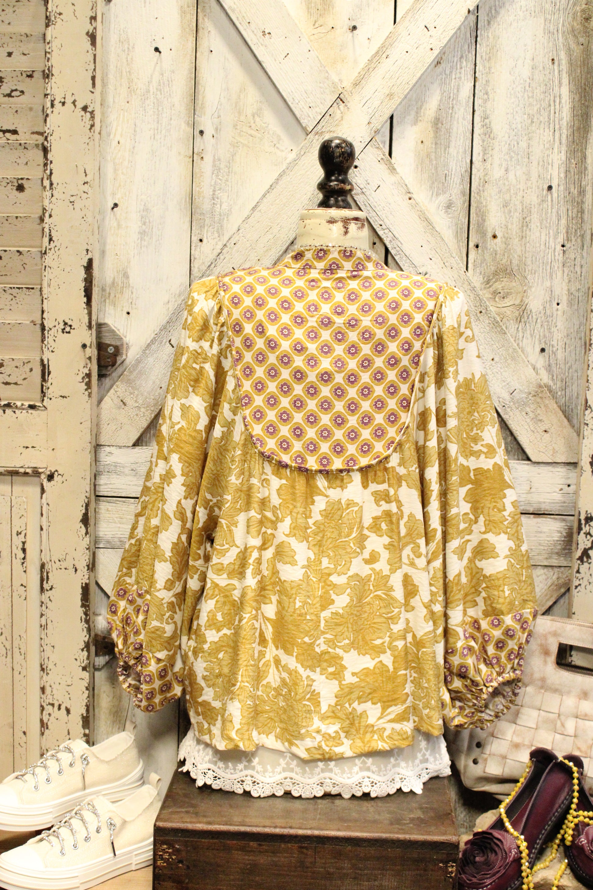 The mixed patterns add a touch of vintage charm, while the billowy sleeves and soft drape keep things easy and free. Toss it on with denim shorts, wear it loose and breezy, and top it off with a felt hat — instant magic.