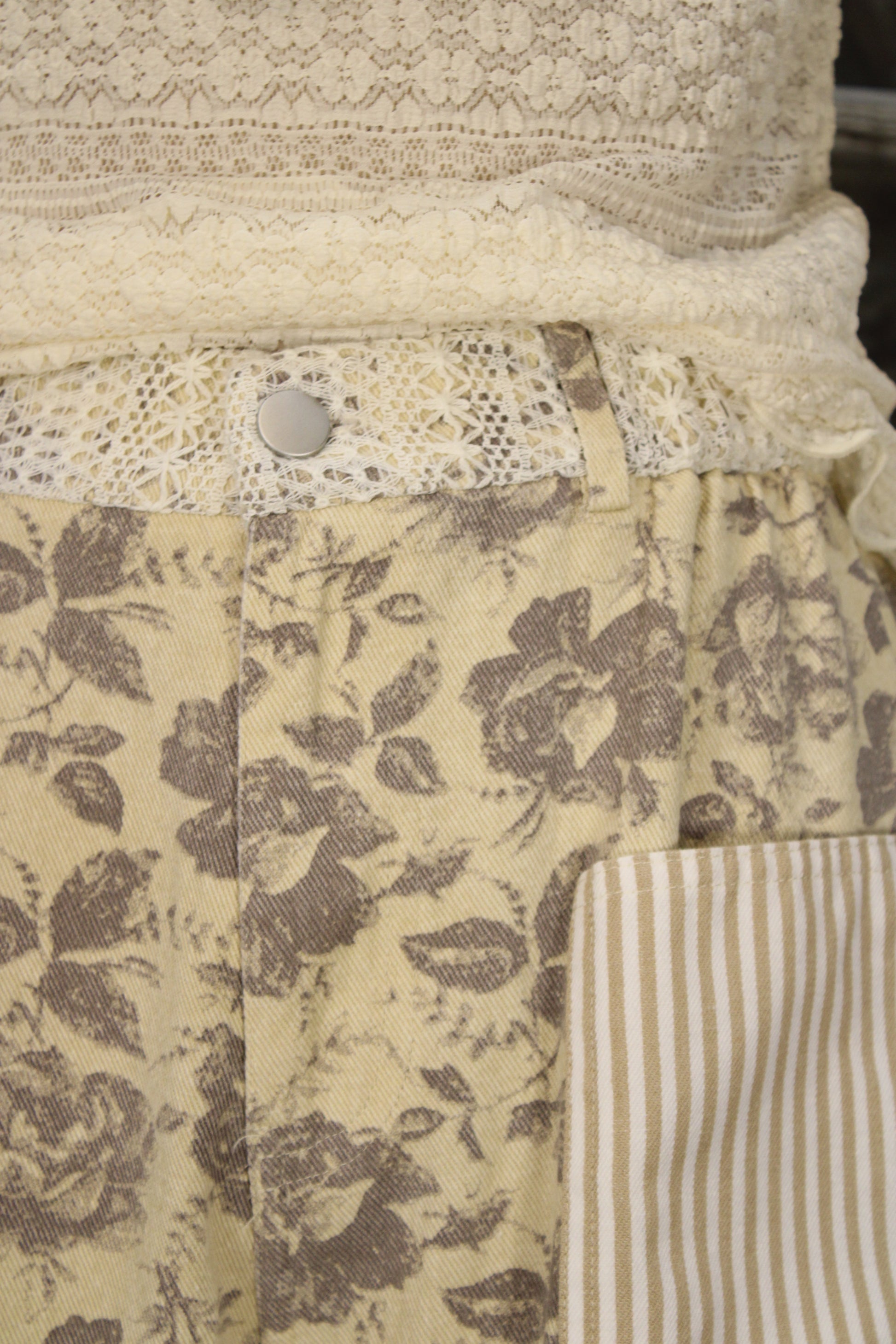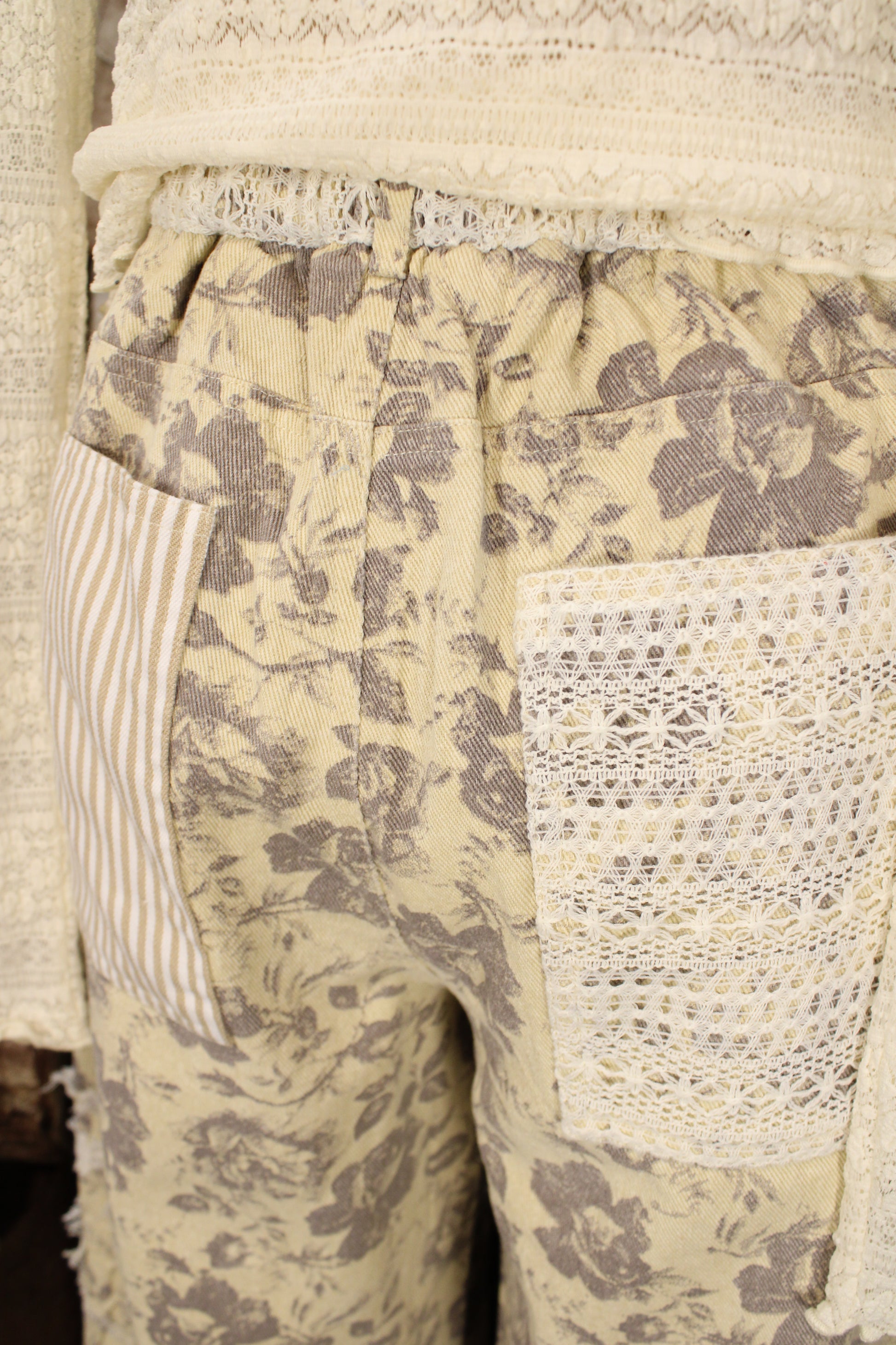 Introducing the Vintage Americana Bloom Pants by Davi & Dani! These patchwork floral pants are full of charm and personality. Featuring a soft vintage-inspired floral print mixed with lace and striped patchwork pockets, they bring together all the sweet farmhouse details we love. The relaxed wide-leg fit keeps them comfortable and easy to wear, while the unique mix of textures makes them feel extra special. Pair them with your favorite lace top or cozy sweater for an effortlessly cute, laid-back look.