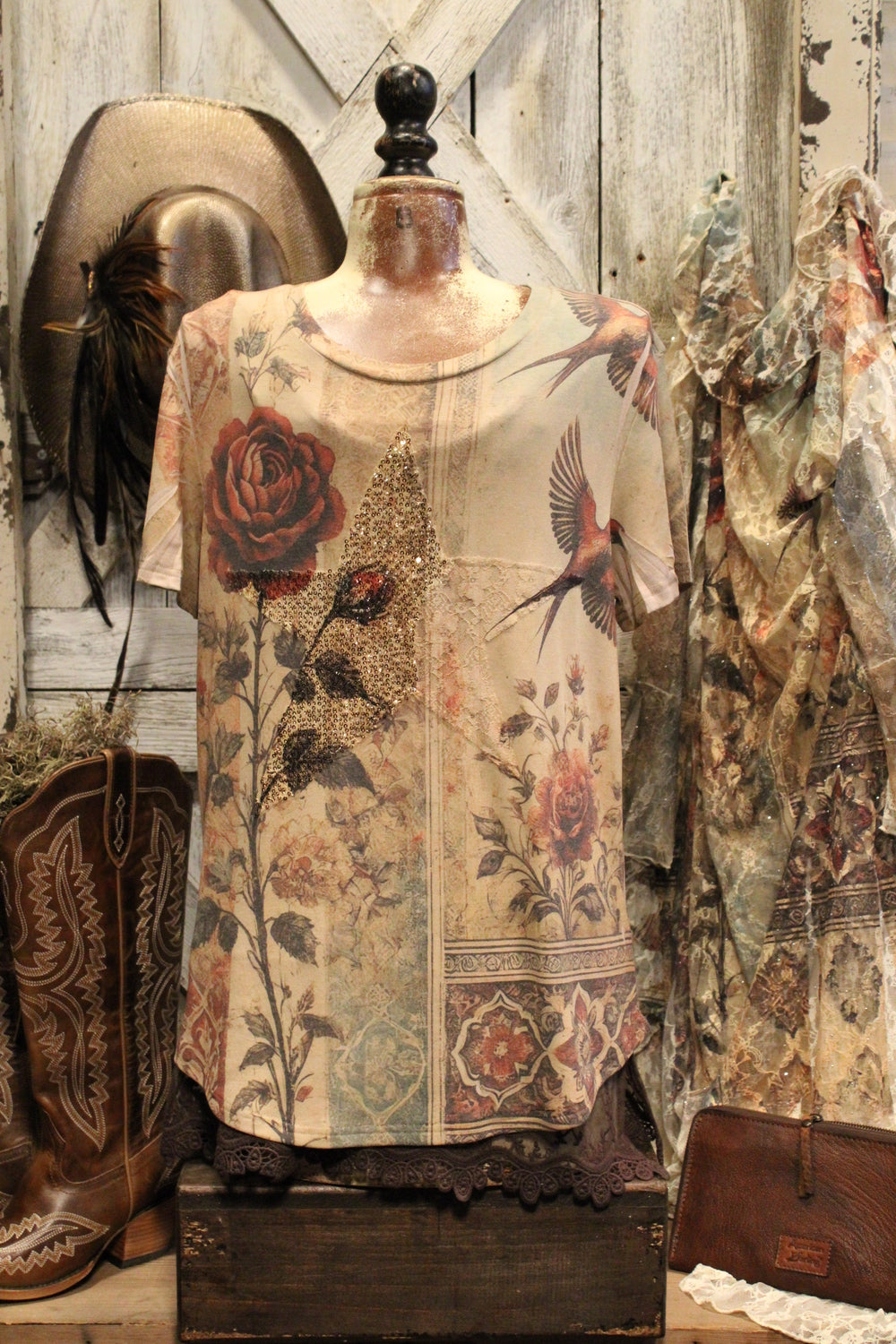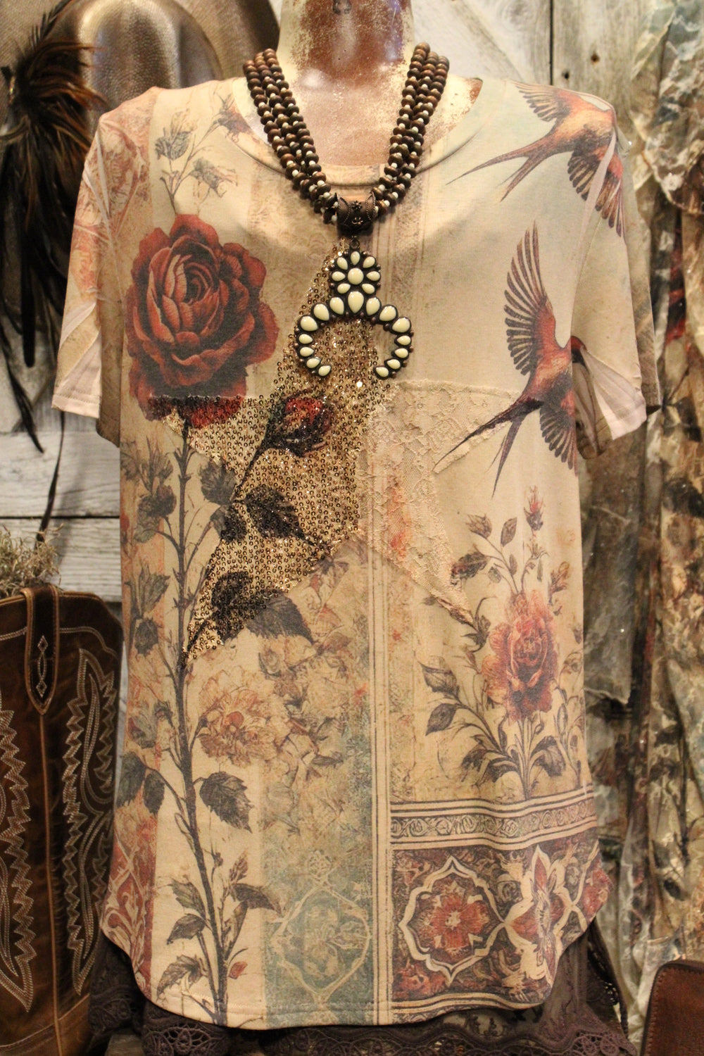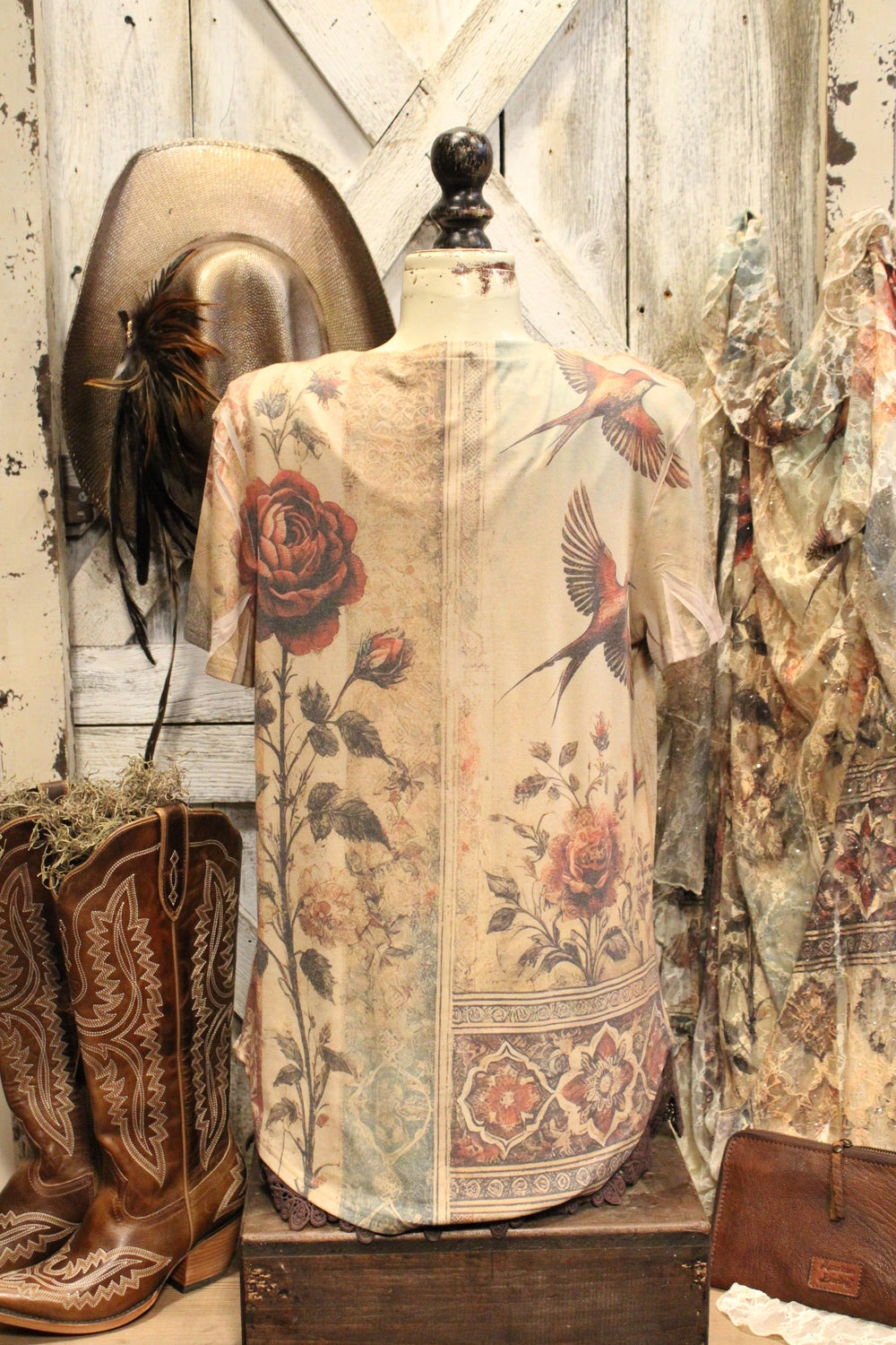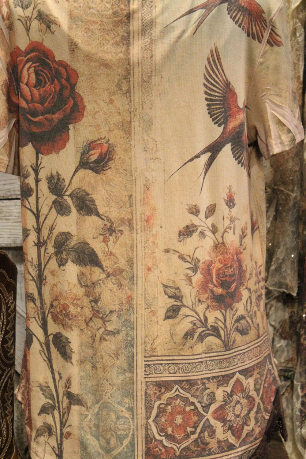 Introducing our Vintage Bird Star Tee- Rustic soul meets romantic charm, in this stunning Tee that delivers effortless beauty and timeless style. This soft, short-sleeve tee features a dreamy tapestry-style print with vintage florals, elegant swallows, and ornate patterns in a palette of muted earth tones. This tee is perfect for pairing with jeans, skirts, or under a flowing duster.