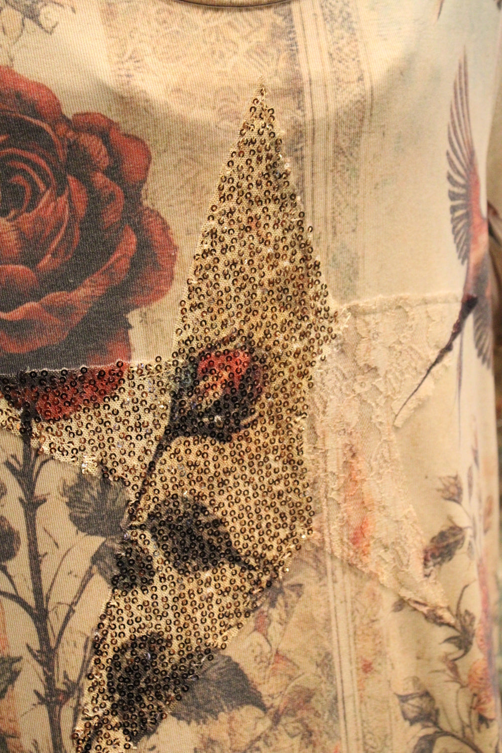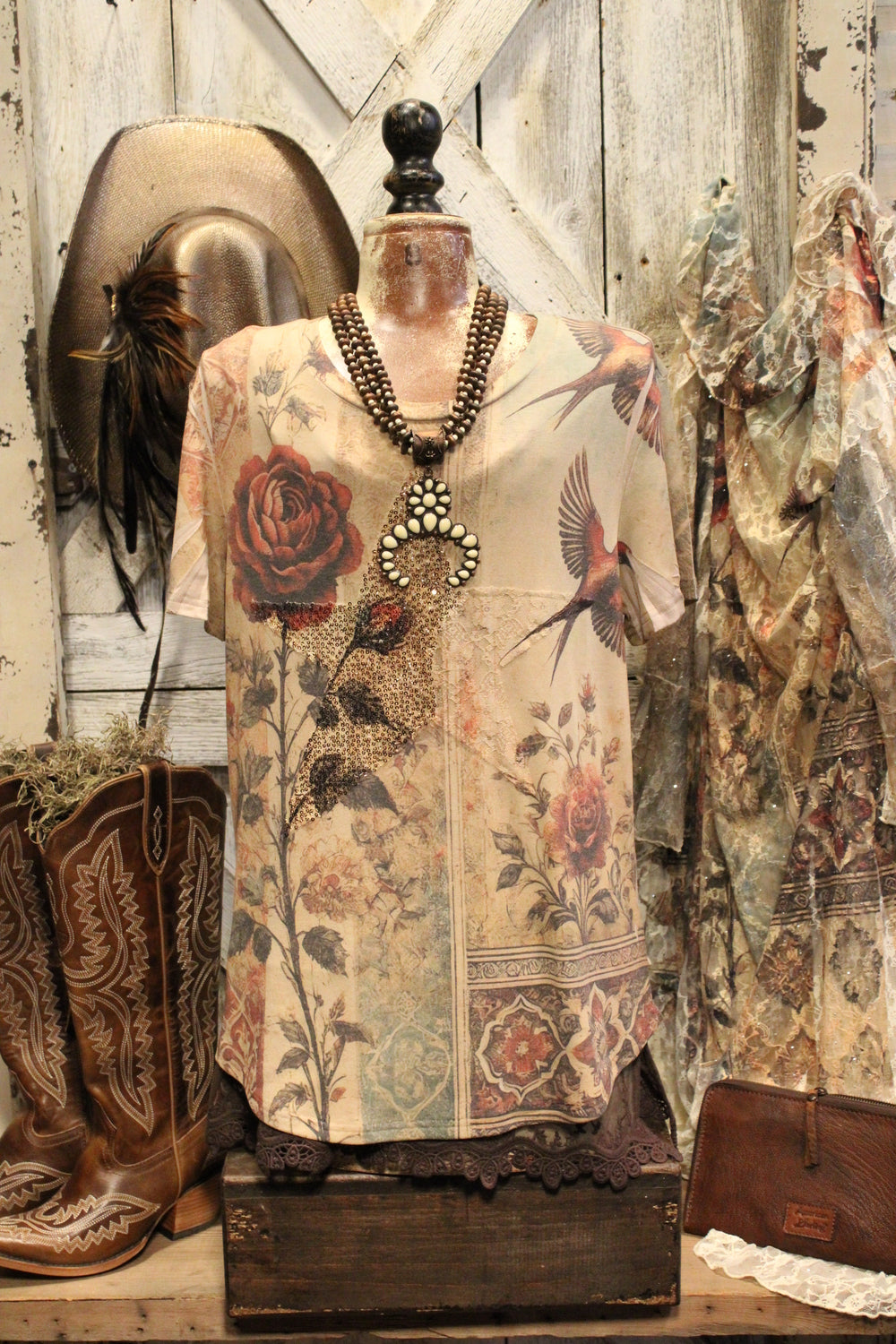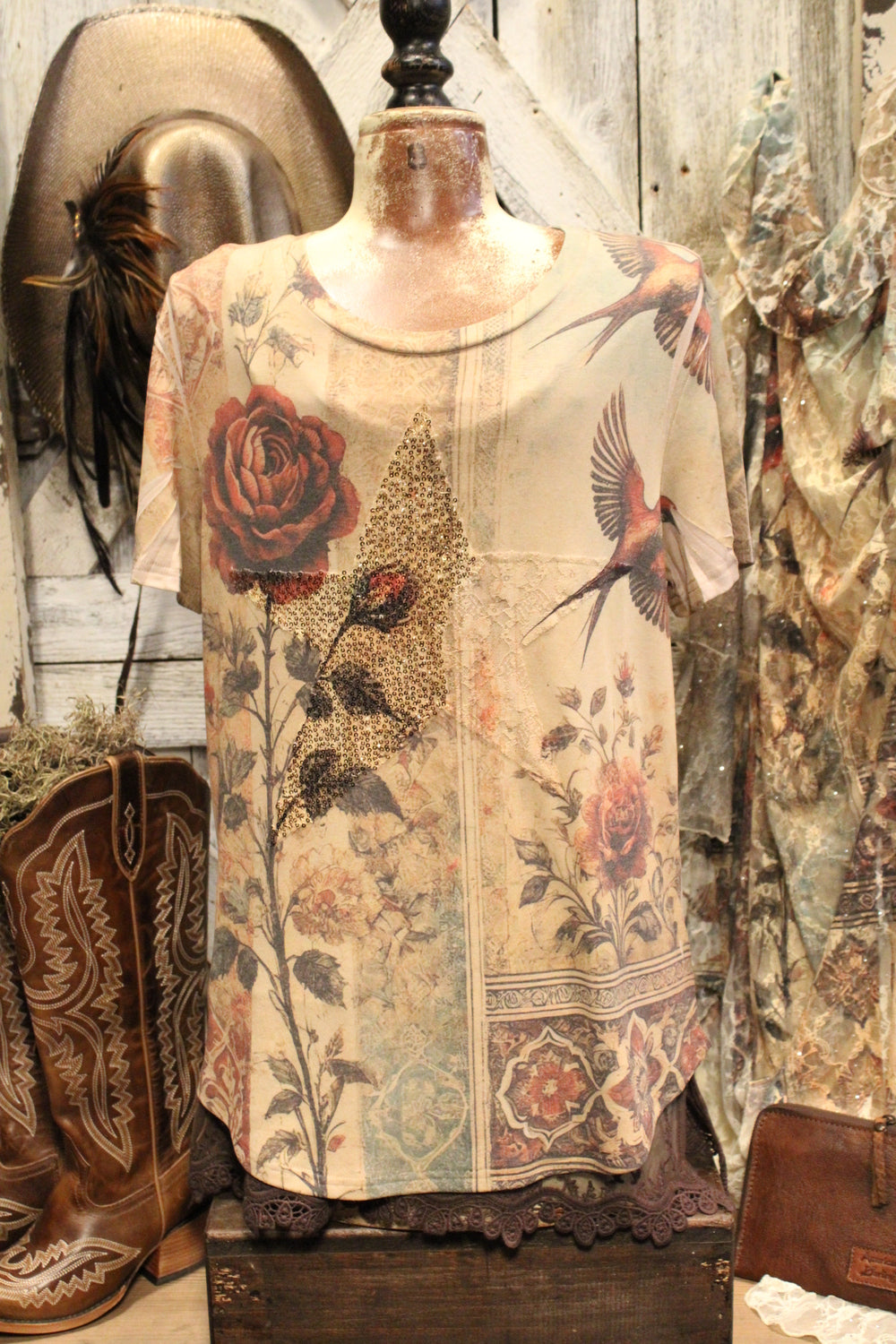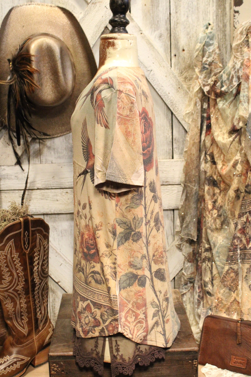Introducing our Vintage Bird Star Tee- Rustic soul meets romantic charm, in this stunning Tee that delivers effortless beauty and timeless style. This soft, short-sleeve tee features a dreamy tapestry-style print with vintage florals, elegant swallows, and ornate patterns in a palette of muted earth tones. This tee is perfect for pairing with jeans, skirts, or under a flowing duster.