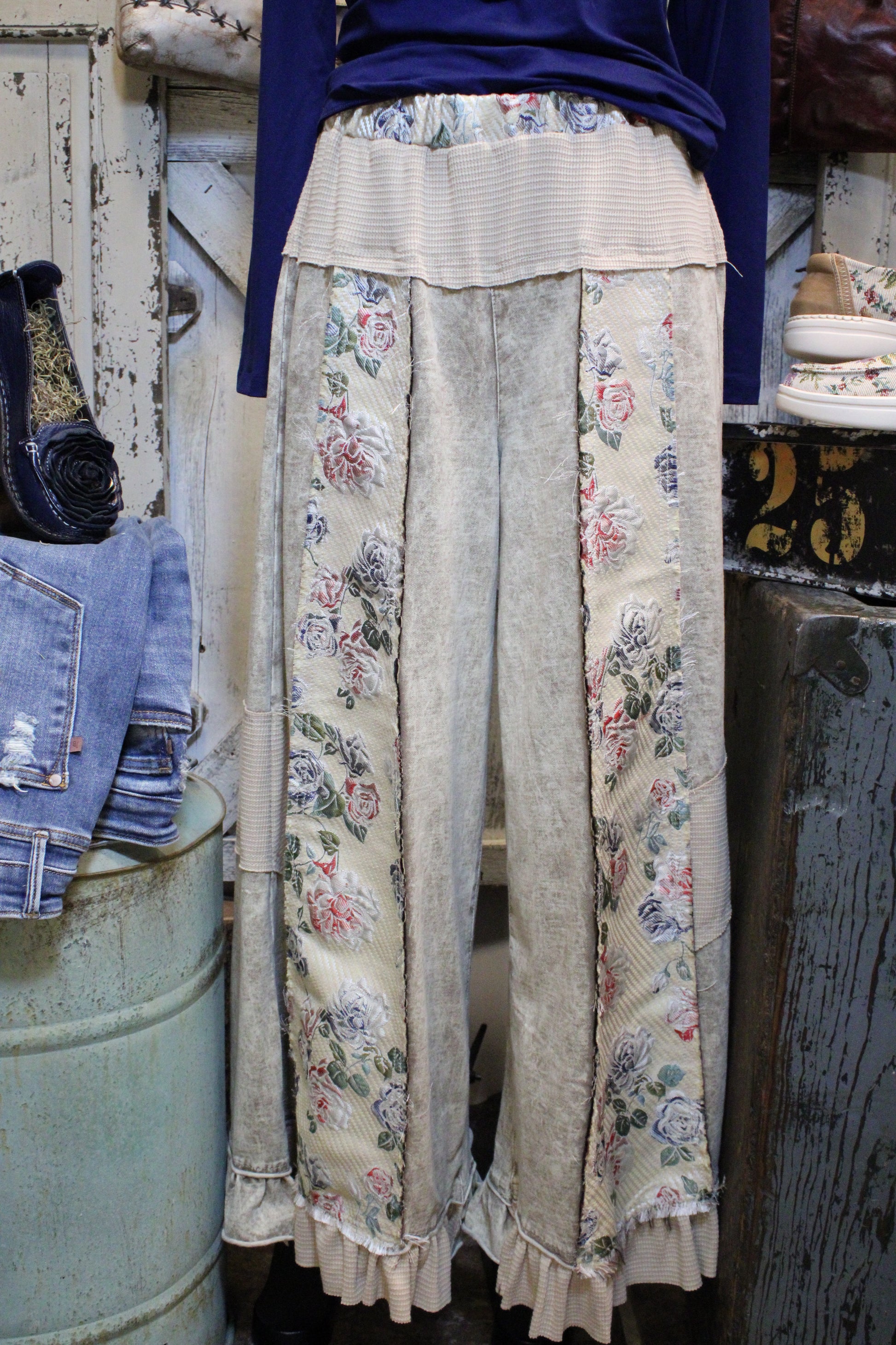 Introducing Vintage Petal Pants- These wide-leg patchwork pants bring all the vintage charm and free-spirited flair your boho heart could want. With soft floral panels, textured fabrics, and just the right touch of ruffle at the hem, they flow with every step — comfy, feminine, and full of personality.