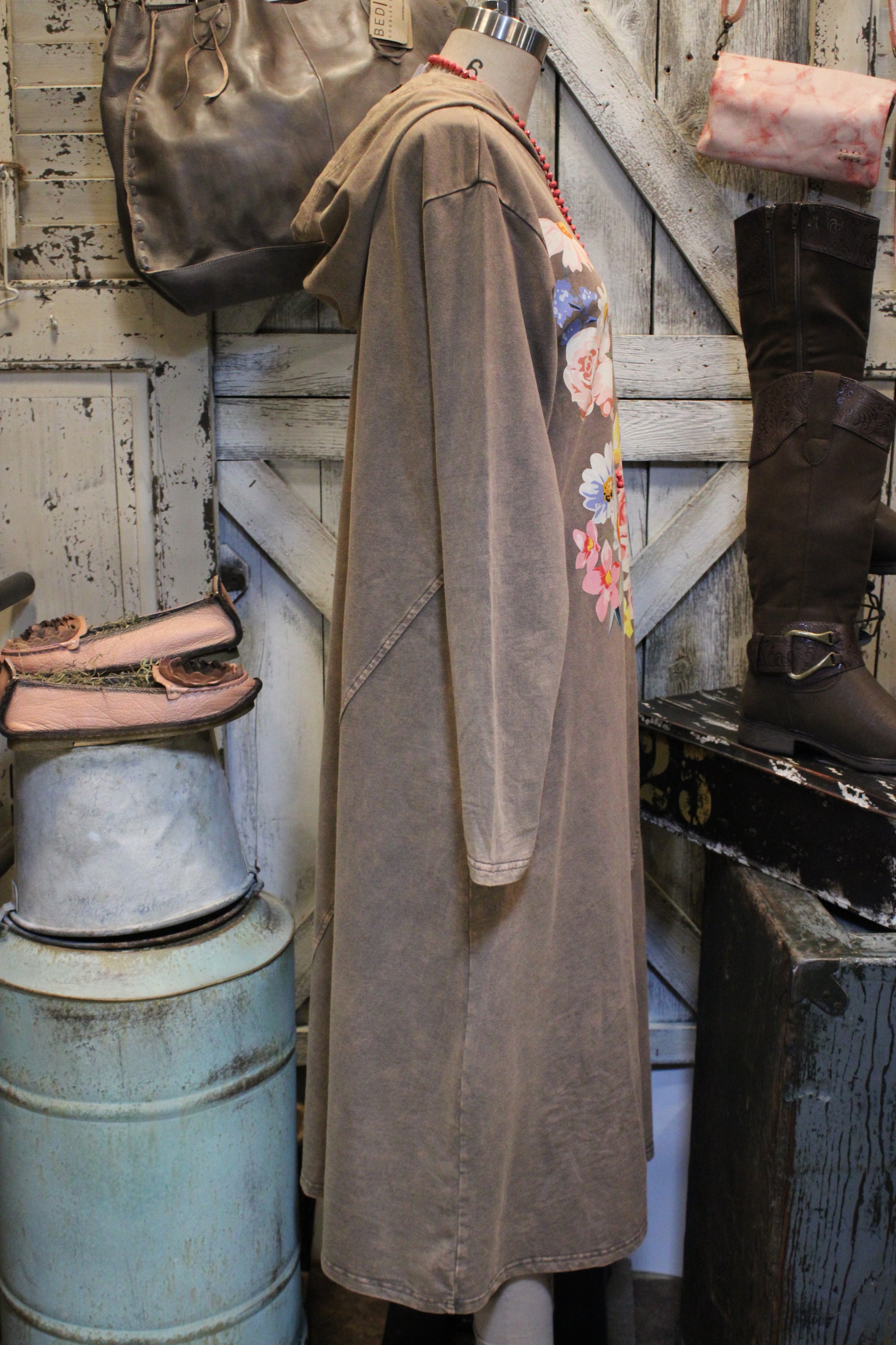 Introducing the Vintage Rose Hoodie Dress- Cozy meets cottagecore in this adorable hoodie dress! This ultra-soft mocha midi dress is made for those laid-back days when you still want to feel a little bit fancy. Featuring a relaxed hoodie style, handy side pockets, and the prettiest floral print that blooms across the front — it’s equal parts comfy, cute, and country-chic.