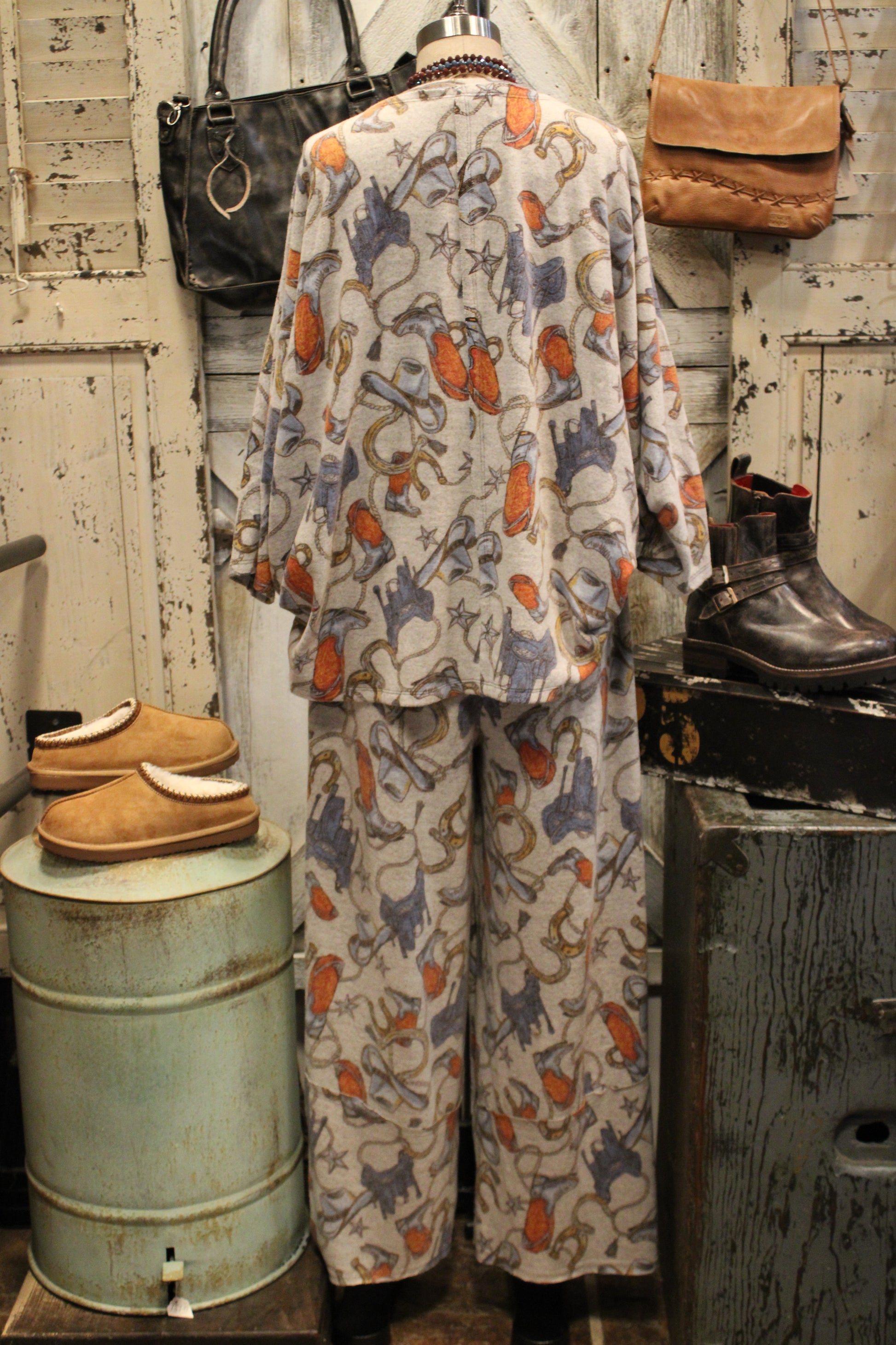 Introducing the Way Out West Pants- Kick back in comfort, cowgirl! These cozy lounge pants feature the cutest western-inspired print — think boots, hats, and stars — all on a soft, stretchy fabric you’ll never want to take off. With a relaxed wide-leg fit and drawstring waist, they’re perfect for slow mornings, coffee on the porch, or lazy nights in with your favorite blanket and pup.