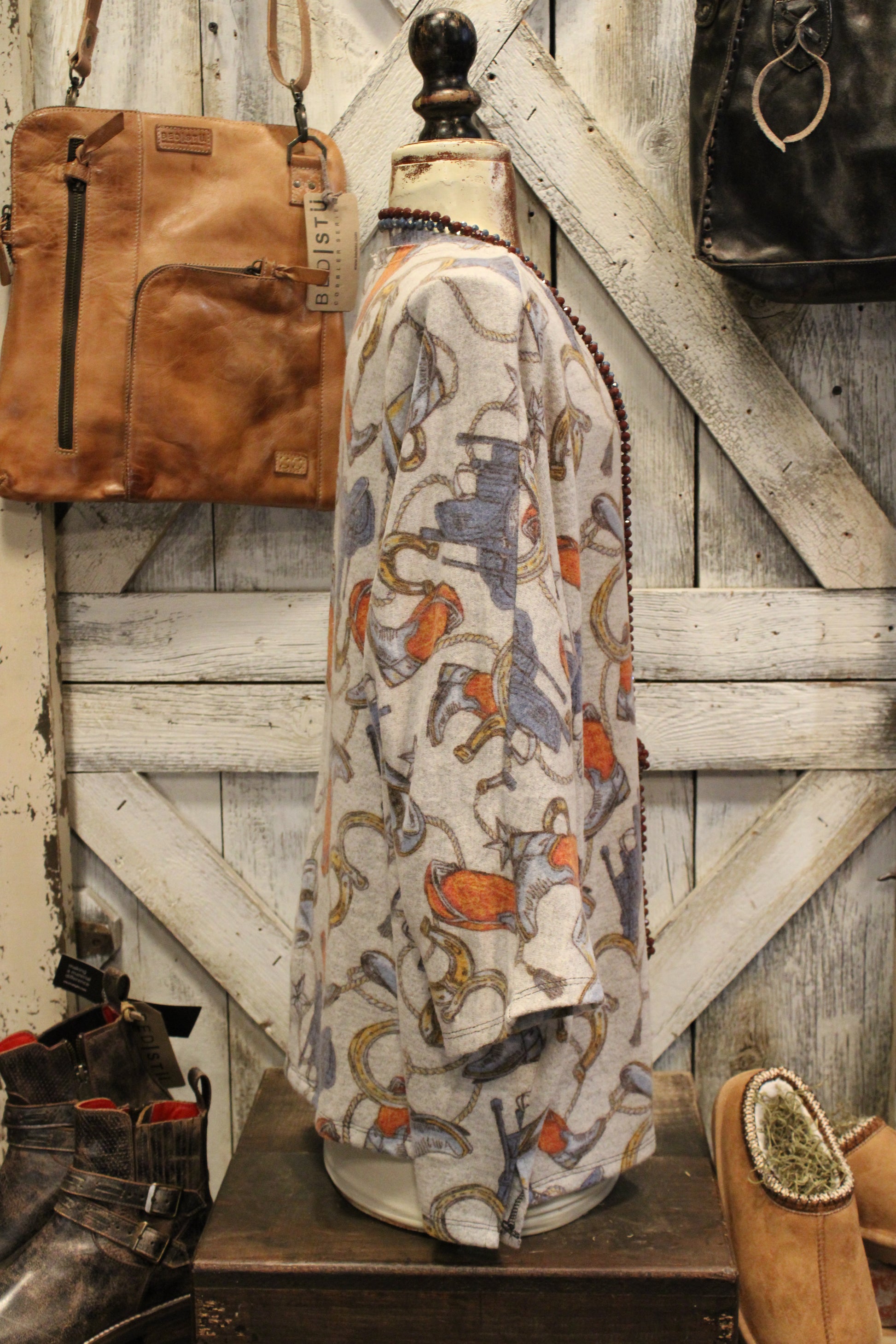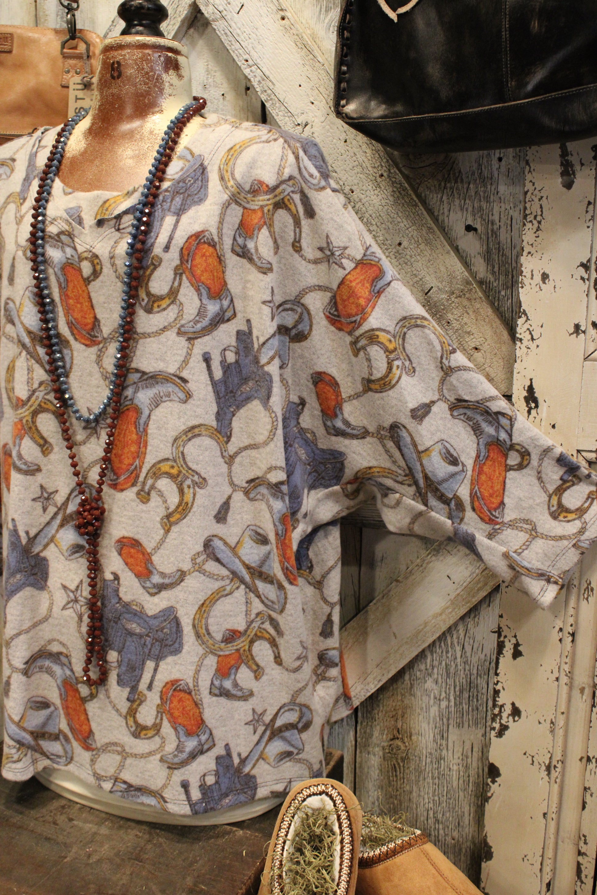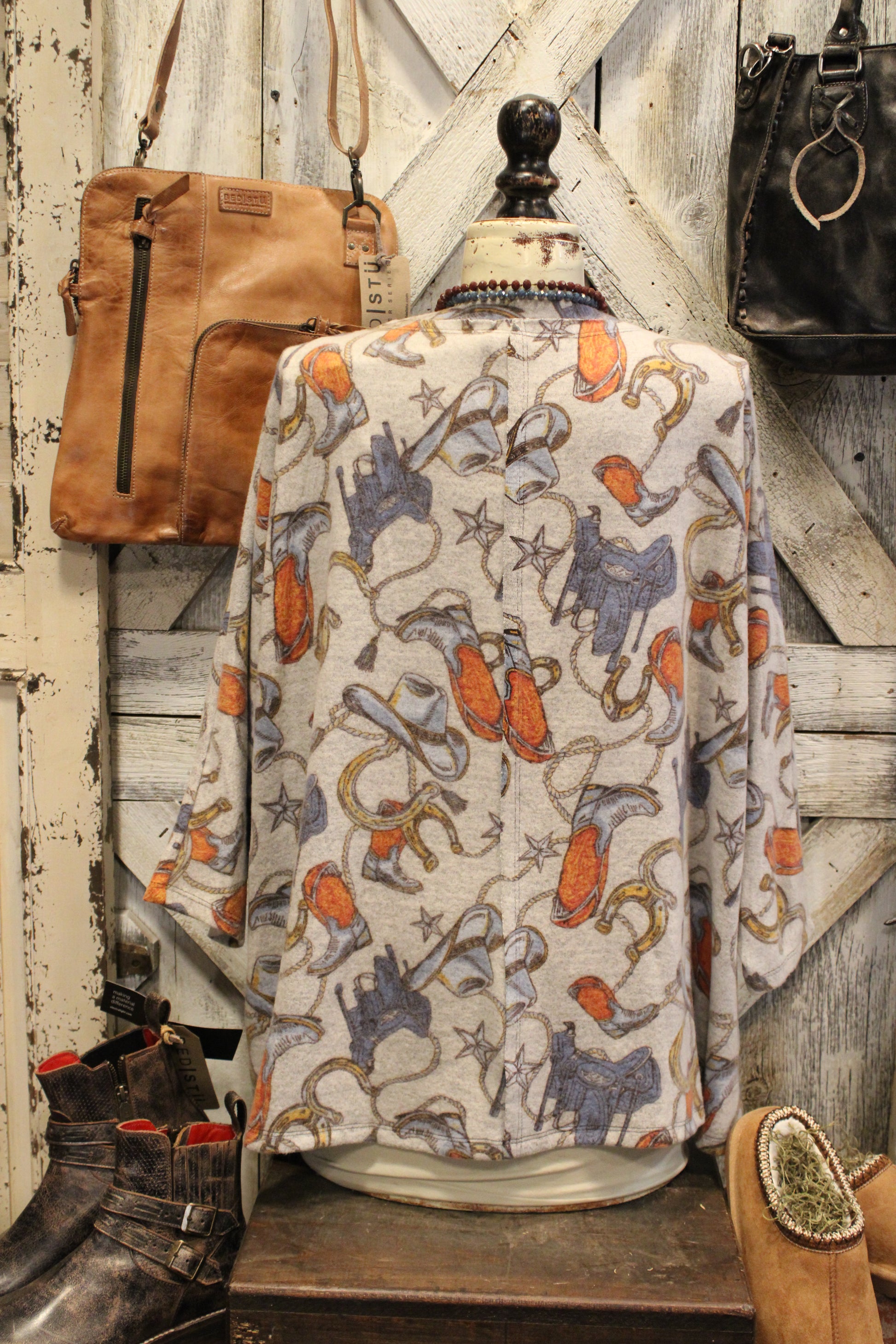 Introducing the Way Out West Top- Get cozy, cowgirl! This soft and stretchy lounge top is covered in the cutest western print — boots, hats, and stars for days! With its relaxed fit, drop shoulders, and easygoing feel, it’s made for mornings on the porch, movie nights, or sipping coffee in true farm-girl style.