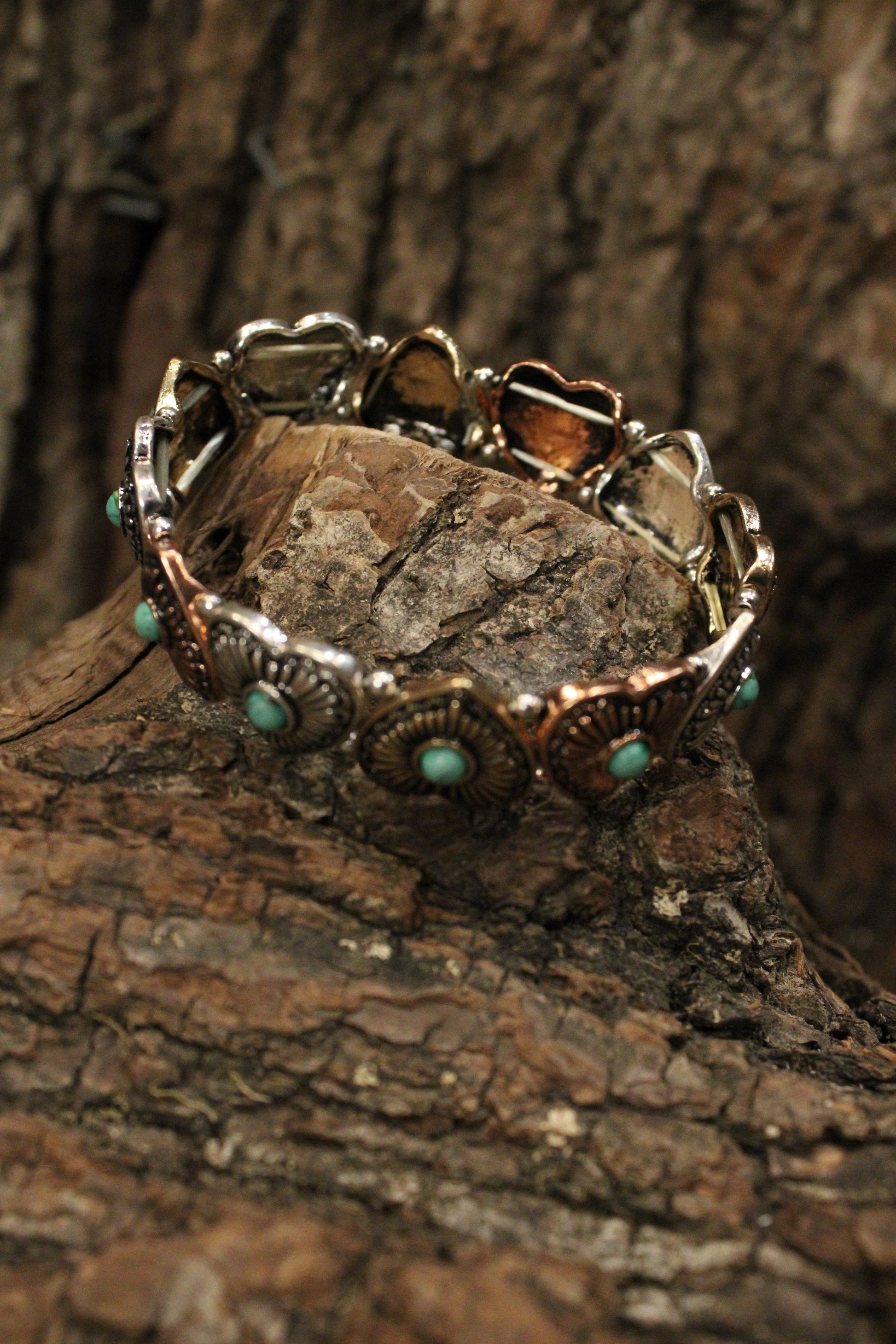 Introducing our Western Hearts Bracelet, This heart bracelet is the perfect mix of western charm and feminine detail. Featuring a row of antique-style heart conchos accented with turquoise-colored stones, it brings a bold yet romantic touch to any outfit. The mixed metal tones add depth and character, making it easy to pair with everything from denim and graphic tees to flowy boho dresses.