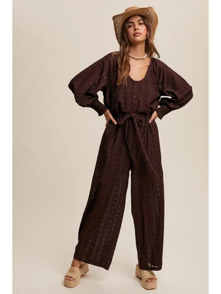 A deep scoop neckline and functional button-front closure add relaxed charm, while the wide-leg silhouette and adjustable waist tie create a flattering, effortless fit. Billowy long sleeves offer just the right amount of drama, making this jumpsuit perfect for brunch, beach days, or sunset festivals.