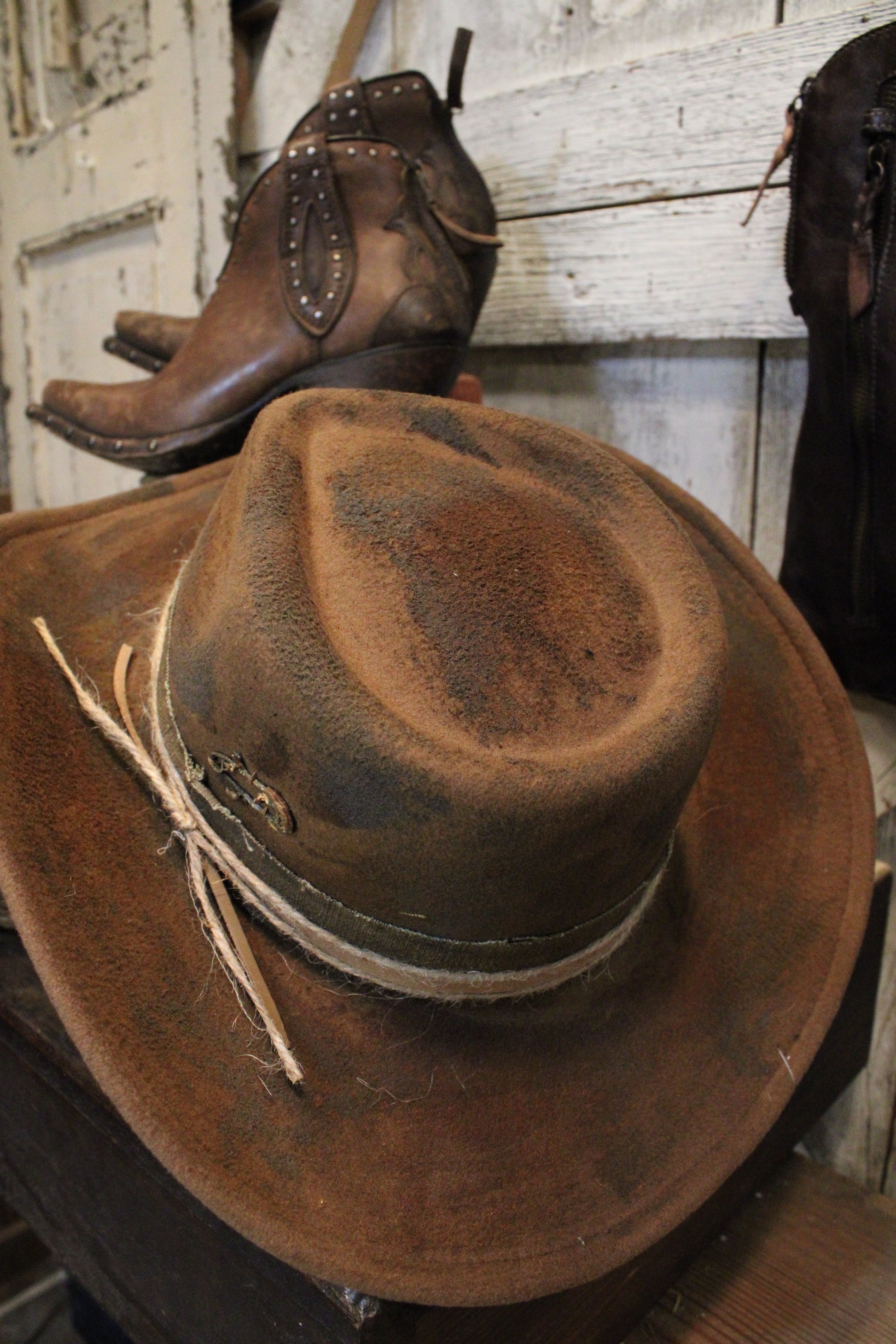 Introducing the Whiskey Feather Cowgirl Fedora - the perfect blend of rugged style and rustic soul. Crafted in a soft, weathered brown finish with a wrapped twine band and subtle metal detail, this hat brings that well-traveled, adventure-ready look that every Farm Girl loves.