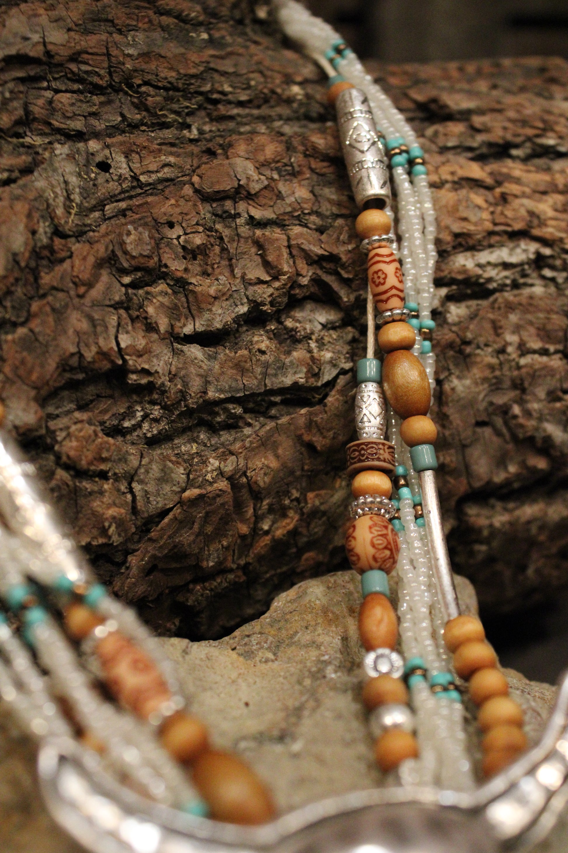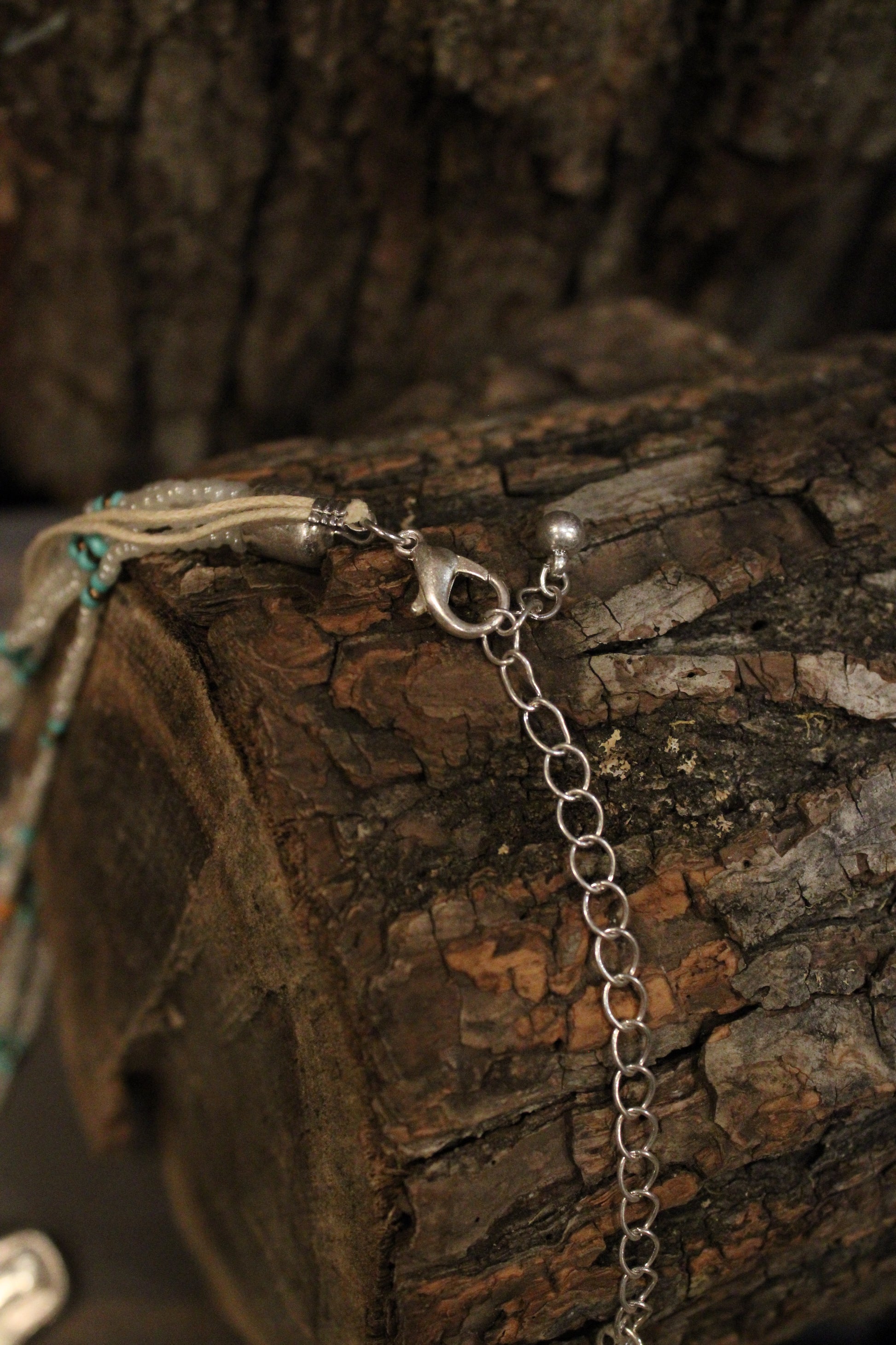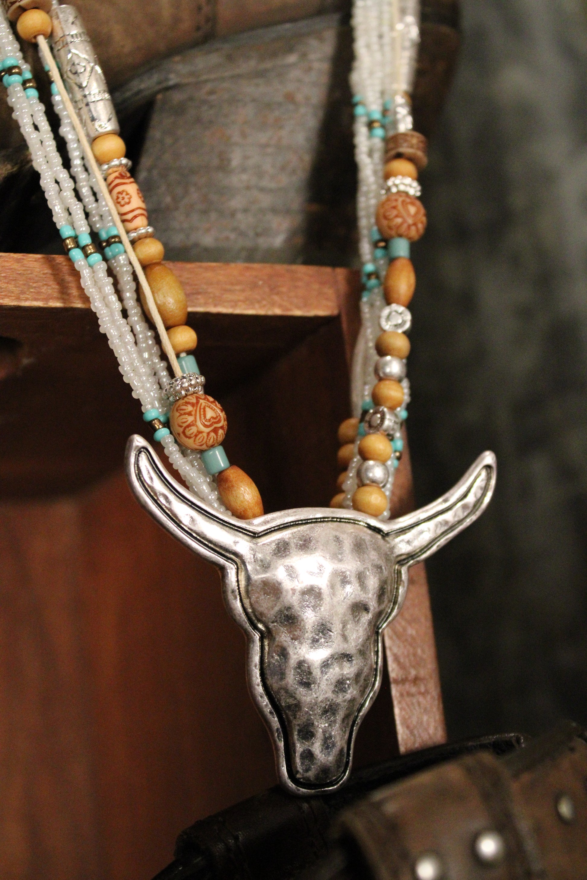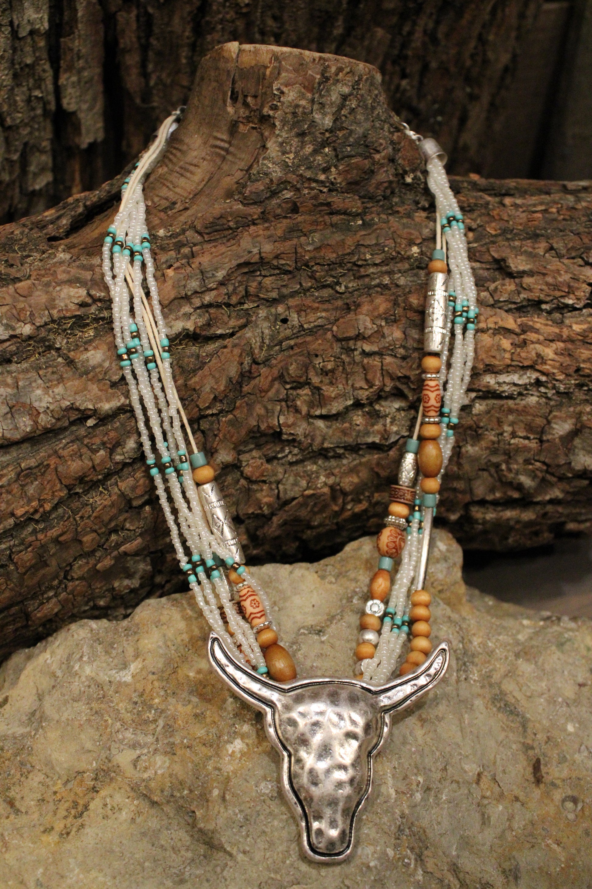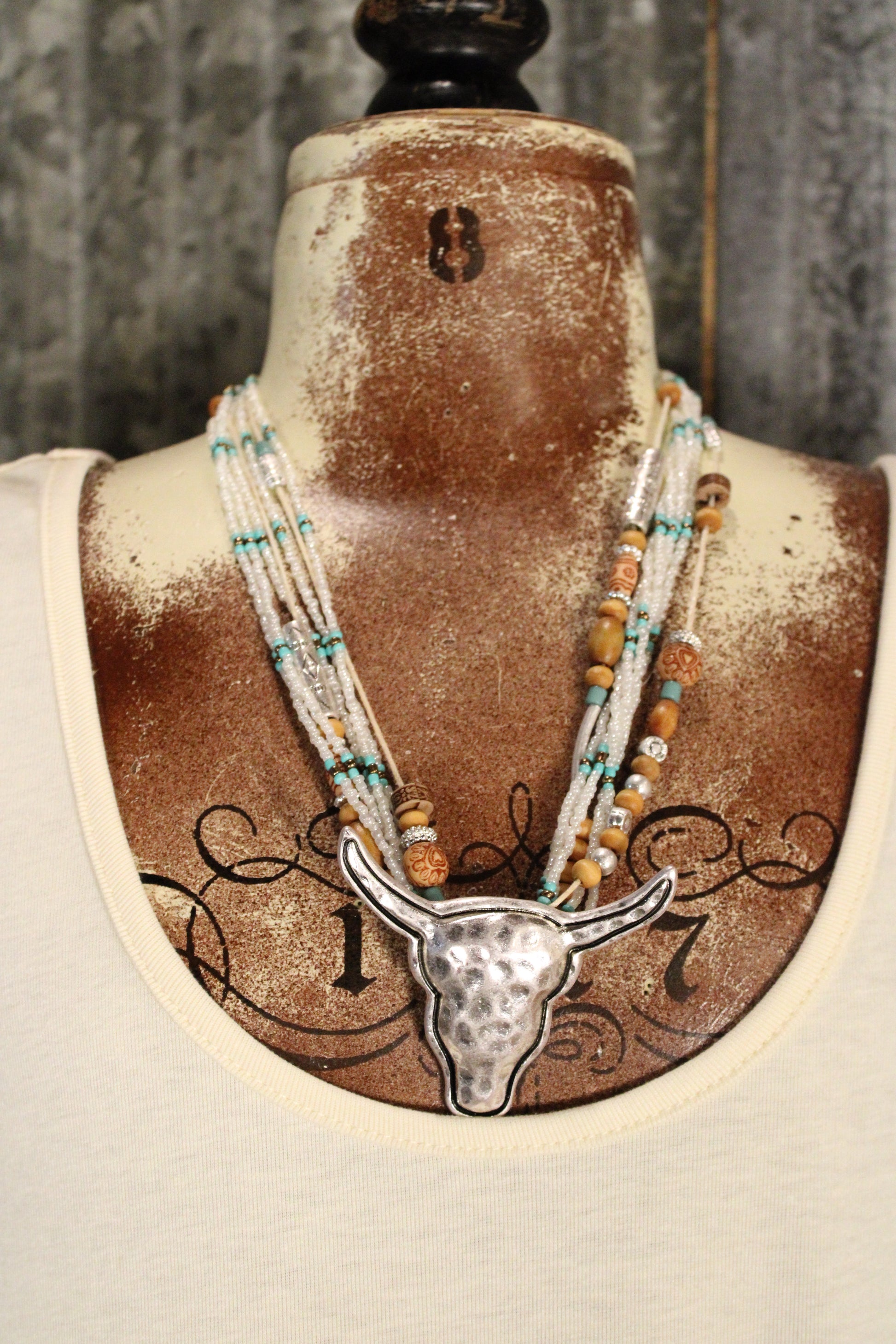 Add a touch of western charm to your outfit with our White Polished Prairie Longhorn Necklace, This statement necklace brings bold western spirit with a beautifully layered, handcrafted feel. Designed with strands of delicate beads in soft neutrals and turquoise accents, it creates rich texture and eye-catching detail throughout. The look is finished with a striking longhorn pendant in a hammered silver-tone that anchors the piece with true cowgirl character.