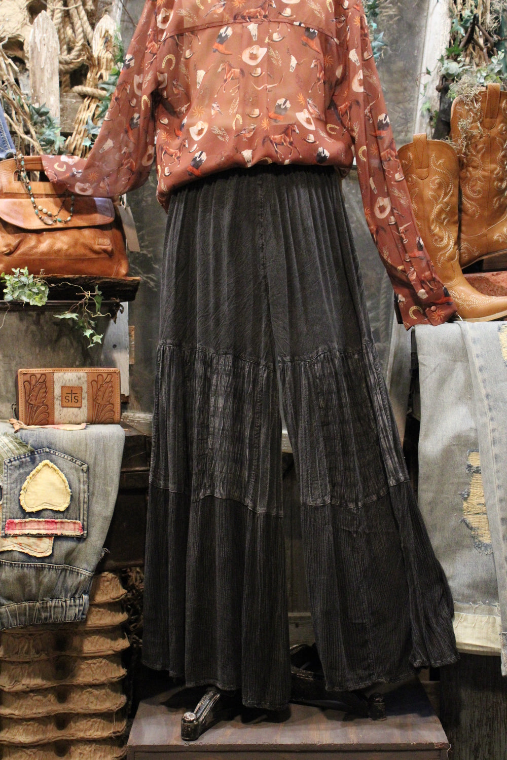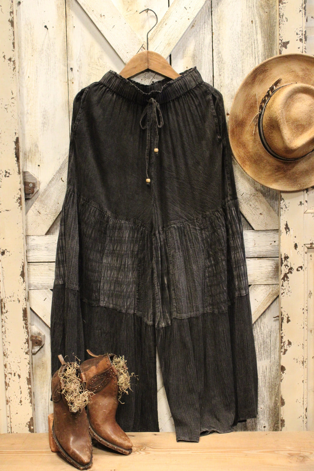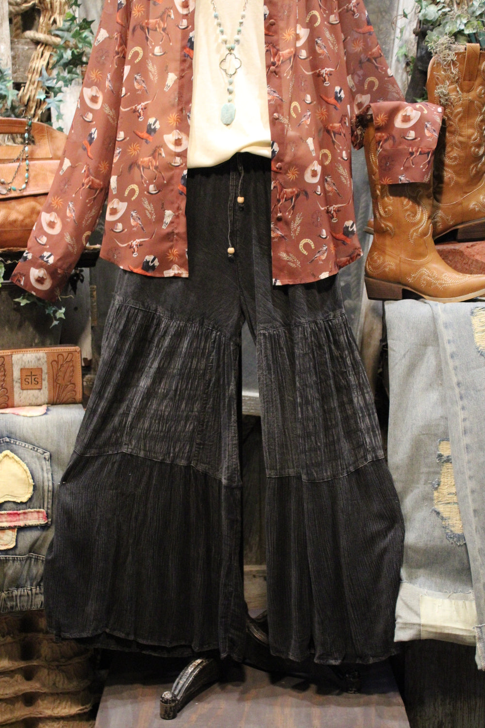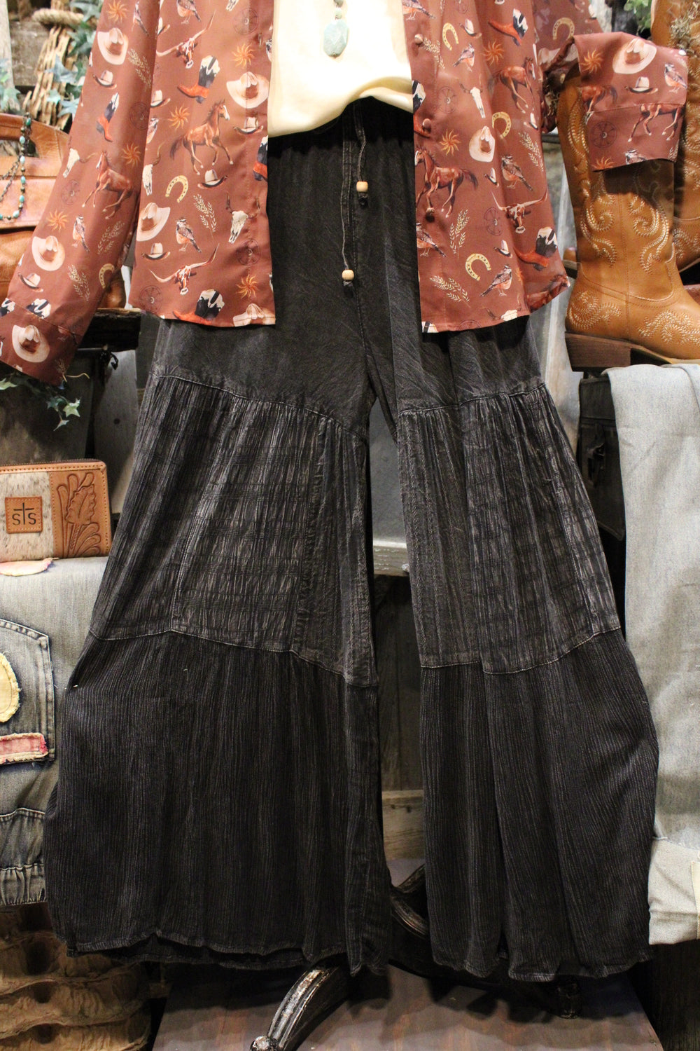 Wiggle Wagon Black Pants- Flowy, bold, with a free-spirited edge, these pants are made for movement and style. Crafted from lightweight, breathable fabric, they feature a soft crinkled texture and a wide-leg that creates a dramatic, easygoing look.