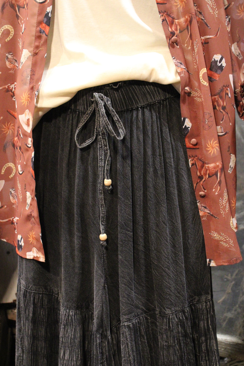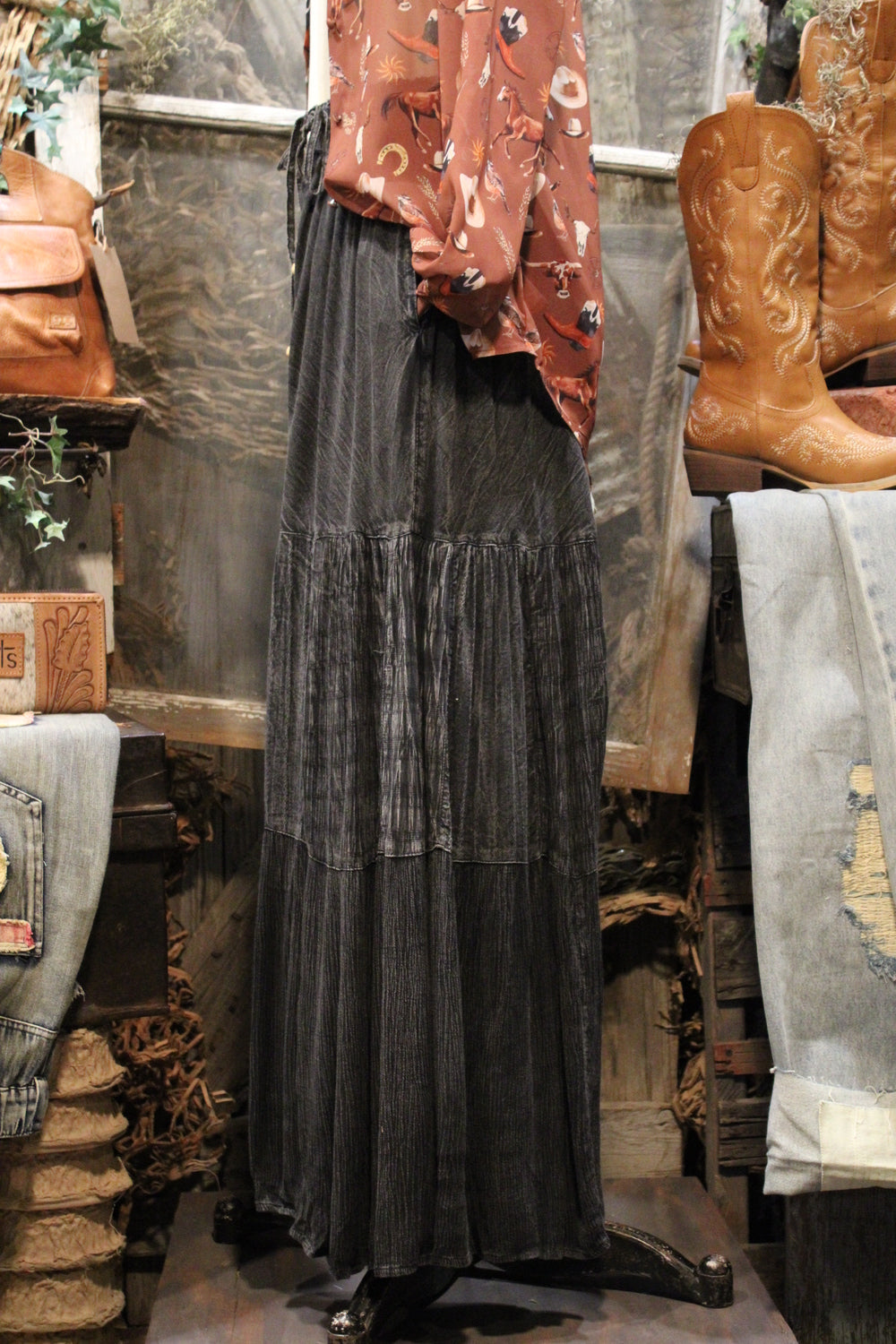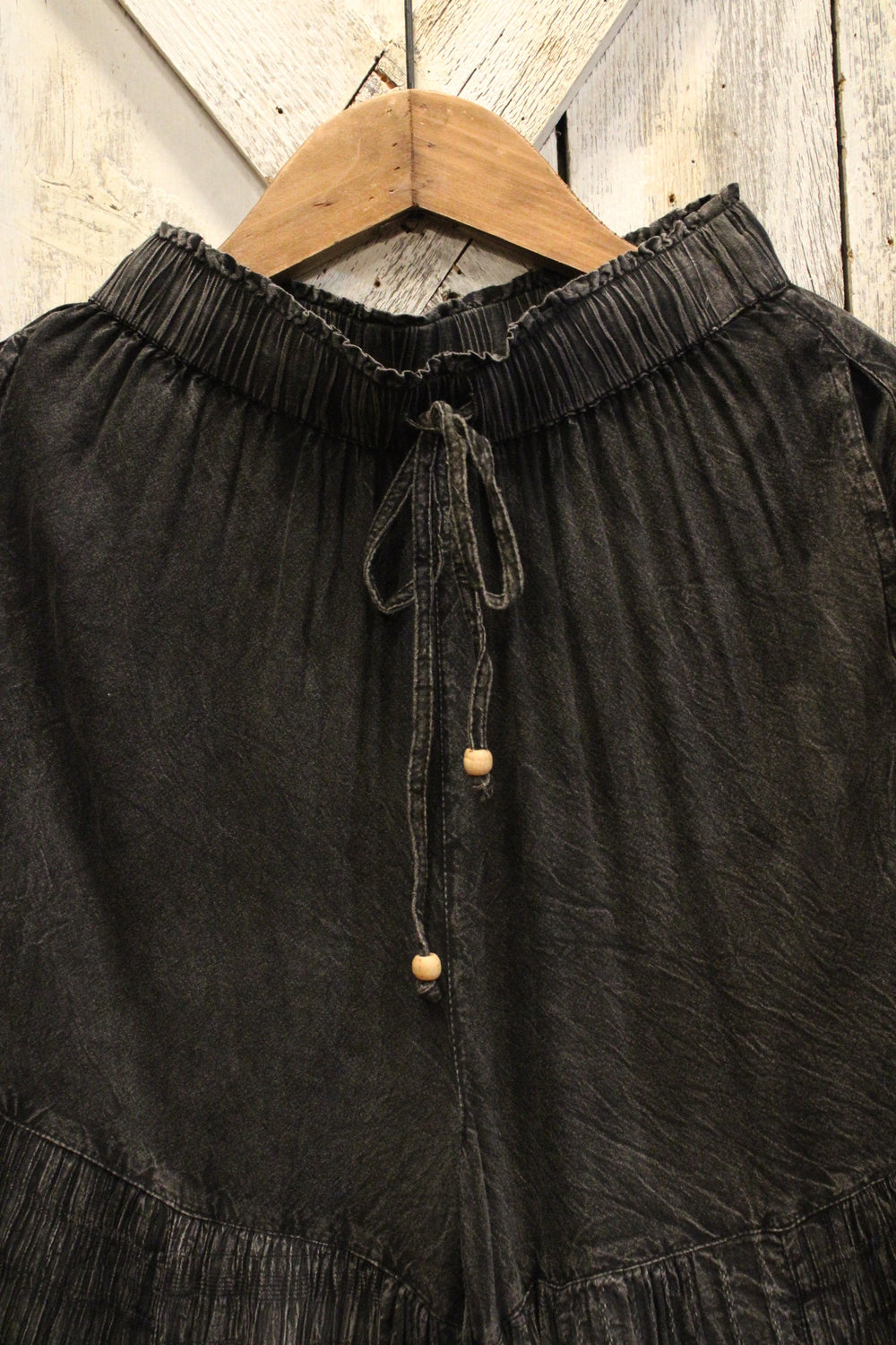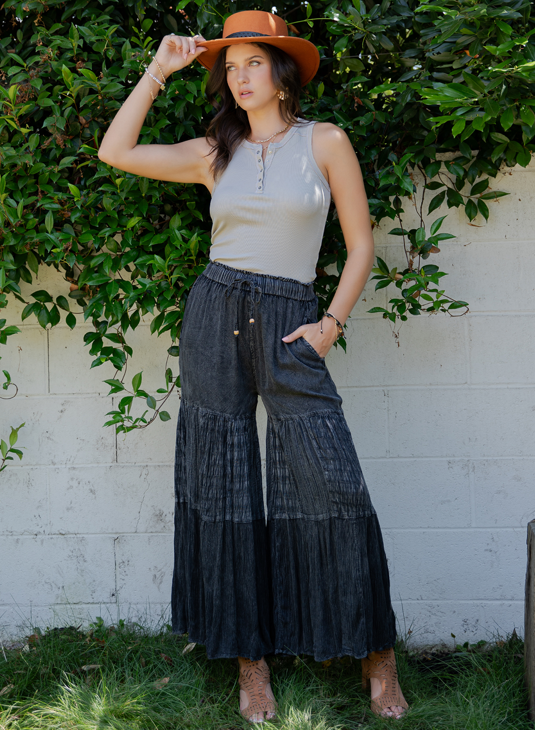 The tiered design adds dimension and visual interest, while the washed black finish brings a naturally faded, stylish vibe. With an elastic waistband and adjustable drawstring, these pants offer a customizable fit that feels as good as it looks. Pair them with a simple tank or cropped tee for an effortlessly chic ensemble.