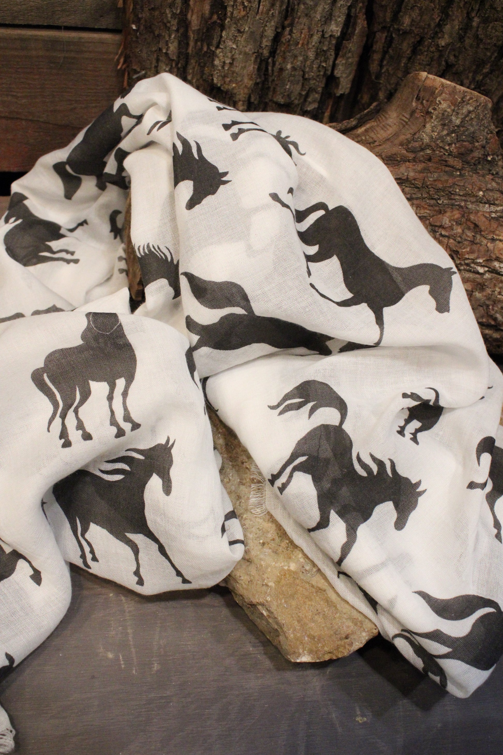 Introducing the Wild And Free Scarf, Add a little western soul to your look with this lightweight horse print scarf. Featuring a soft ivory background and bold galloping horse silhouettes, this scarf brings a rustic, free-spirited feel that fits right in with farm-girl style. The airy fabric drapes beautifully, making it easy to wear year-round.