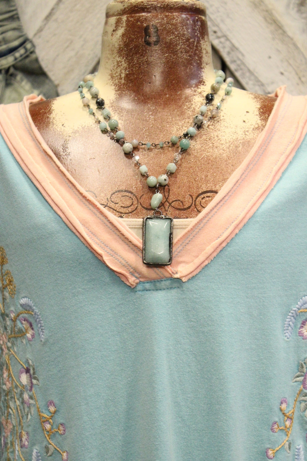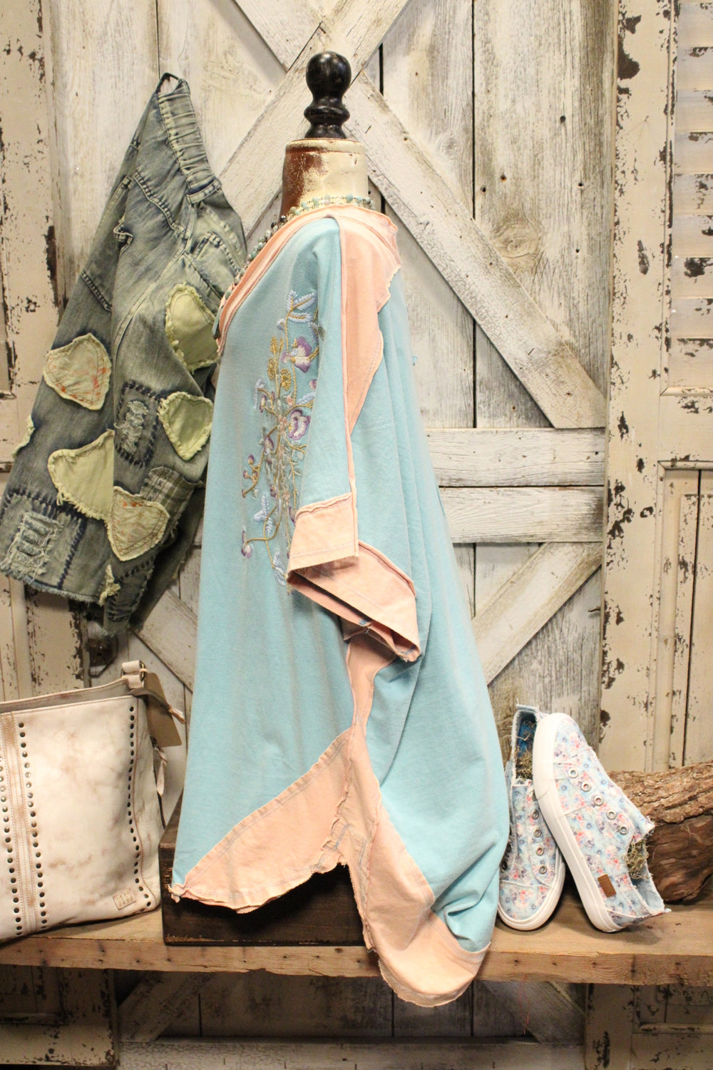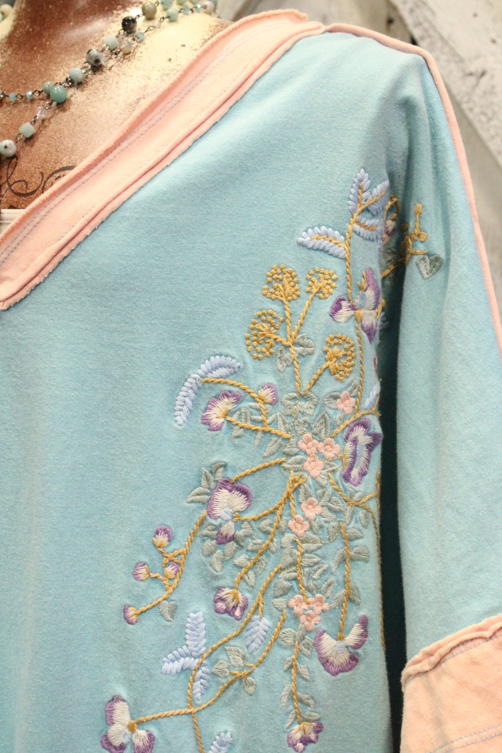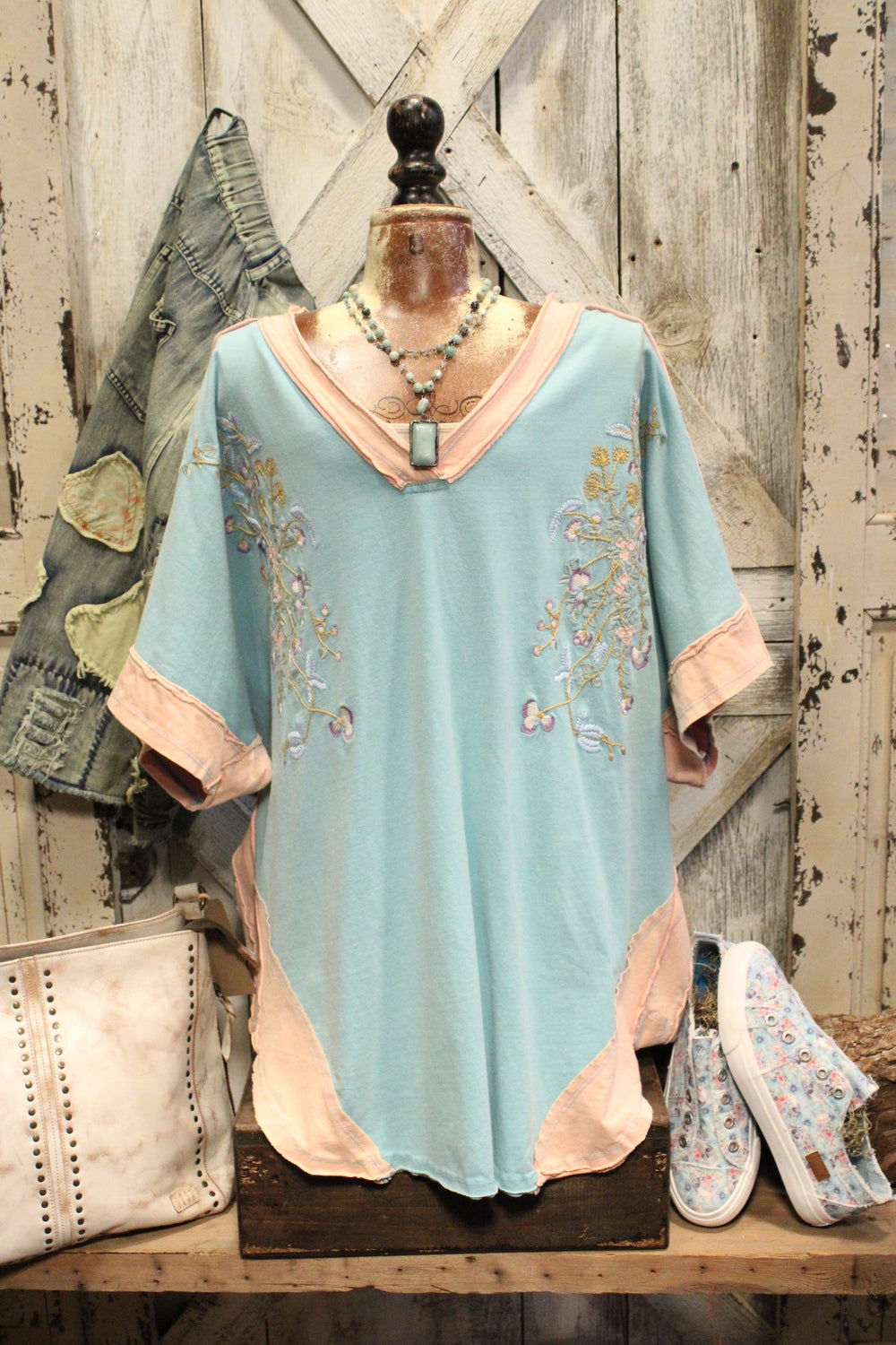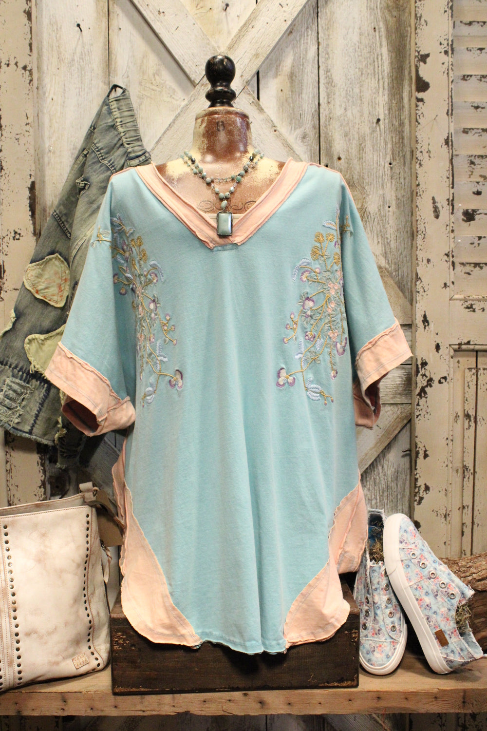 Introducing the Wild Blooms Tunic- Soft, flowing, and effortlessly charming — this embroidered tunic brings boho vibes with a touch of vintage soul. Crafted in a dreamy blue mist fabric with blush pink accents, it features delicately stitched floral embroidery that dances along the sides, adding just the right amount of color and detail.