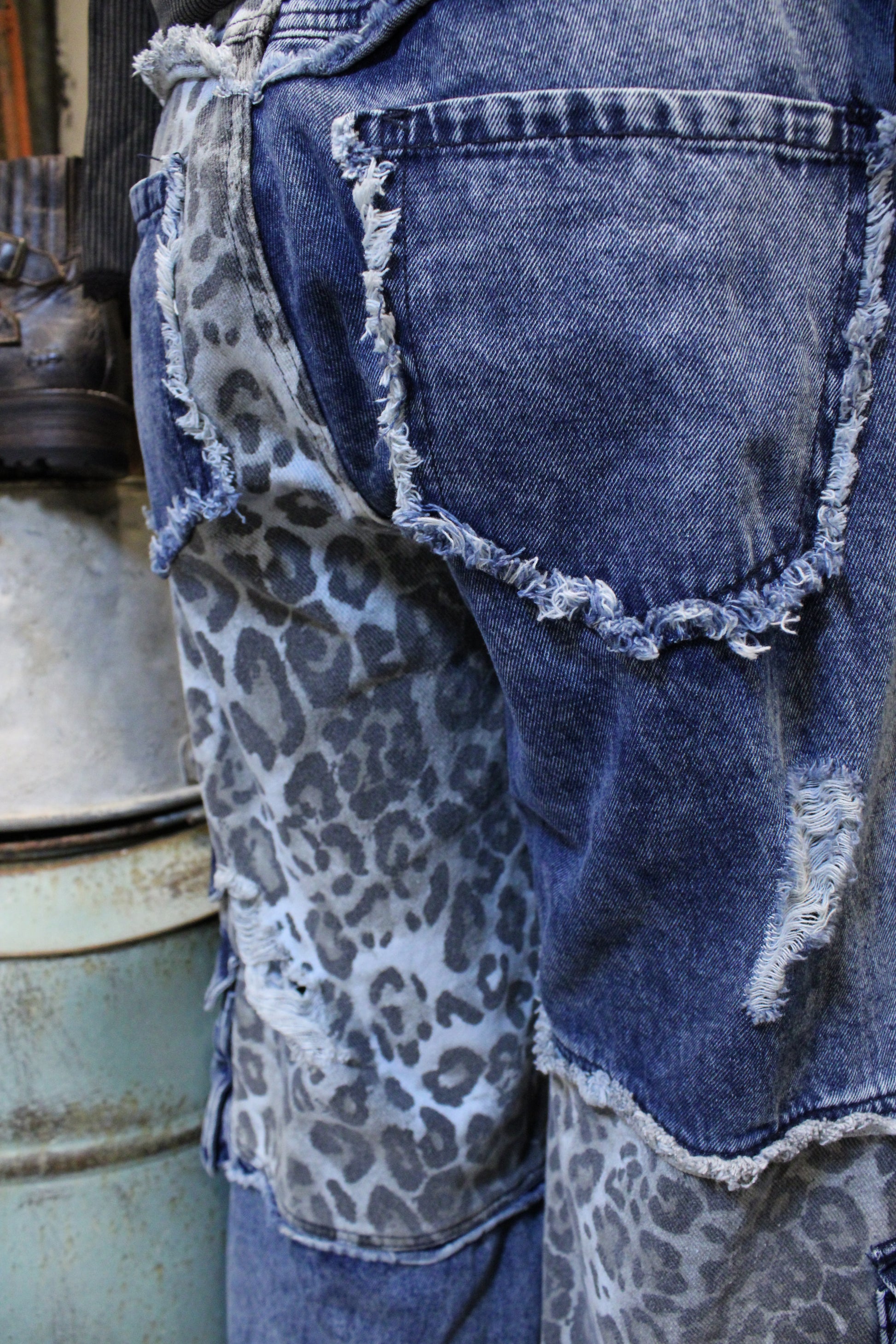 Introducing the Wild Stitch Jeans- These aren’t your average denim—they’re a fierce mashup of bold leopard print, frayed edges, and vintage-inspired patchwork that screams personality.