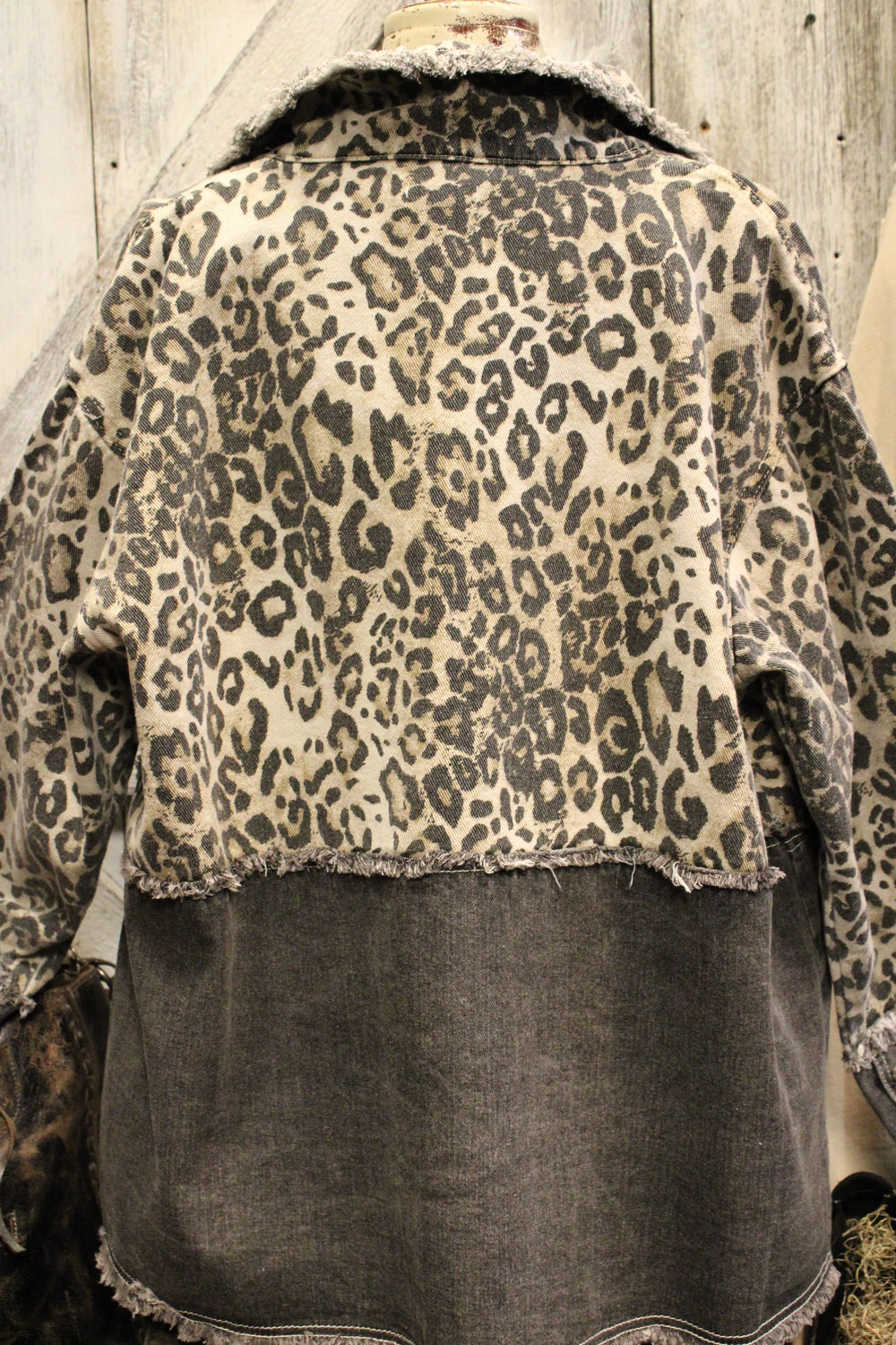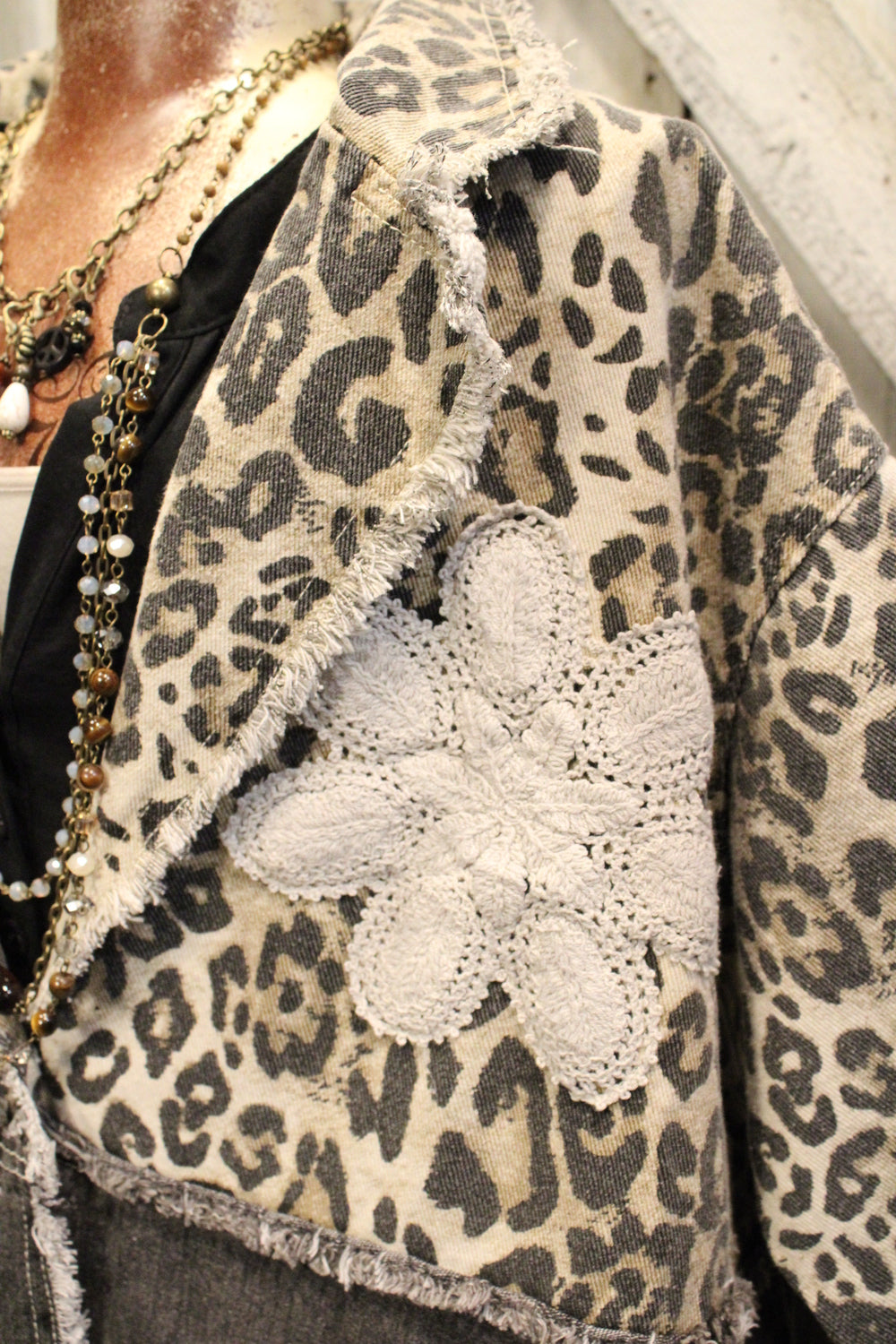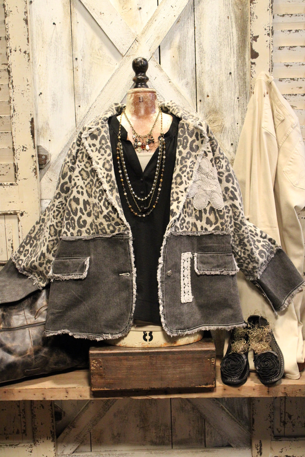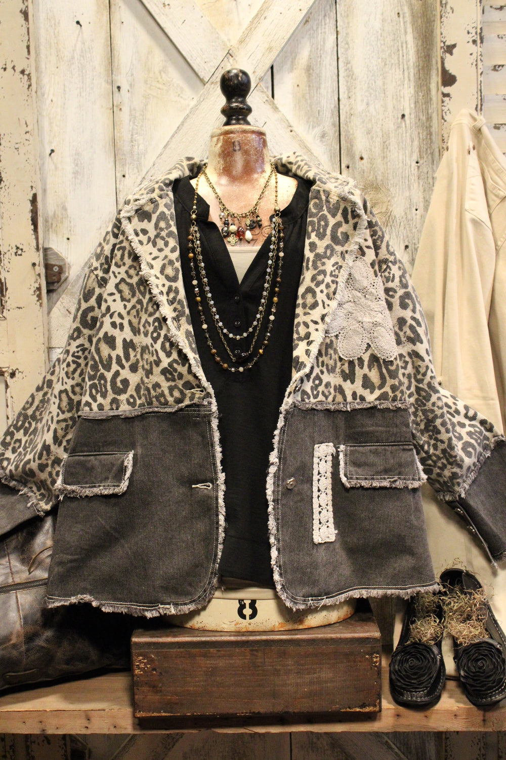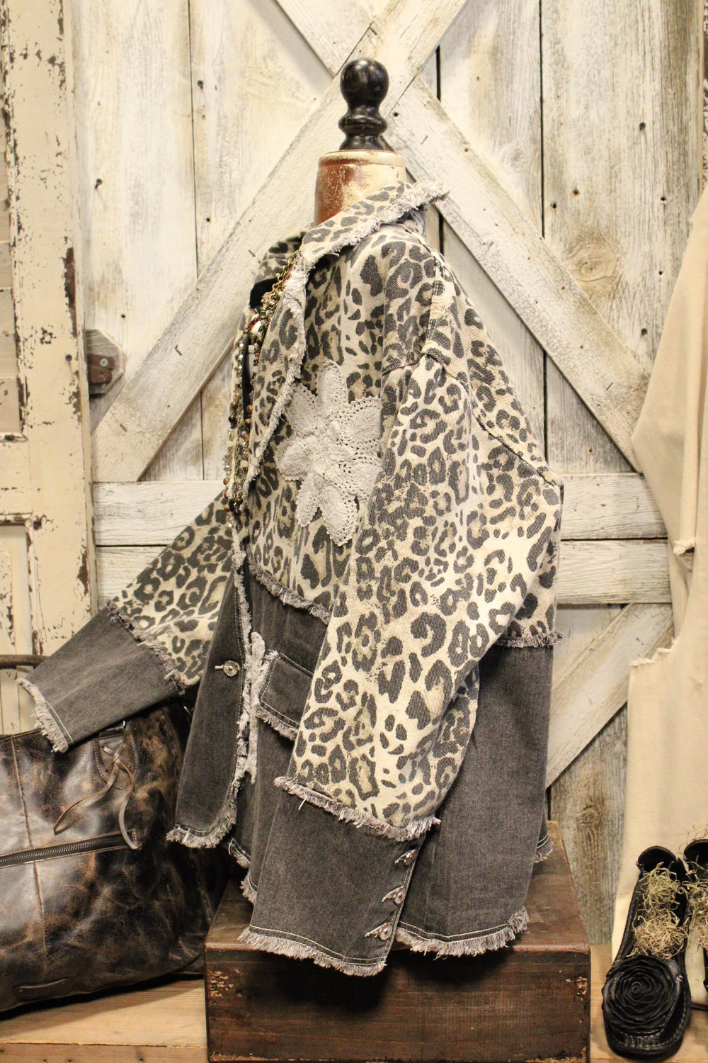 Introducing the Wild Thing Jean Jacket - a standout piece for the modern bohemian woman. Designed for curated wardrobes, this artisan-inspired jacket features a bold mix of distressed black denim, leopard jacquard, and delicate crochet lace detailing.