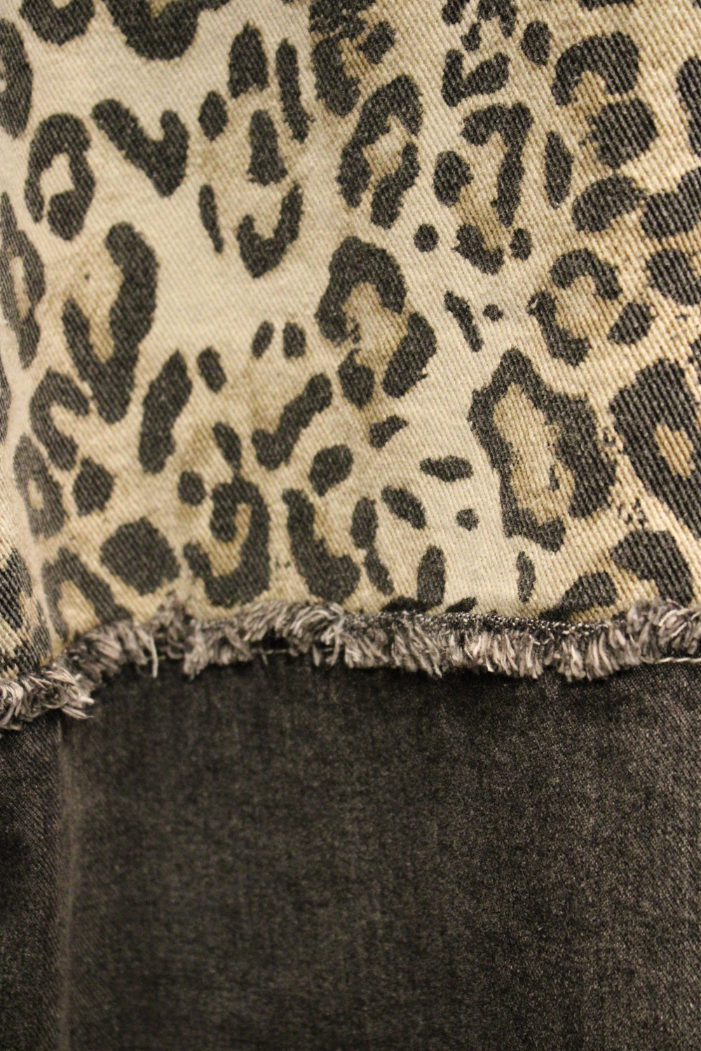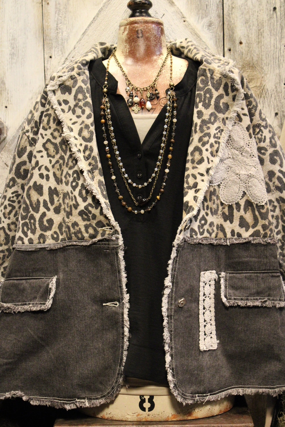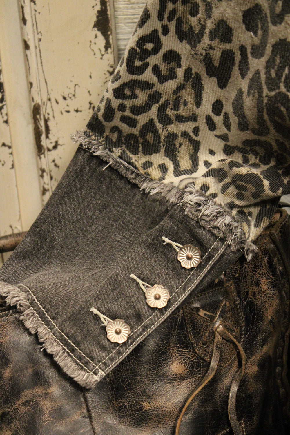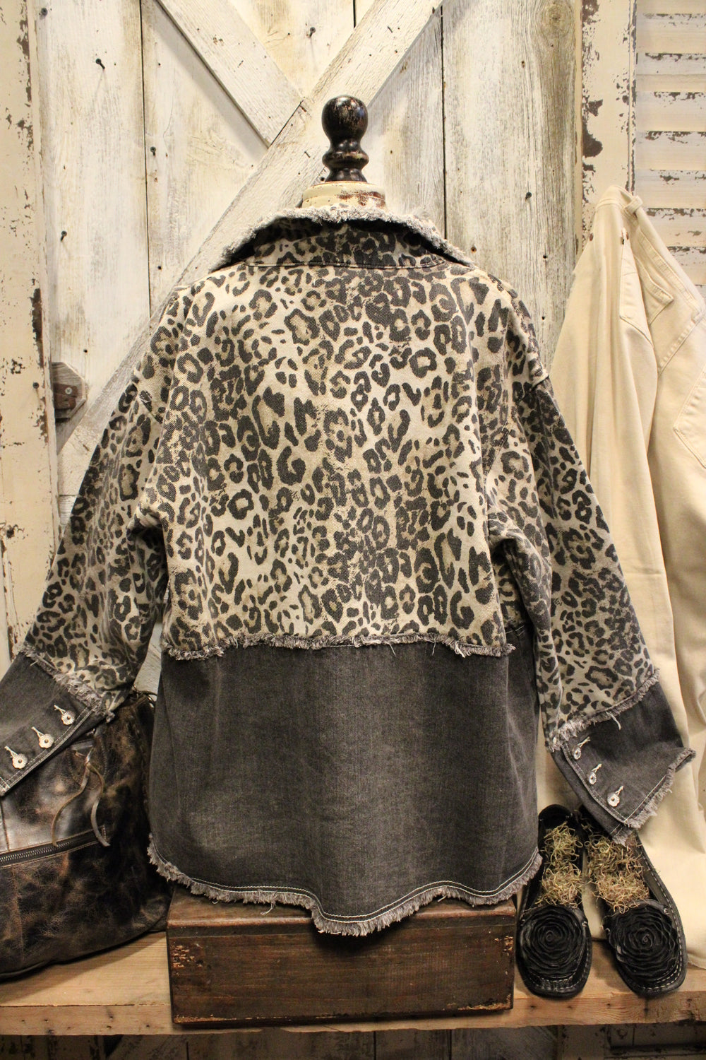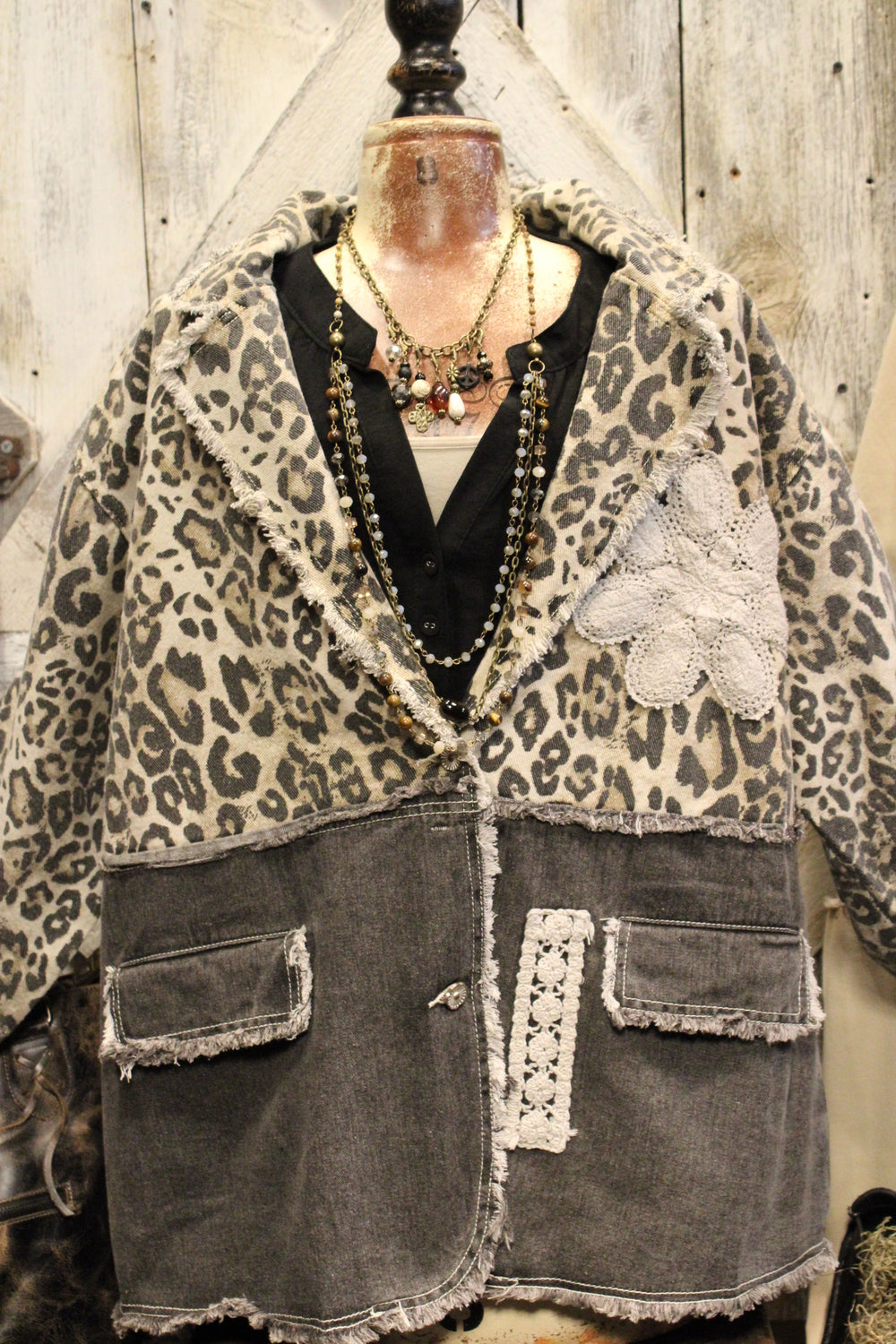 Introducing the Wild Thing Jean Jacket - a standout piece for the modern bohemian woman. Designed for curated wardrobes, this artisan-inspired jacket features a bold mix of distressed black denim, leopard jacquard, and delicate crochet lace detailing.