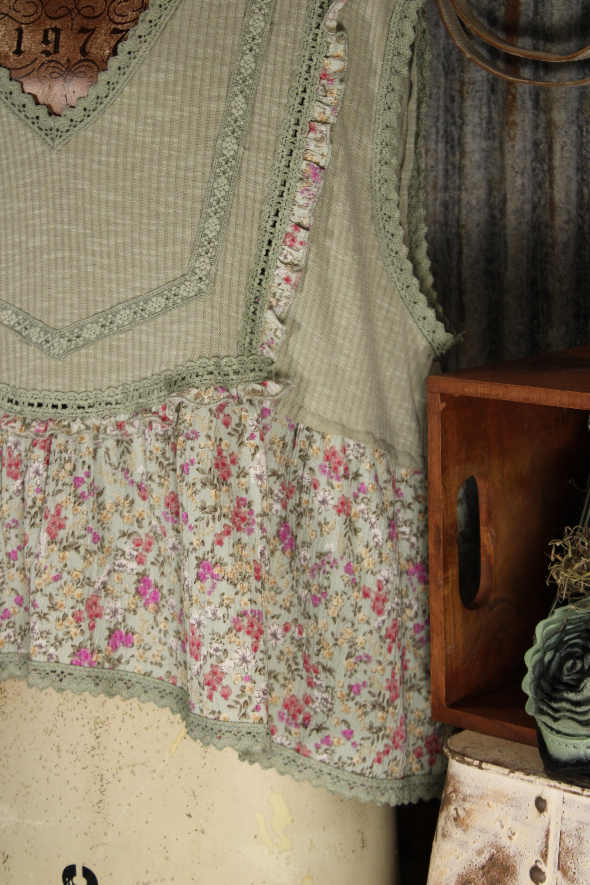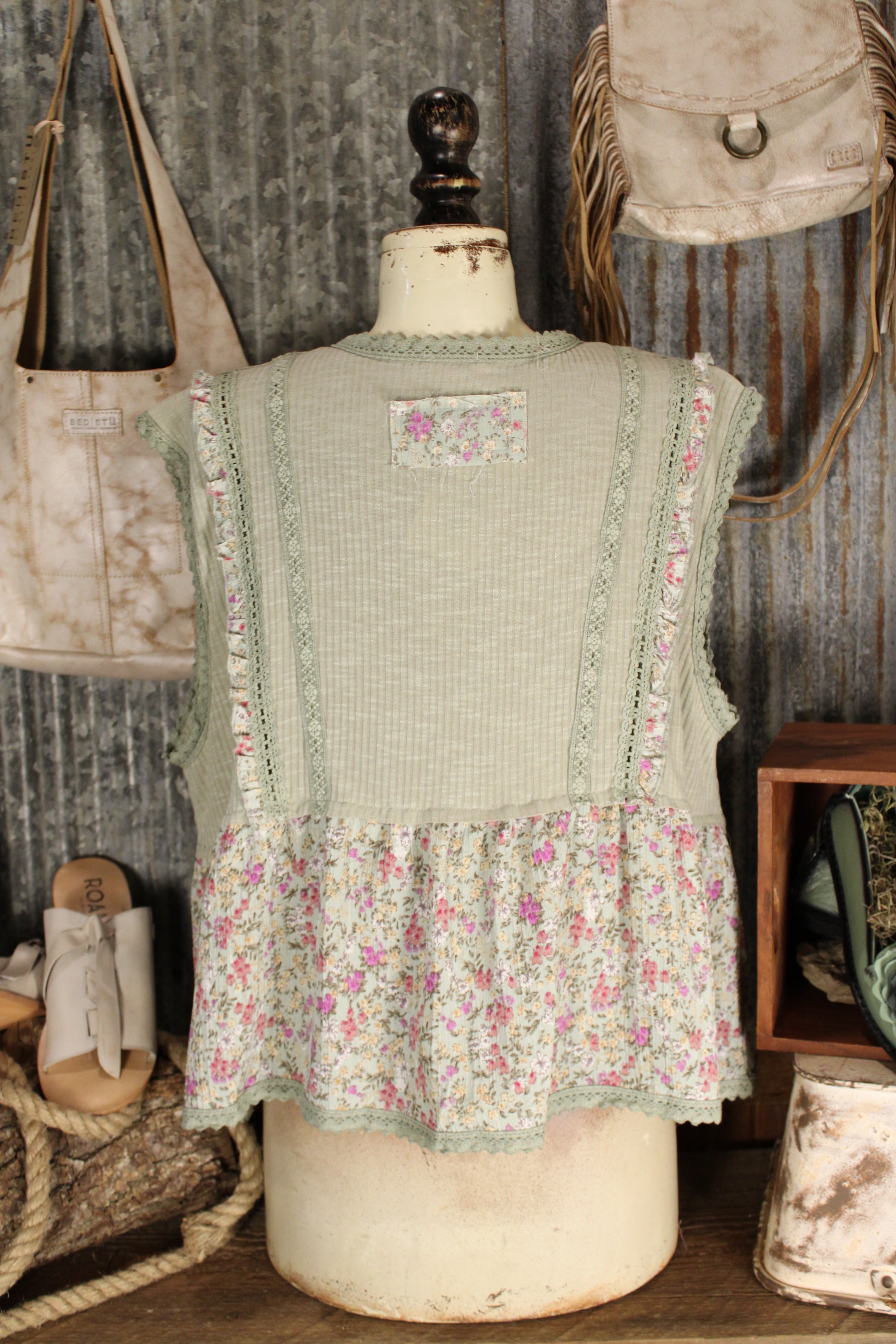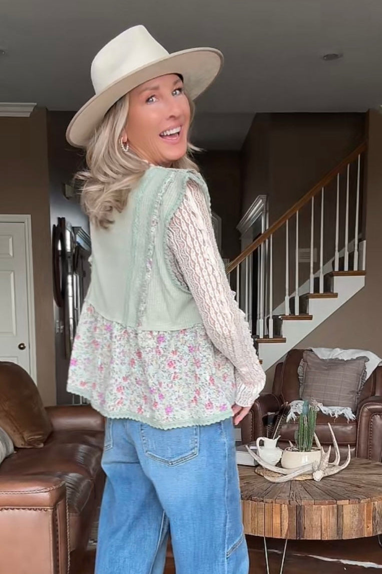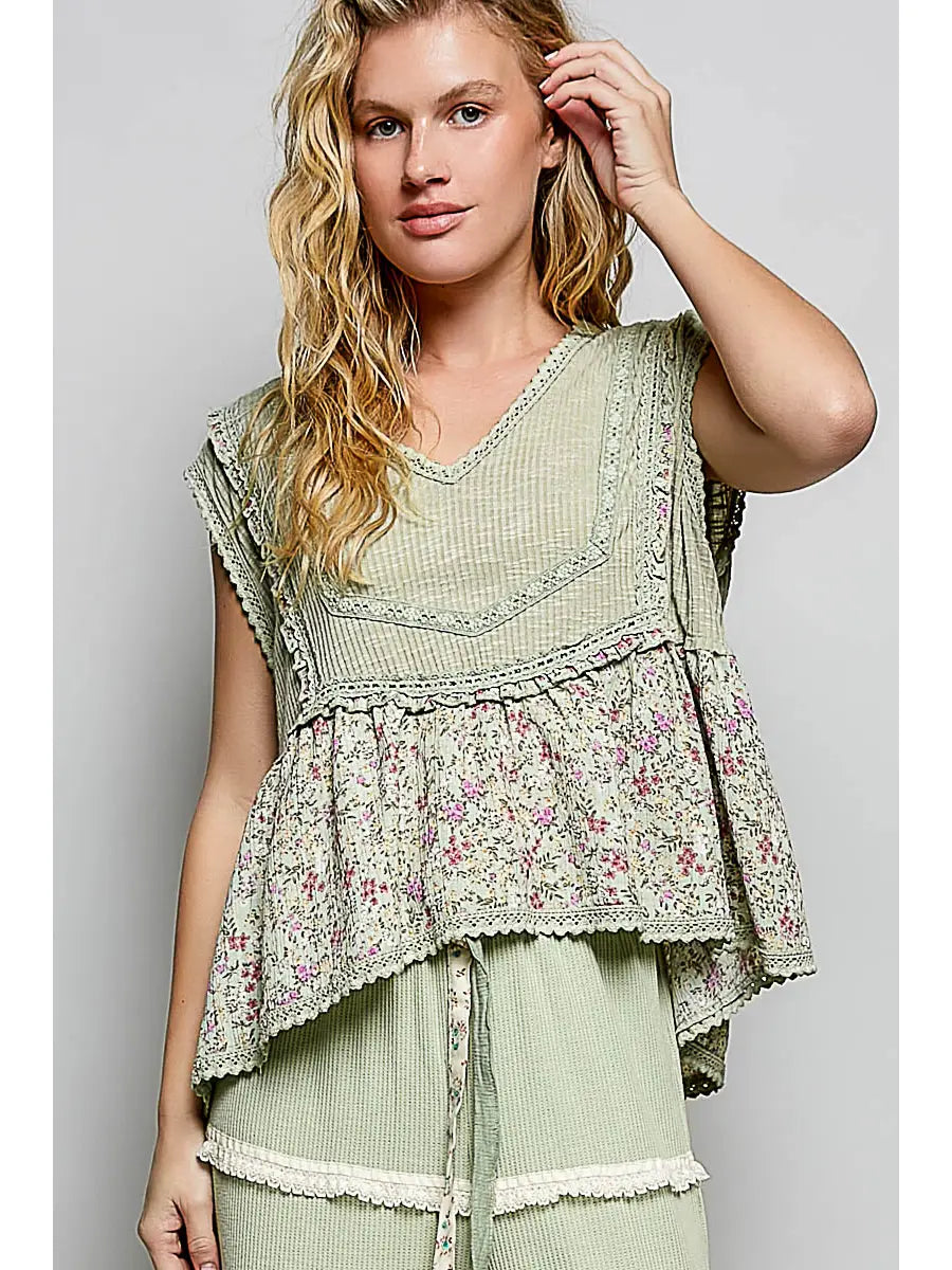 Introducing the whimsical Willow Garden Sage Tank- from POL Clothing! Embrace your bohemian spirit with this must-have top, featuring a flattering V-neck and sleeveless design. A soft mix of vintage florals and textured details gives this tank an easy, romantic feel. Designed with a flattering V neckline and delicate trim accents, it features a ribbed bodice paired with a flowy floral hem for a layered look without the bulk. The lightweight fabric drapes comfortably, making it perfect for warm days or for styling under cardigans and jackets. Feminine, airy, and full of cottage-inspired charm, this tank adds a sweet touch to any everyday outfit.
