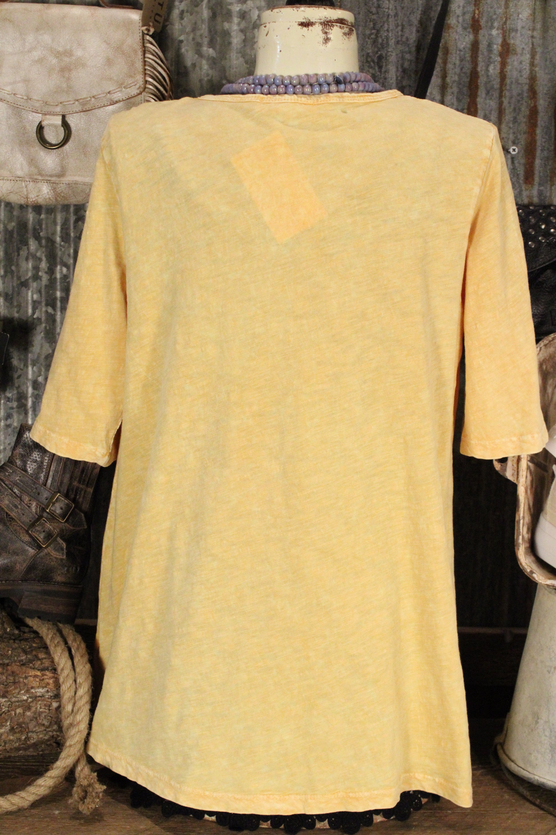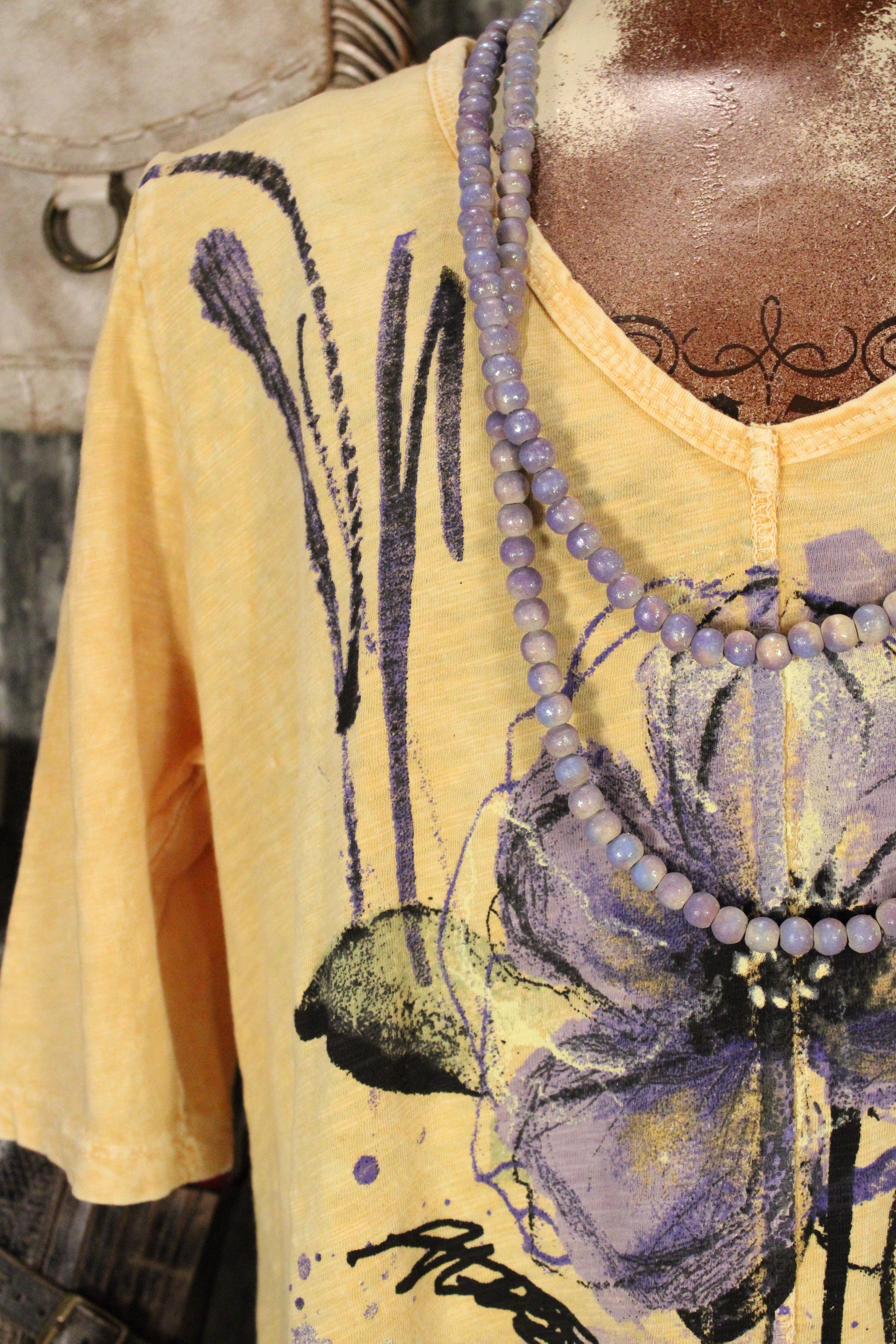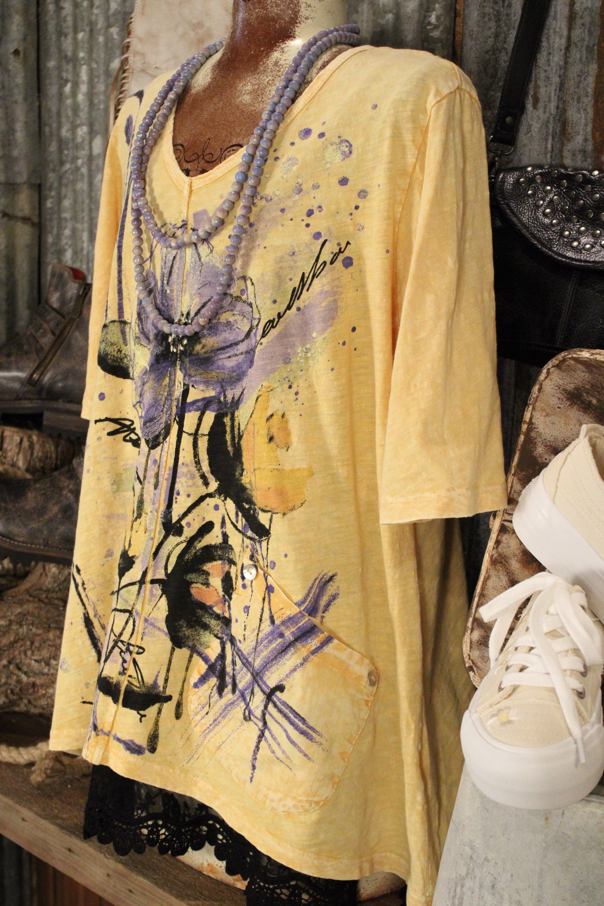 Introducing the Wind Flower Tunic-This artistic floral graphic tee adds a soft pop of color and effortless charm to your everyday look. Designed with a flattering V-neckline, relaxed fit, and lightweight feel, it’s perfect for easy layering or wearing on its own. The hand-painted–inspired floral print and soft yellow wash bring a fresh, feminine touch that pairs beautifully with denim, shorts, or skirts for laid-back, feel-good style.