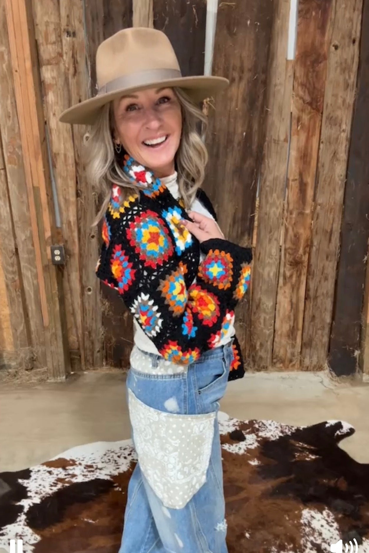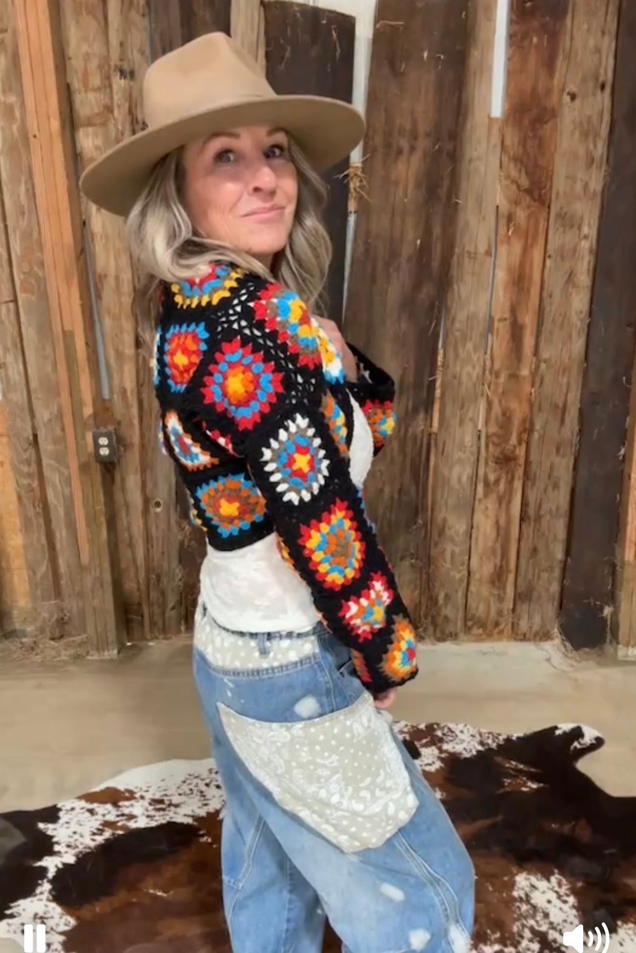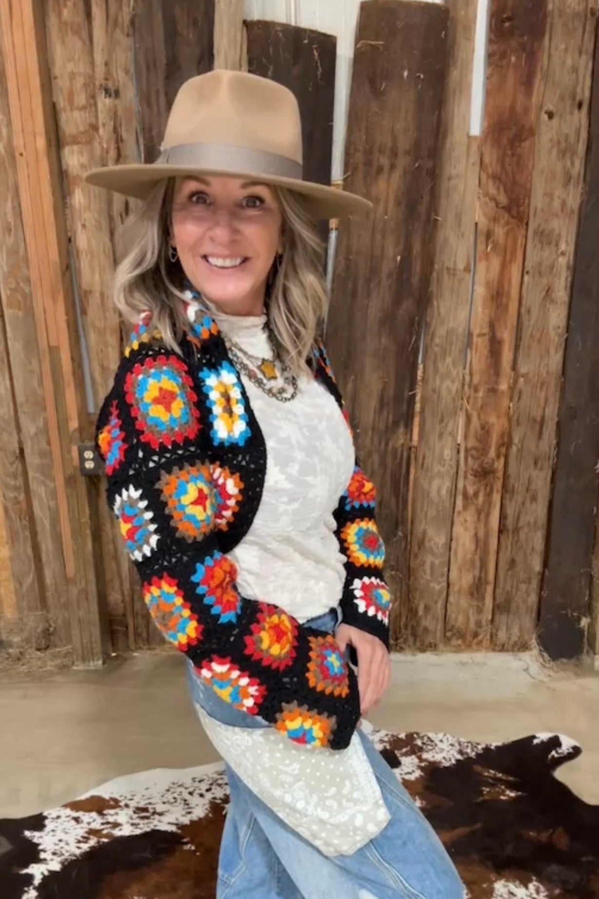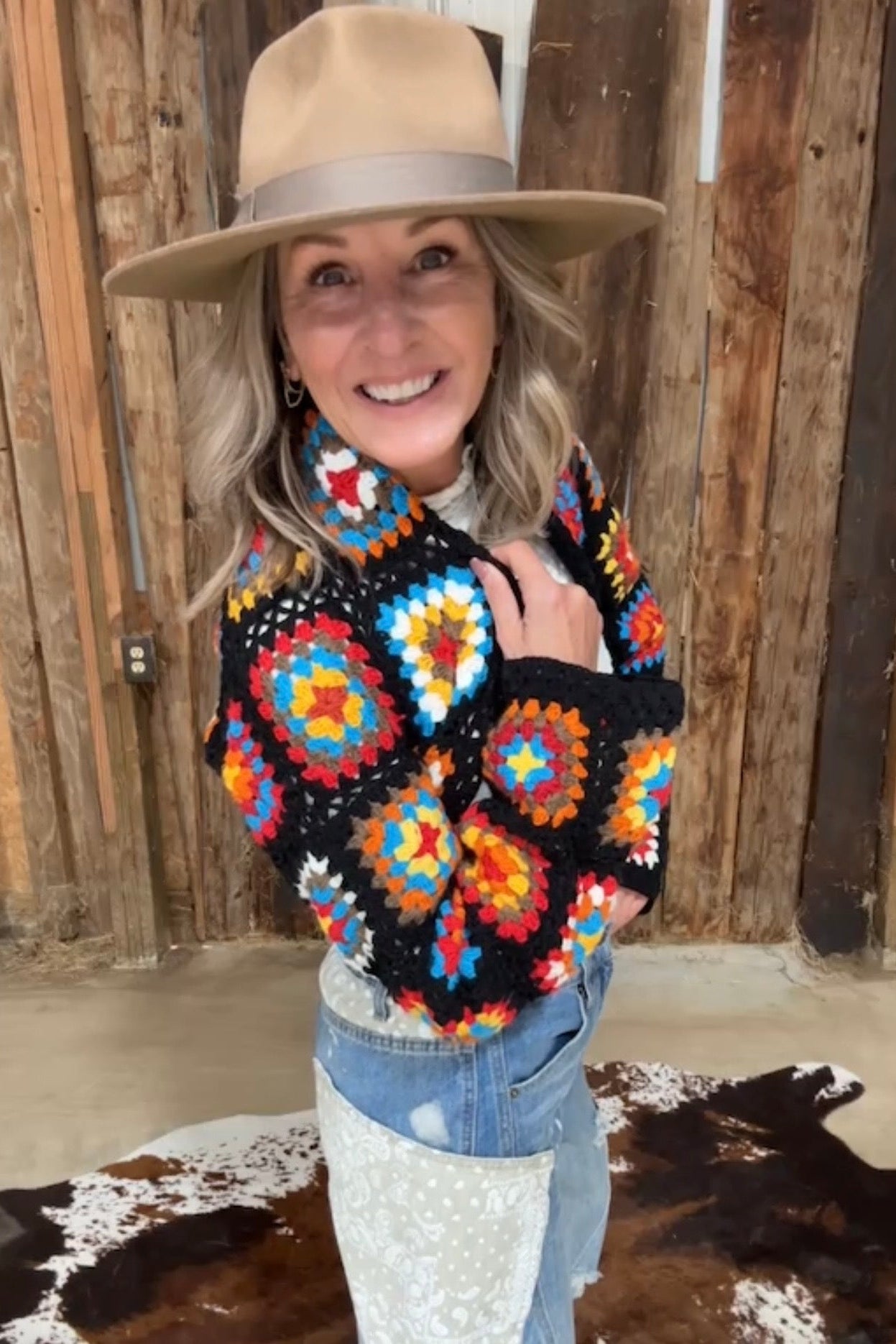 Introducing the With Style Bolero - A true throwback! This colorful crochet bolero brings vintage flair to modern-day farmgirl style. Each square pops with rich, cozy hues—reds, teals, golds, and creams—stitched together on a classic black base for that bold, retro-inspired look.