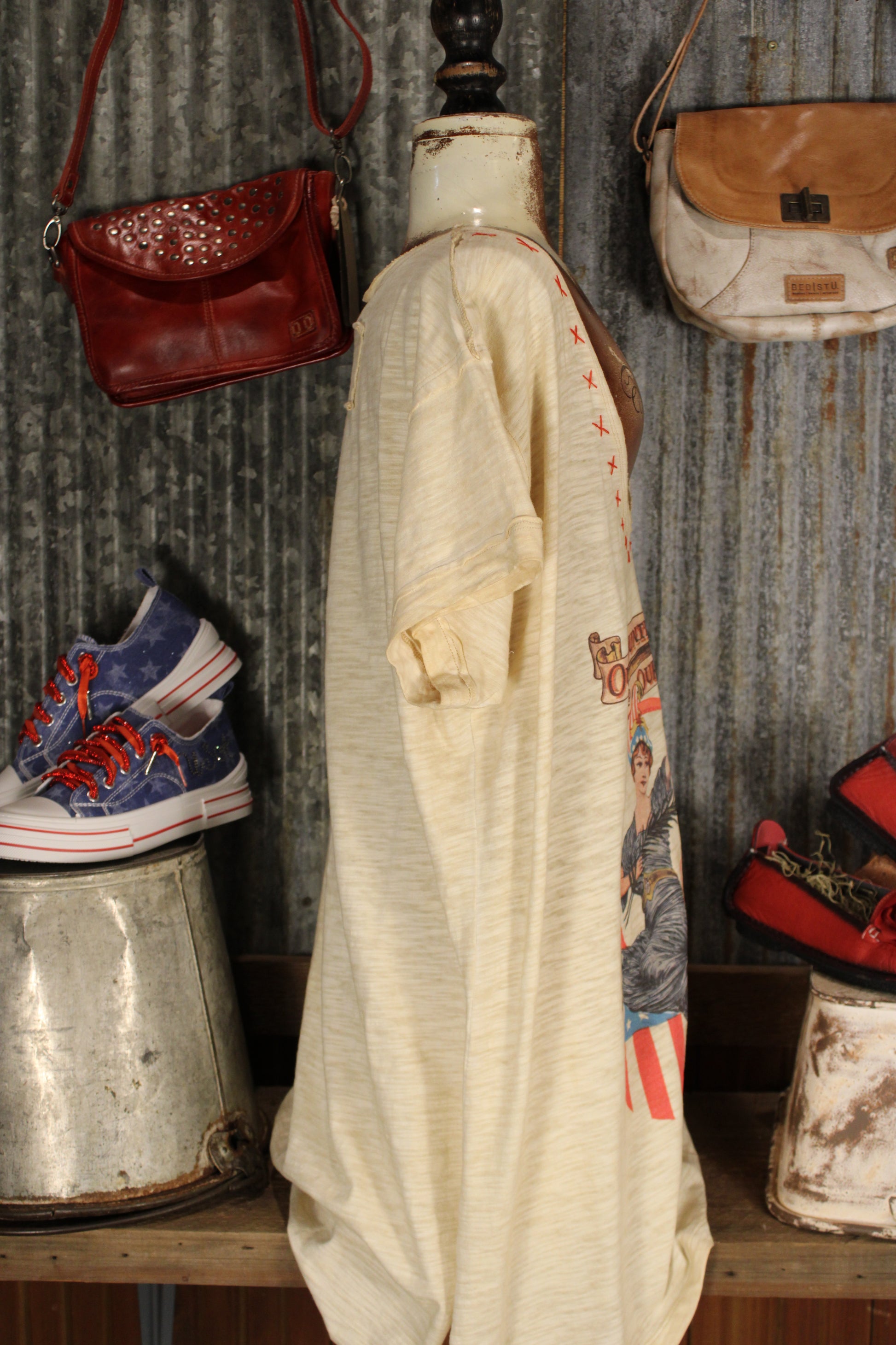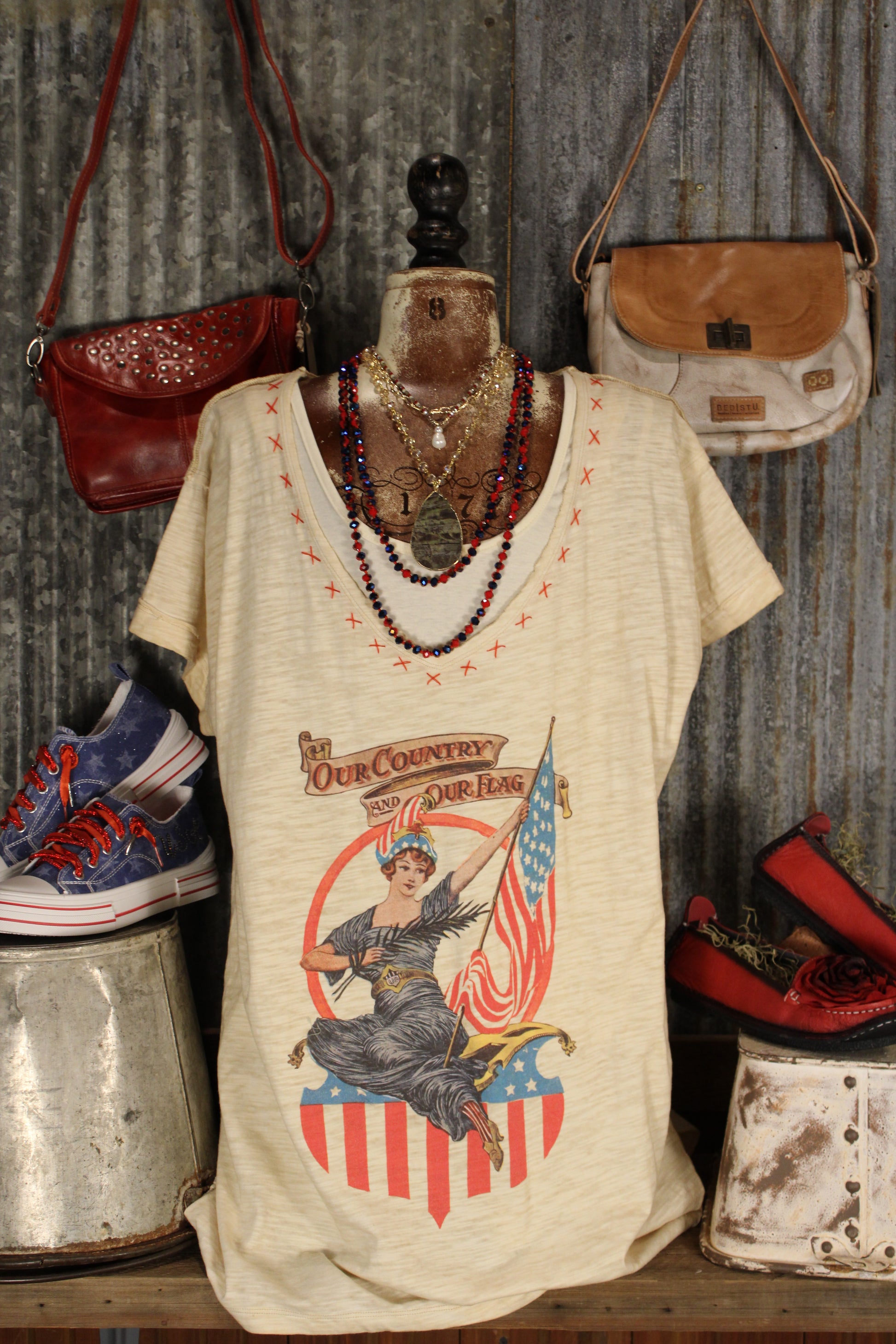 Introducing the Worn Glory Tunic by BlueVelvet, Show off your patriotic spirit in true Farm Girl style with this vintage-inspired graphic tee. Featuring a bold “Our Country and Our Flag” design with classic Americana artwork, this top brings timeless red, white, and blue charm to your everyday wardrobe.