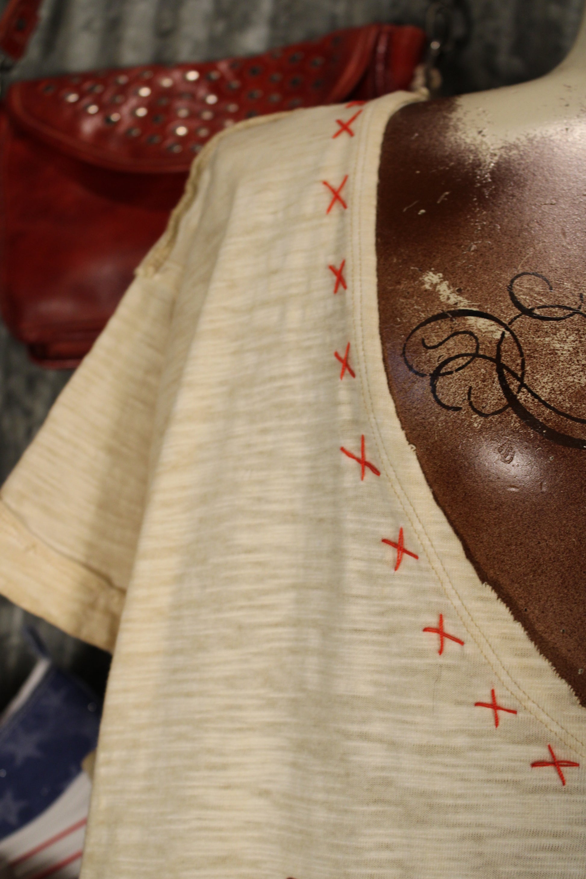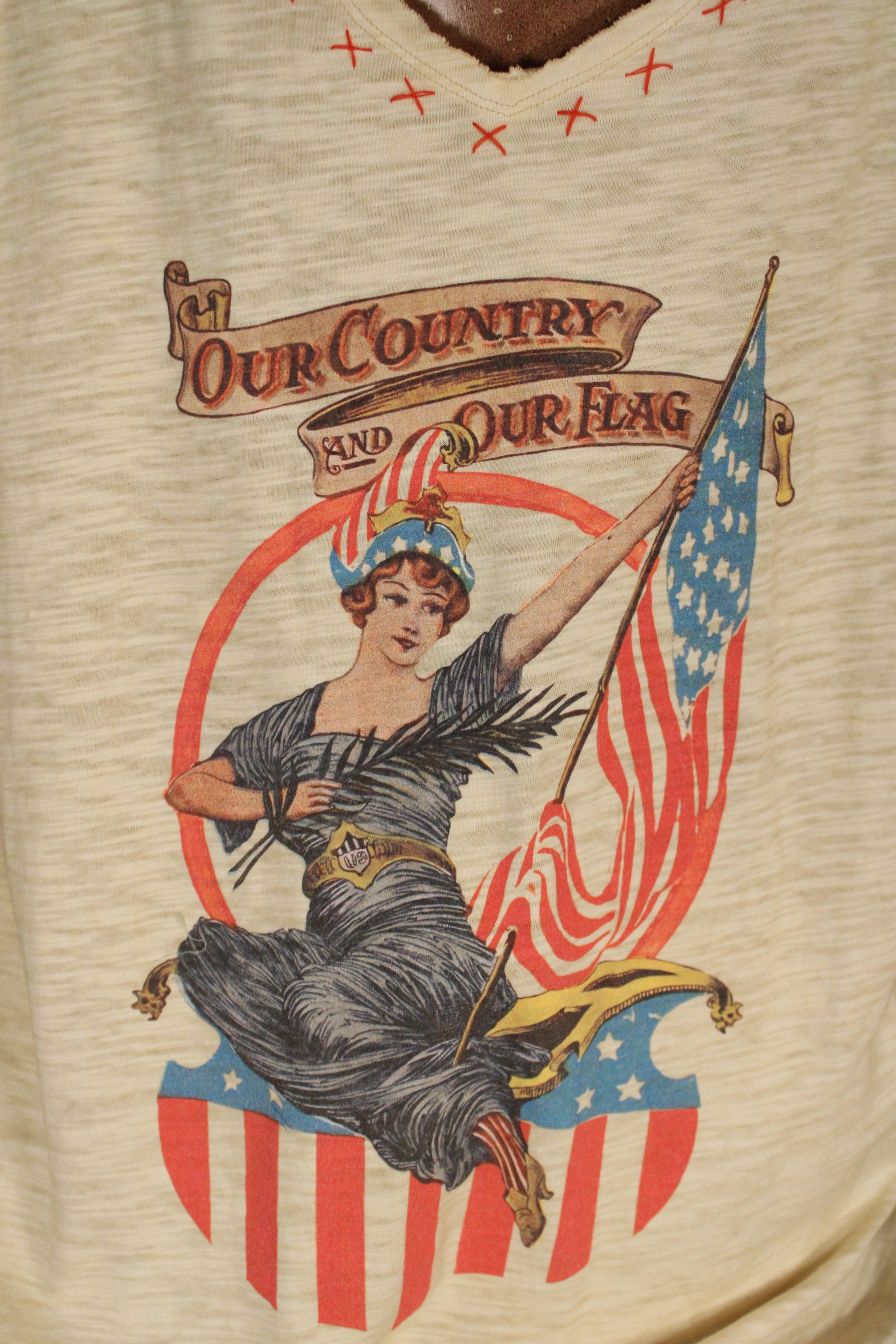 The soft neutral base pairs perfectly with denim, cutoffs, or layered under your favorite jacket, while the flattering V-neck with contrast stitch detail adds just the right touch of rustic character. Easy, comfortable, and full of old-school Americana vibes, this tee is perfect for summer celebrations, small-town parades, backyard BBQs, and all your star-spangled moments.
